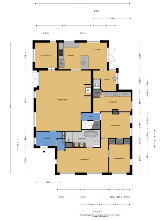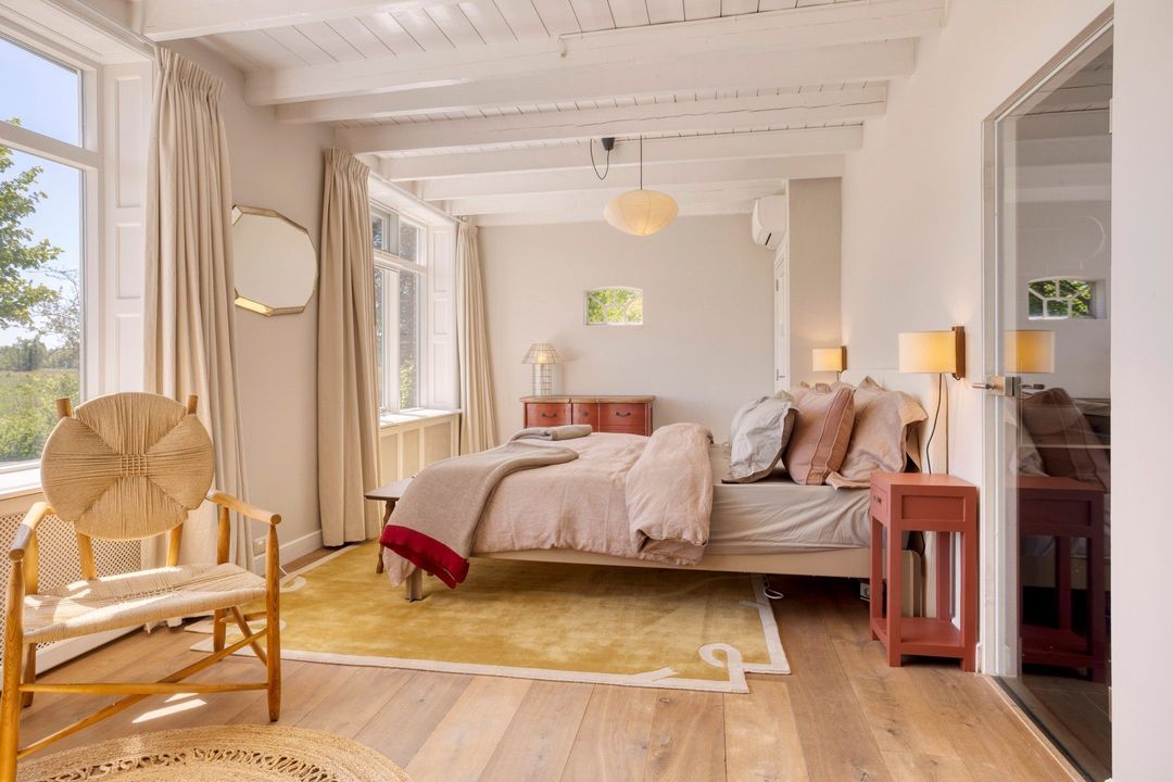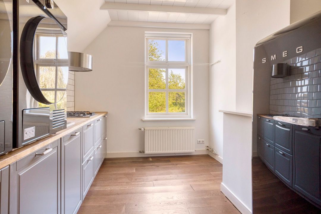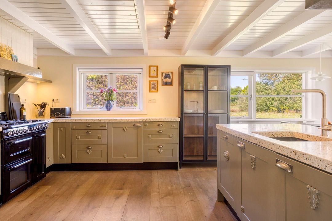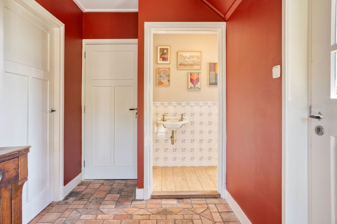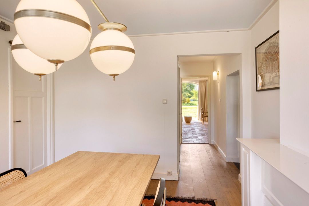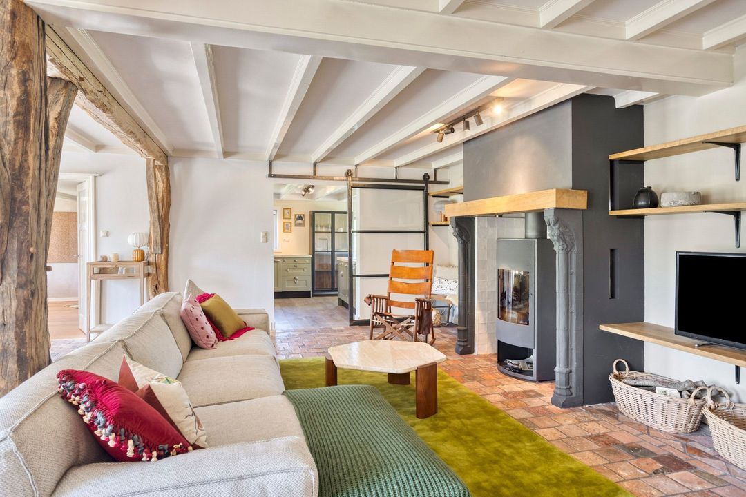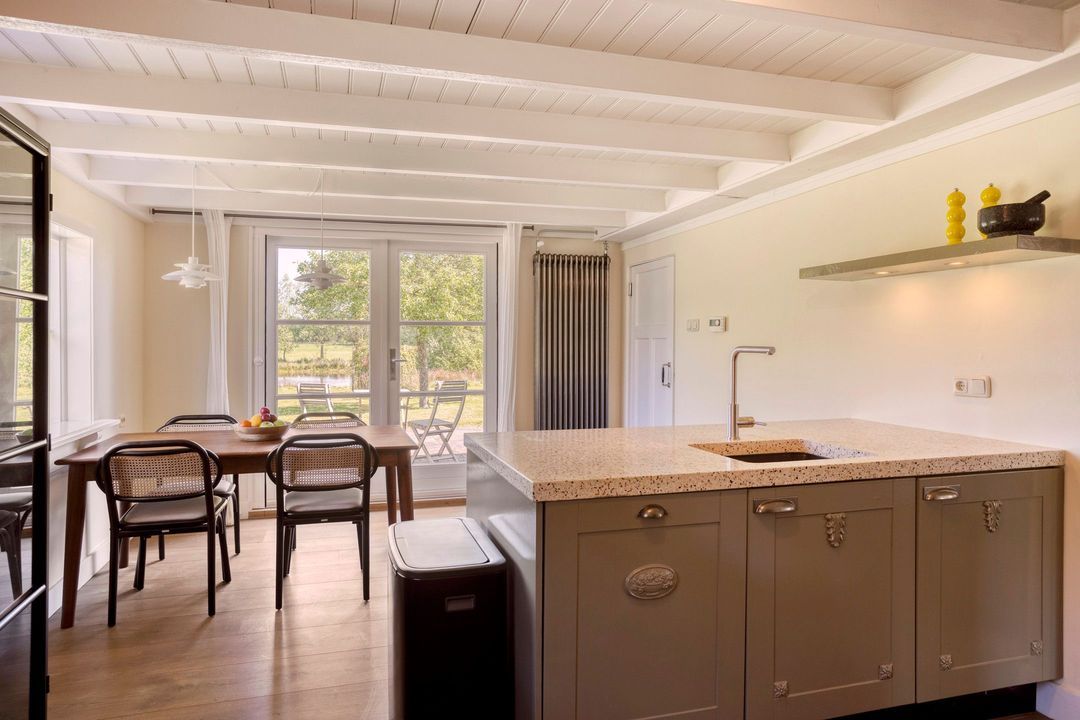 De woning biedt een warme en uitnodigende entree met hal en meterkast. De royale woonkamer ademt sfeer, met zichtbare originele gebinten, een estriken vloer met vloerverwarming, een sfeervolle schouw met houtkachel en openslaande deuren naar het zonnige terras op het zuiden. Aangrenzend vindt u een werkkamer en een ruime woonkeuken in landelijke stijl, voorzien van diverse inbouwapparatuur. Via de achteringang bereikt u een hal met toilet, een royale slaapkamer met airconditioning en een moderne badkamer met ligbad, inloopdouche, dubbele wastafel en toilet. Tevens zijn er een tweede slaapkamer (momenteel in gebruik als kledingruimte met kastenwand), een kantoorruimte en een praktische bijkeuken met keukenblok en aansluitingen voor wasapparatuur aanwezig.