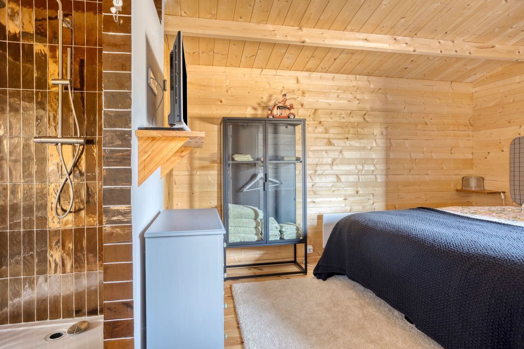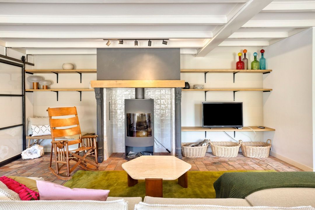 Deze multifunctionele ruimte omvat een garage/werkplaats, twee paardenstallen en een gastenverblijf dat ook uitstekend dienst kan doen als atelier of studio. Het gastenverblijf beschikt over een woonkamer met houtkachel, een afgescheiden slaapgedeelte, een keukentje, toilet en een inloopdouche met wastafel.