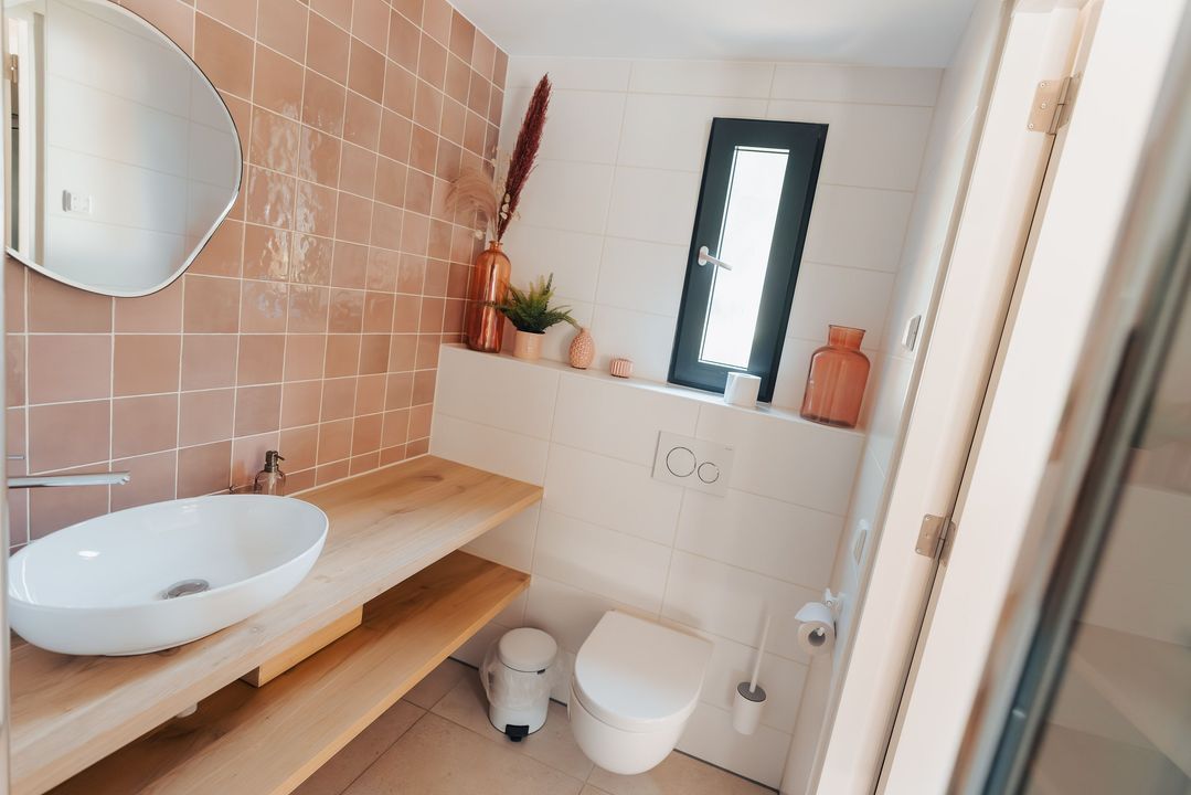 • Badkamer met douche, wastafel en hangend toilet