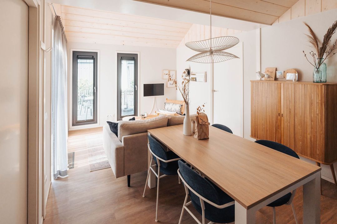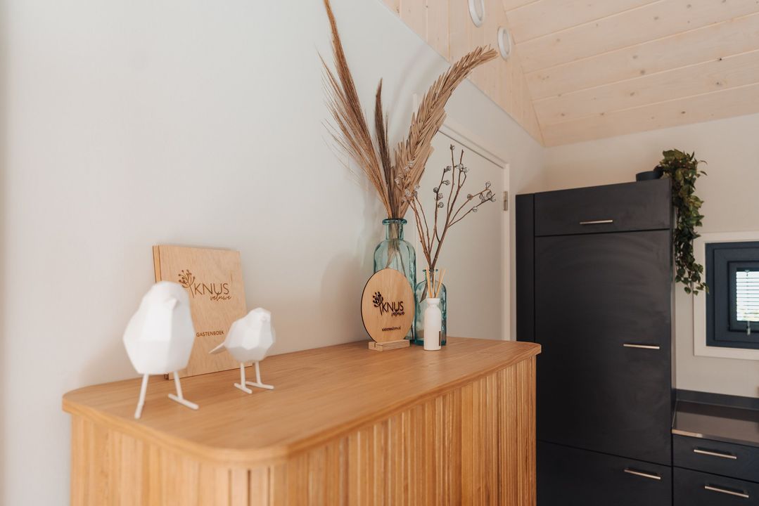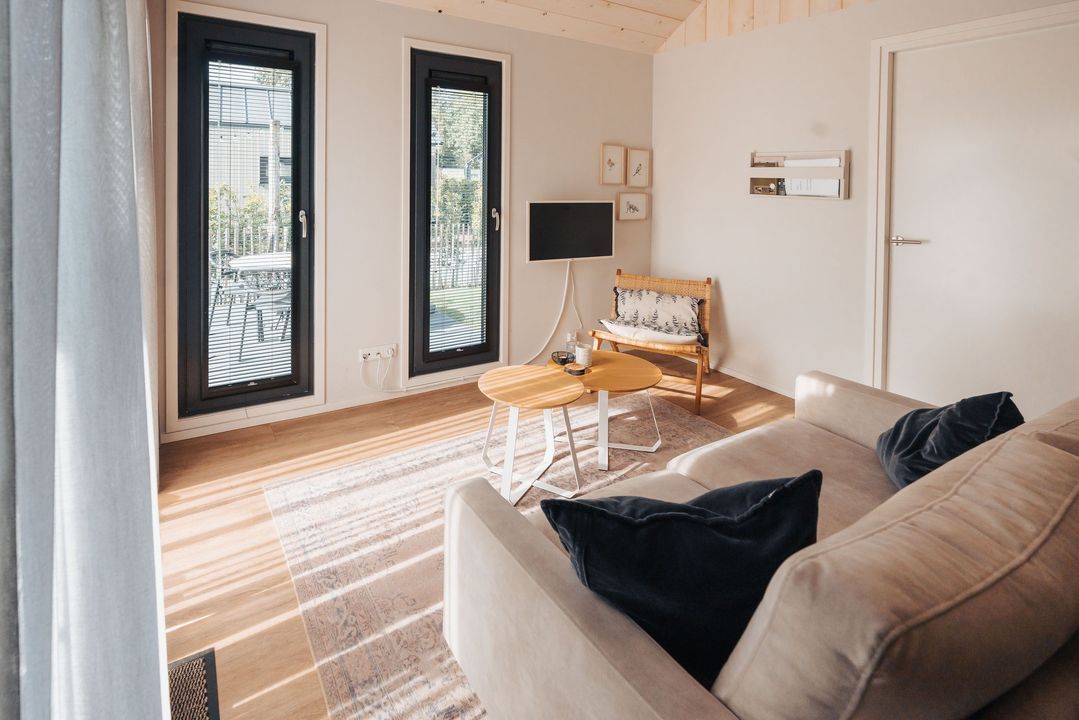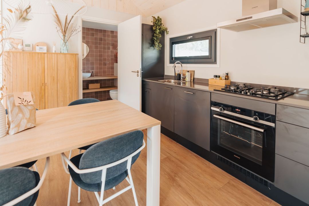 Het hele huis is voorzien van een warme houtlook vloer en comfortabele vloerverwarming, waardoor dit tiny house ook in de winter zeer prettig te verblijven is.