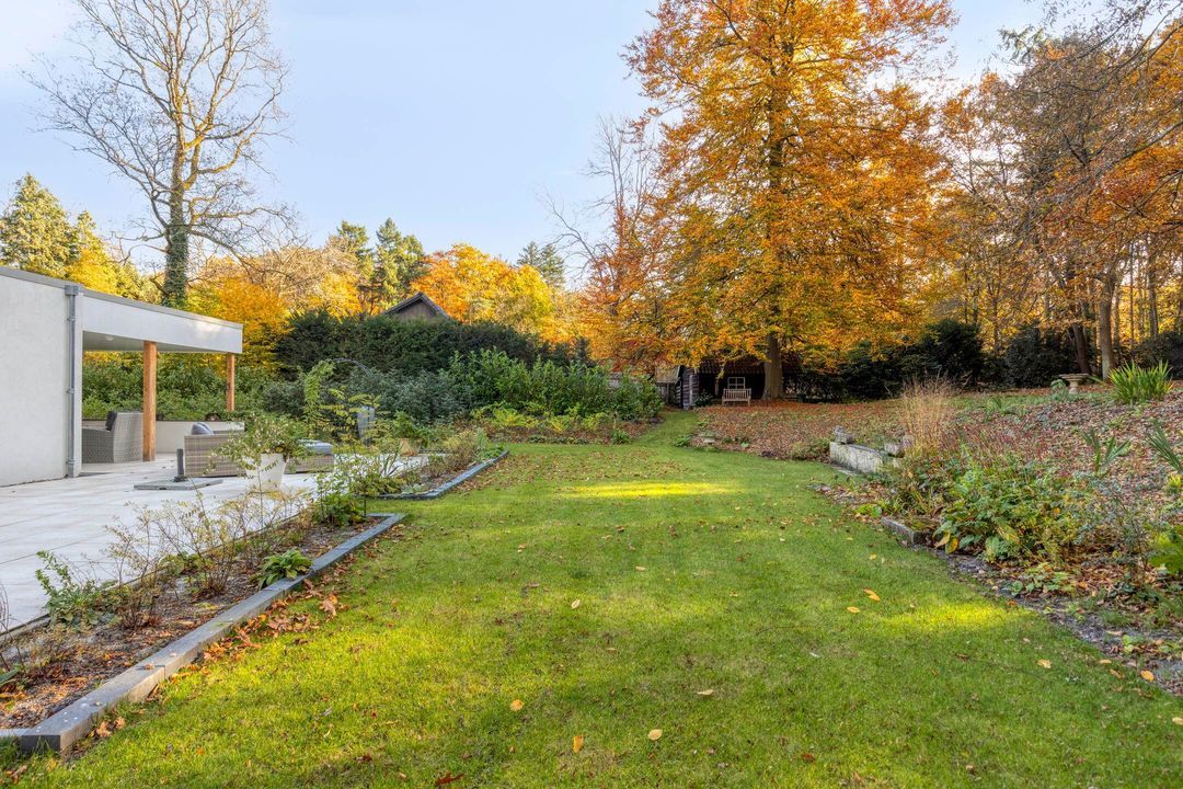 De tuin rondom is recent volledig opnieuw aangelegd en biedt diverse terrassen, een veranda, een fraaie oprijlaan en een vrijstaande houten schuur (toegankelijk via de tuin of via de achteringang aan de Oranje Nassaulaan). De tuin is volledig omheind en biedt optimale privacy.