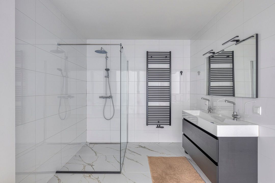 De verdieping beschikt over een ruime overloop met vaste kastenwand, vier royale slaapkamers, allemaal voorzien van inbouwkasten en een gezamenlijk balkon met prachtig uitzicht over de tuin. De tweede badkamer is volledig betegeld en uitgerust met wastafel, toilet en inloopdouche.