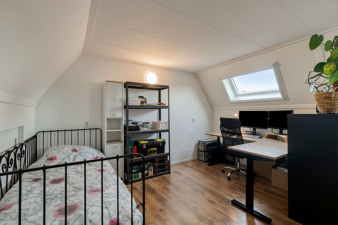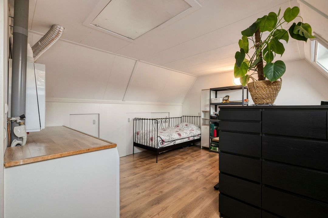 De ruimte zet zich voort op de tweede verdieping, waar zich de aansluitingen voor de wasmachine en de opstelling van de cv-ketel bevinden. Momenteel wordt deze verdieping gebruikt als vierde slaapkamer, maar de ruimte is ook uitstekend geschikt als hobbyruimte, kantoor of speelkamer. Dankzij de twee dakramen is er prettig daglicht en voor extra bergruimte is er een handige vliering, eenvoudig bereikbaar via een vlizotrap.