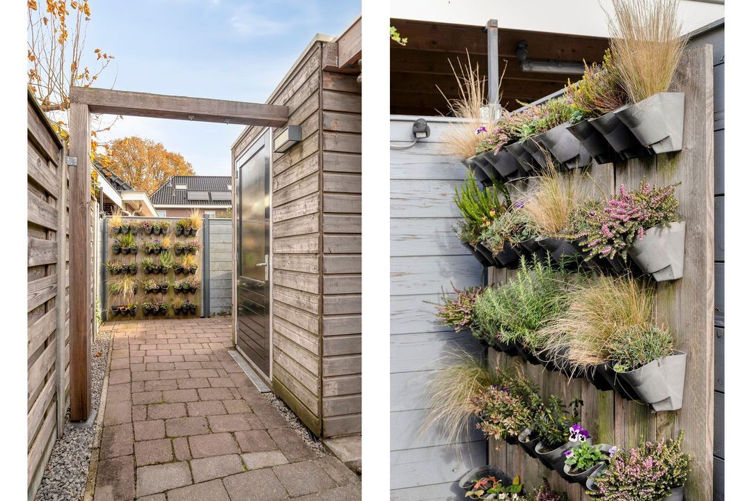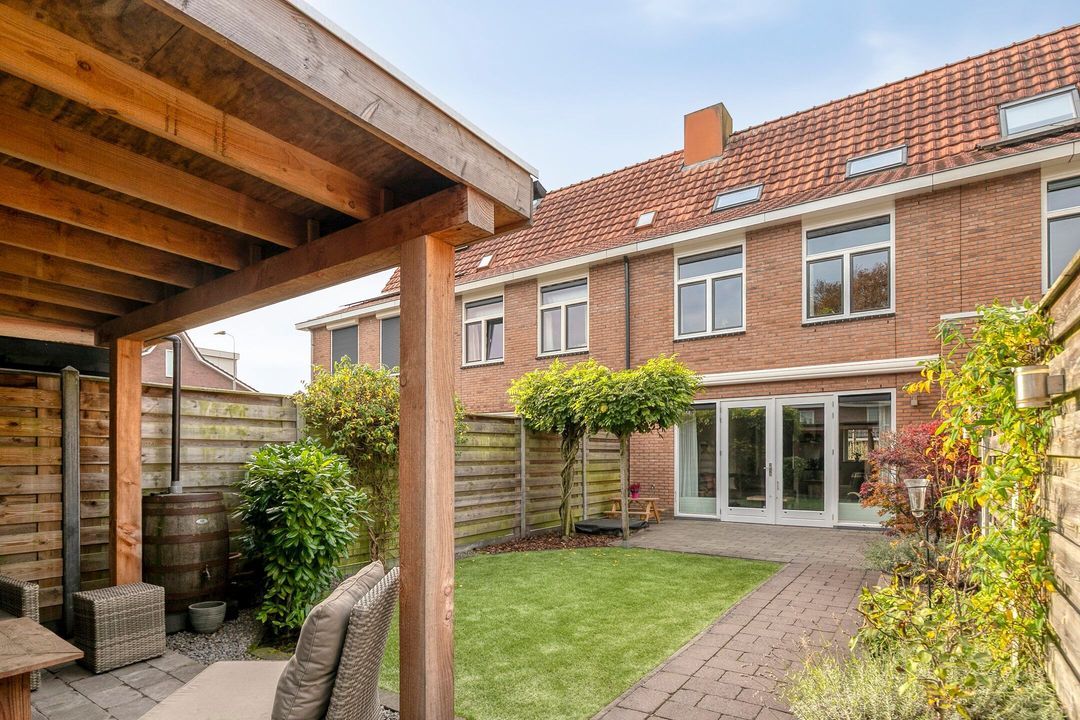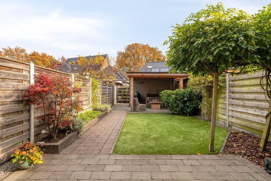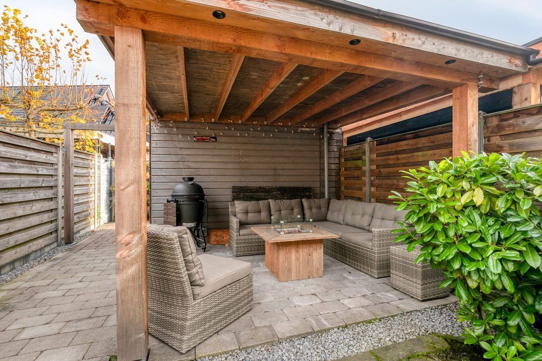 De tuin van deze woning ligt op het oosten en is met een diepte van maar liefst 15 meter een waar verlengstuk van het huis. Diverse terrassen bieden altijd een fijne plek om van de zon te genieten of juist van de schaduw. Vanuit de woning leiden openslaande deuren direct naar het terras, waar een elektrisch zonnescherm extra comfort biedt op zonnige dagen. De overkapping nodigt uit om ook bij minder goed weer buiten te zitten, terwijl de ruime berging met achterom praktische ruimte biedt voor fietsen, tuinspullen of andere opslagbehoeften. De tuin is fraai aangelegd en biedt volop mogelijkheden voor ontspanning, gezellig samenzijn of een borrel met familie en vrienden. Aan de voorzijde van de woning is bovendien de mogelijkheid om een gezellig bankje te plaatsen en te genieten van de avondzon.