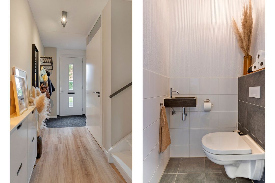 Bij binnenkomst treedt u binnen in een royale, lichte hal met een modern toilet, ruimte voor de garderobe en de meterkast. Via de fraaie deur komt u in de woonkamer, waar direct de ruimtelijke indeling en prettige lichtinval opvallen. Dankzij de uitbouw over de volle breedte (2,40 m) is hier een royale, open leefruimte ontstaan die uitnodigt tot samenkomen en ontspannen. De moderne pvc-vloer en hoogwaardige afwerking geven de woning een strakke en verzorgde uitstraling, terwijl de gehele begane grond voorzien van vloerverwarming een aangename warmte en optimaal wooncomfort biedt.