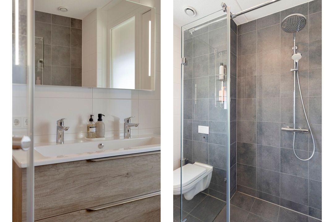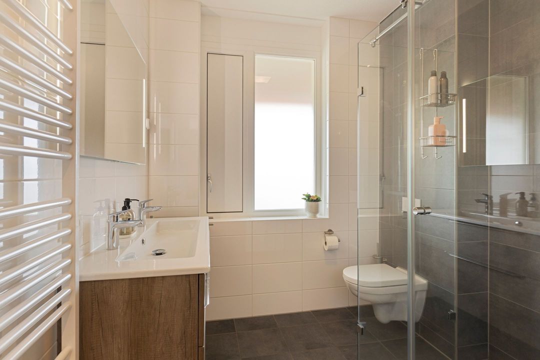 Op de eerste verdieping bevinden zich drie comfortabele slaapkamers, allen met een fijne lichtinval en een verzorgde afwerking. De moderne badkamer is voorzien van een wastafelmeubel, ruime douche en toilet, en is bovendien uitgerust met vloerverwarming voor extra comfort. Zo biedt deze verdieping volop mogelijkheden om de woning aan te passen aan uw eigen woonwensen.