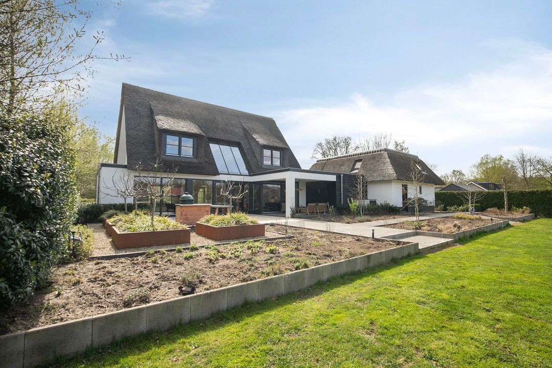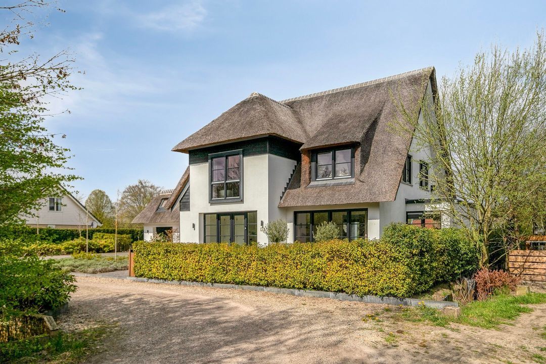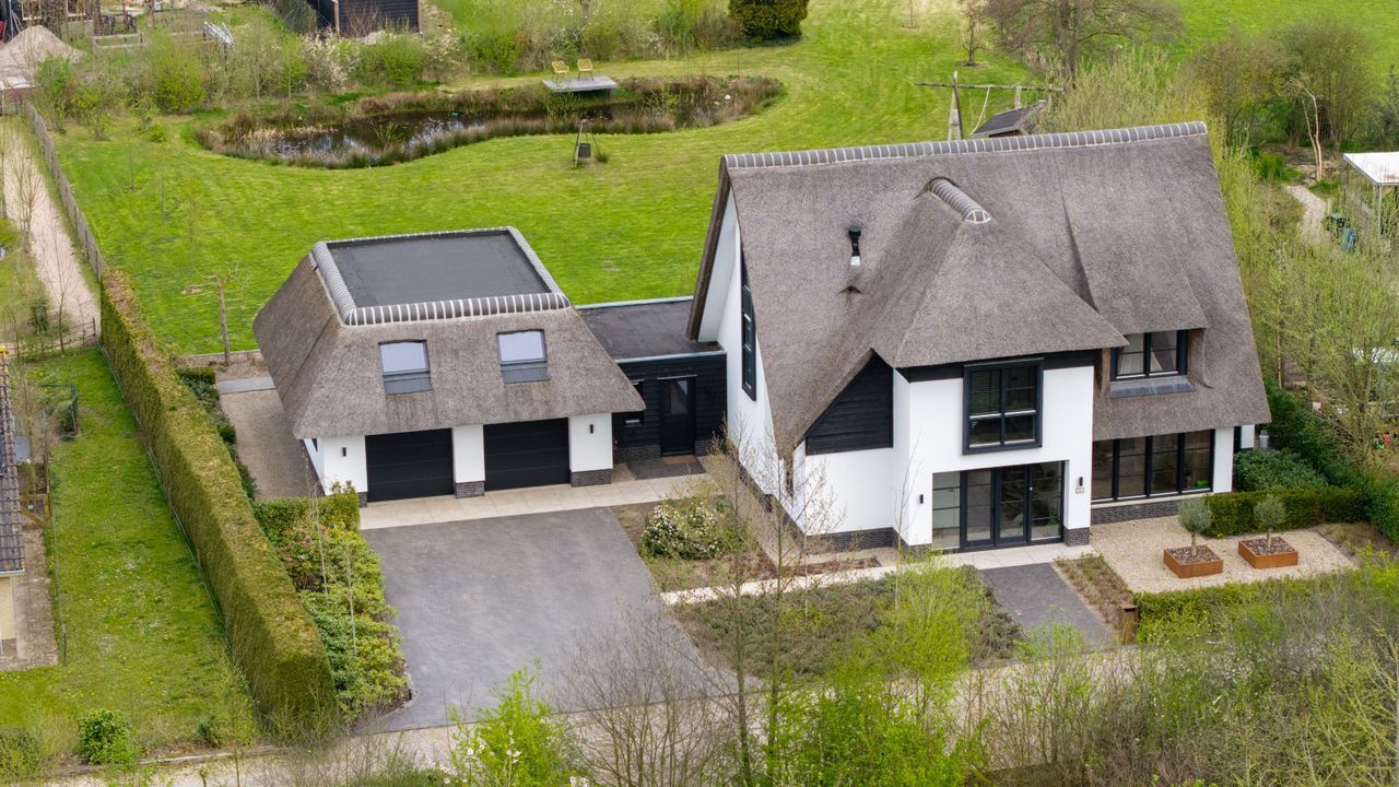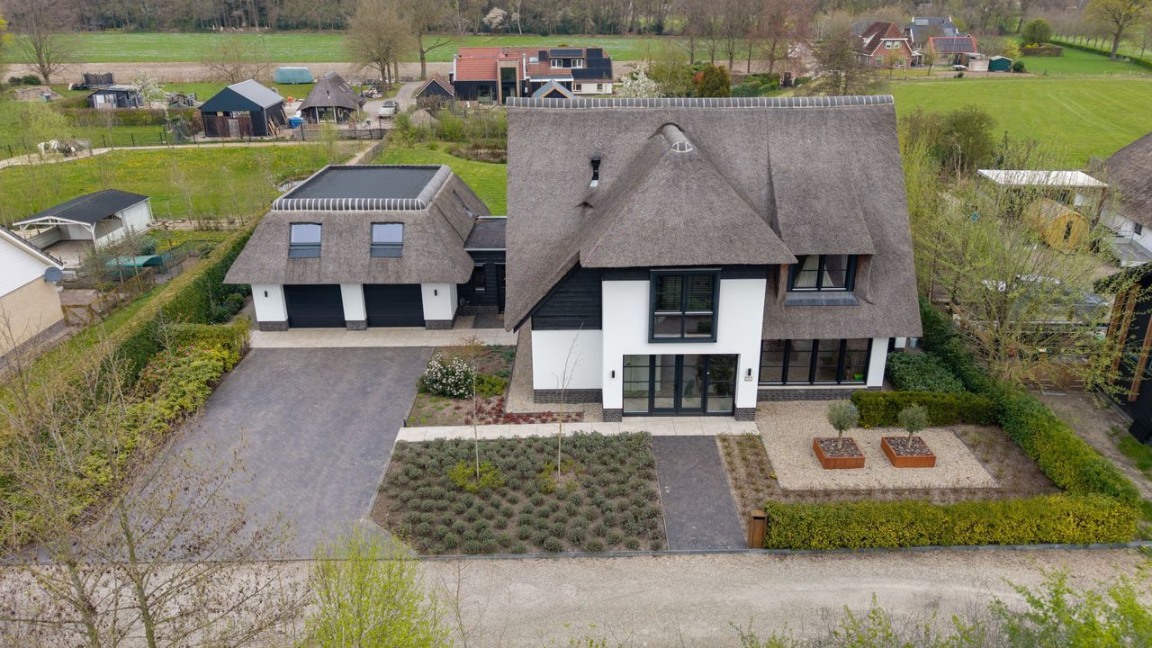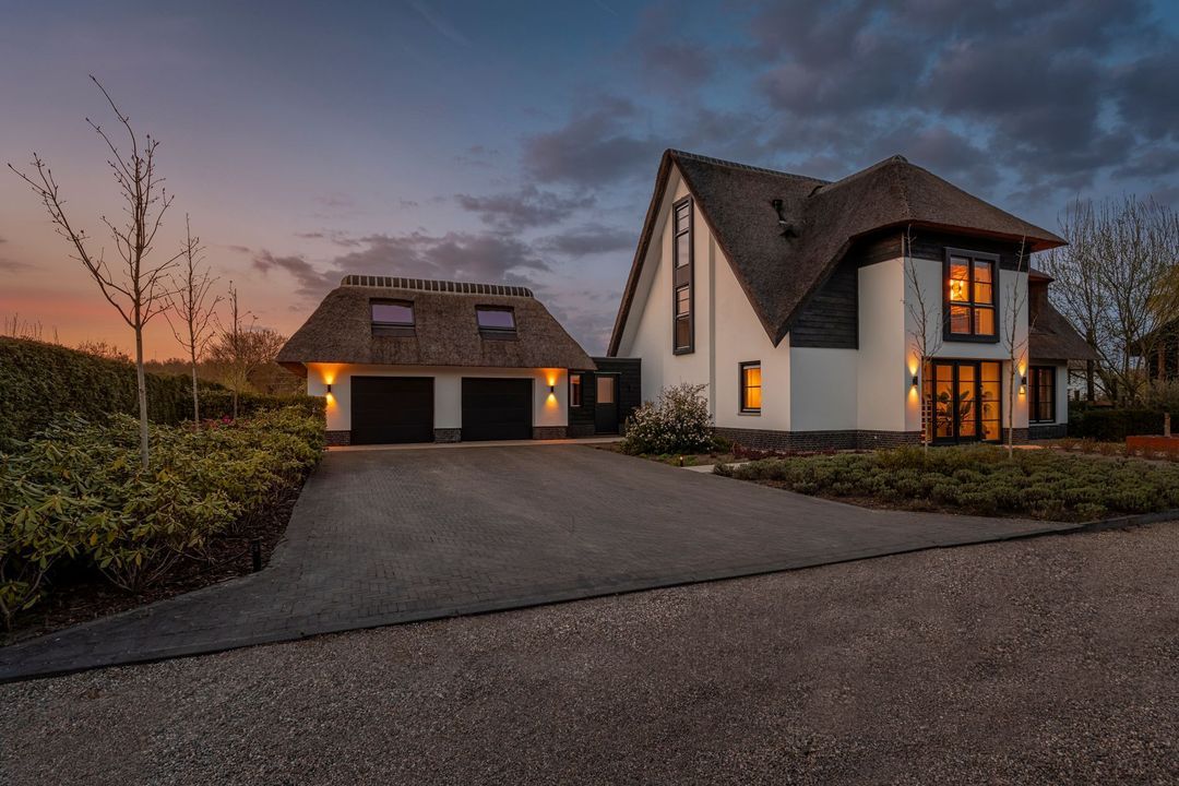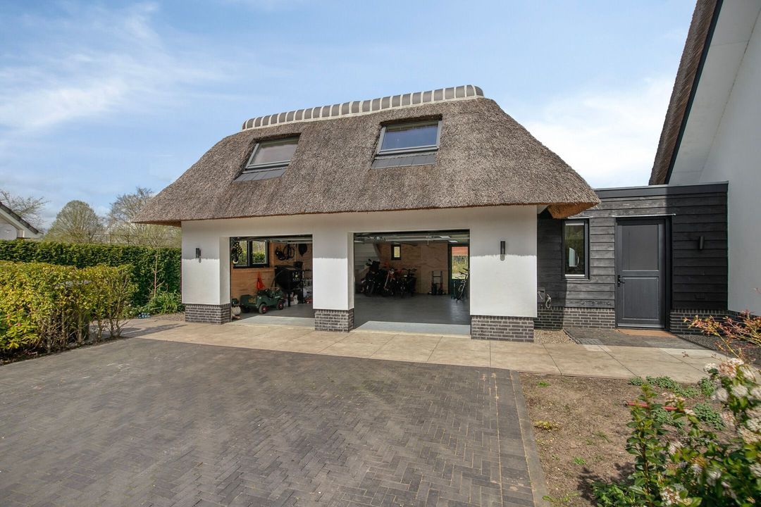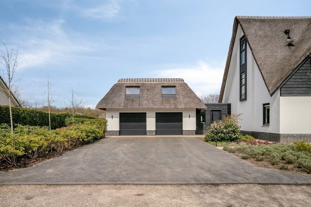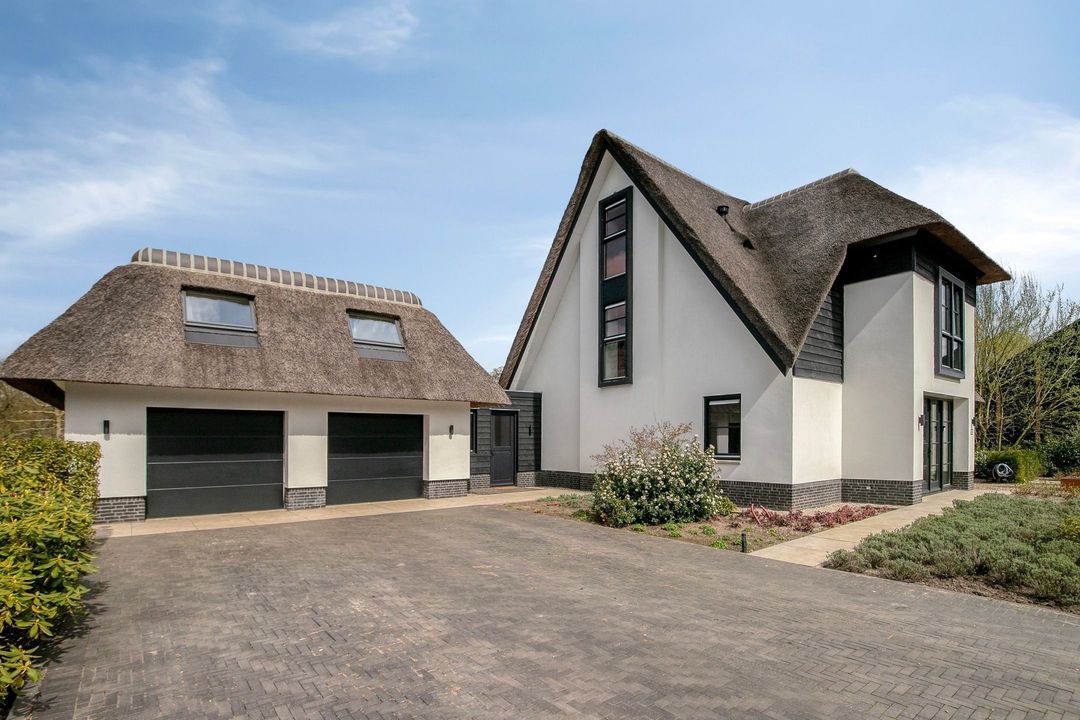 De rietgedekte Villa maakt direct indruk met haar statige uitstraling en beschikt bovendien over een ruime, volledig geïsoleerde dubbele garage met elektrisch bedienbare deuren.