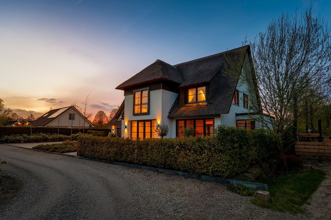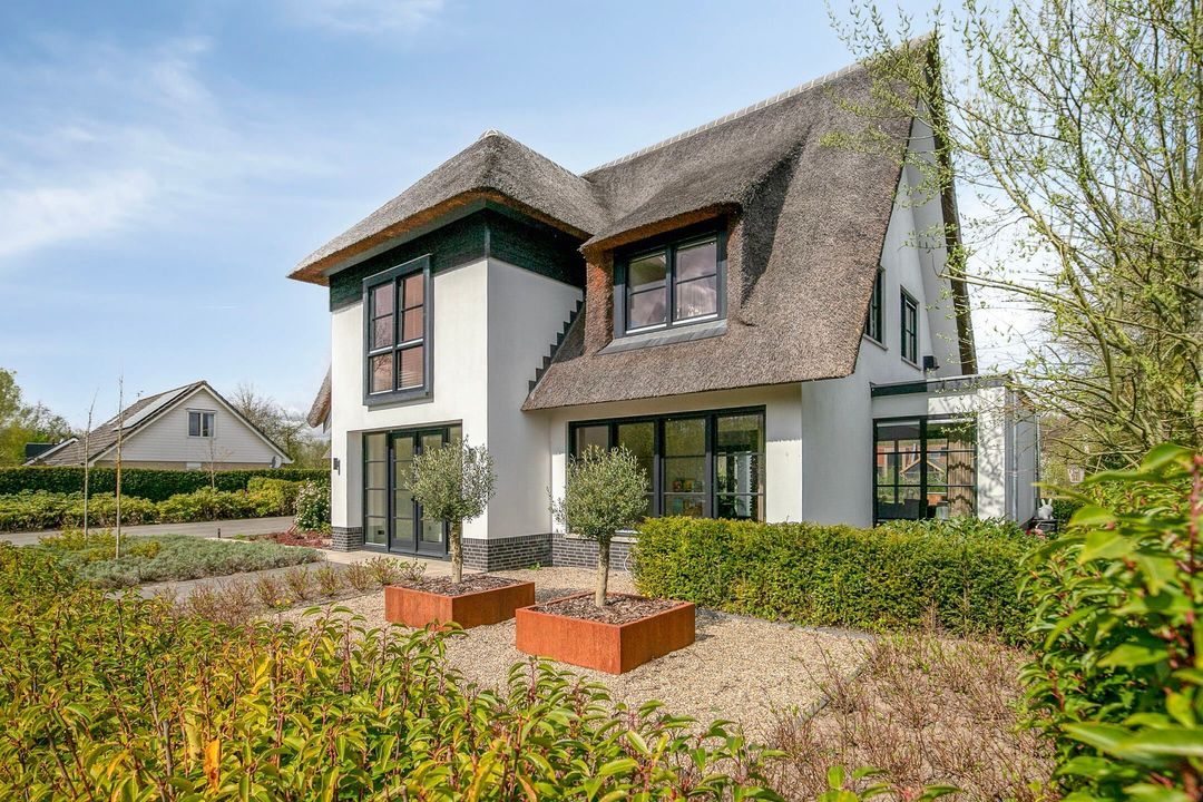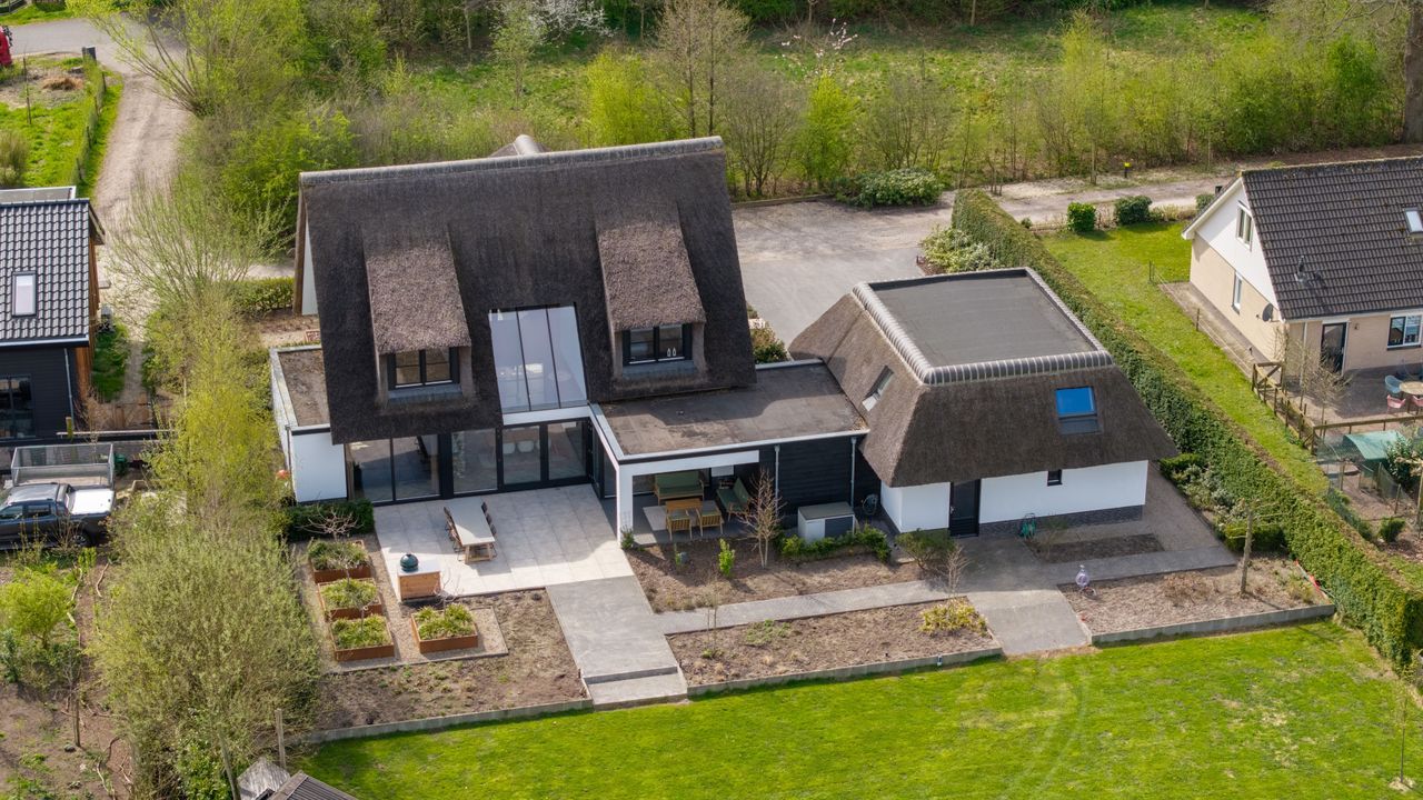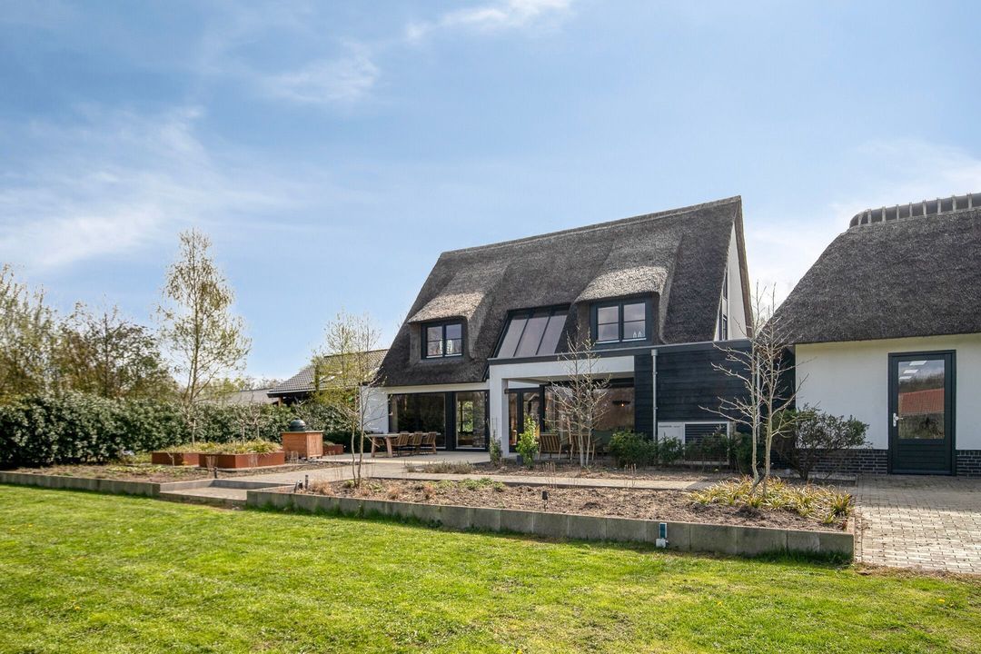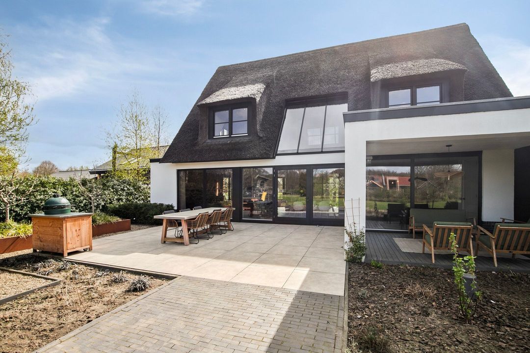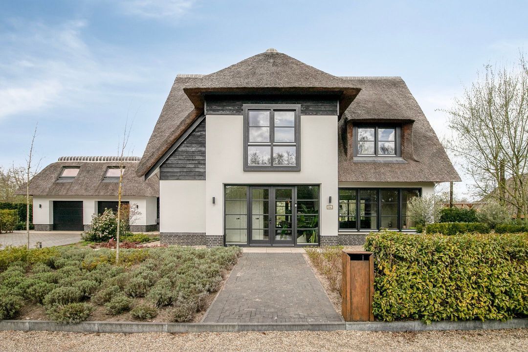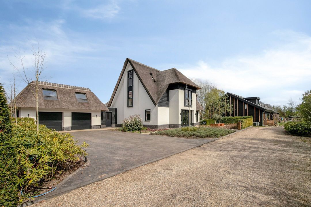 De rietgedekte Villa maakt direct indruk met haar statige uitstraling en beschikt bovendien over een ruime, volledig geïsoleerde dubbele garage met elektrisch bedienbare deuren.