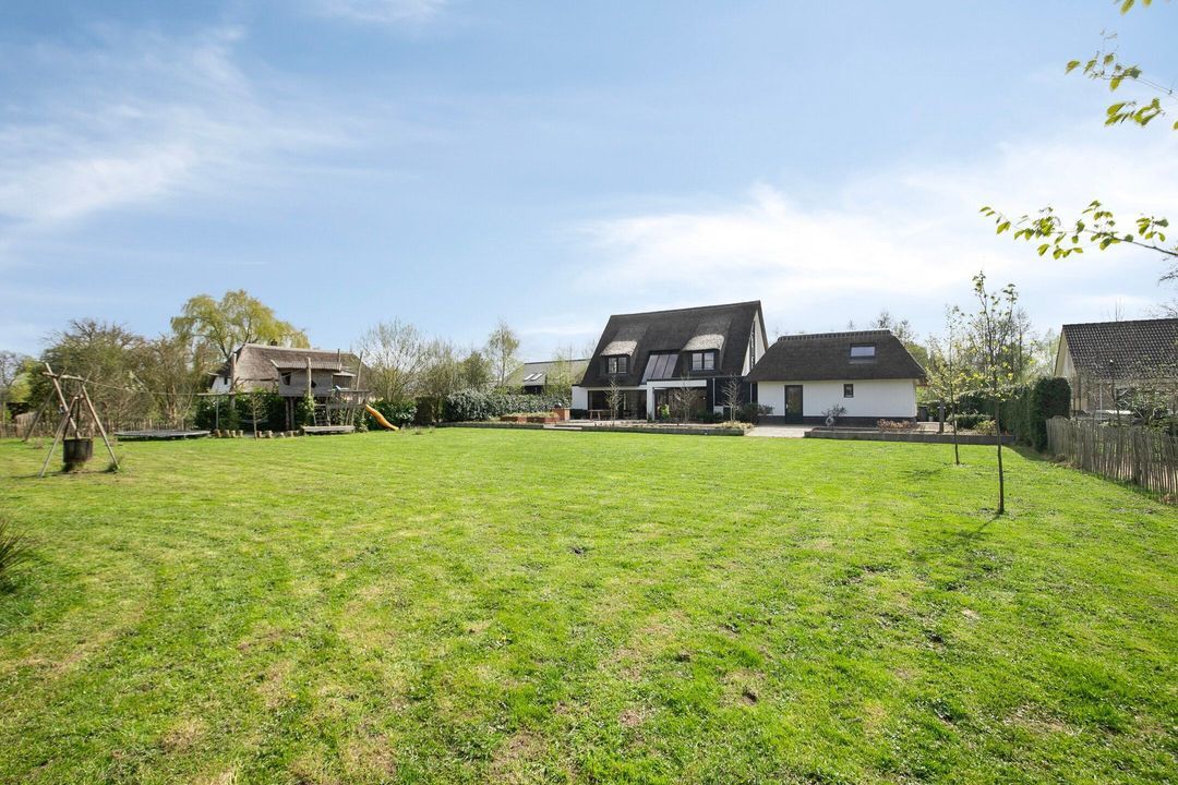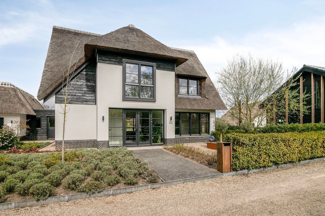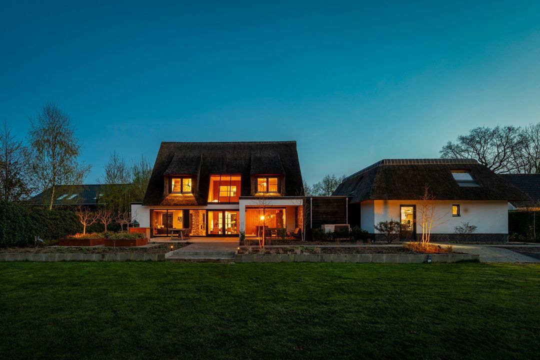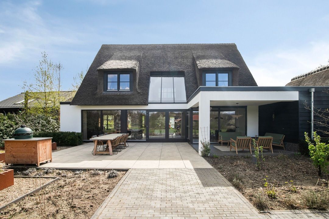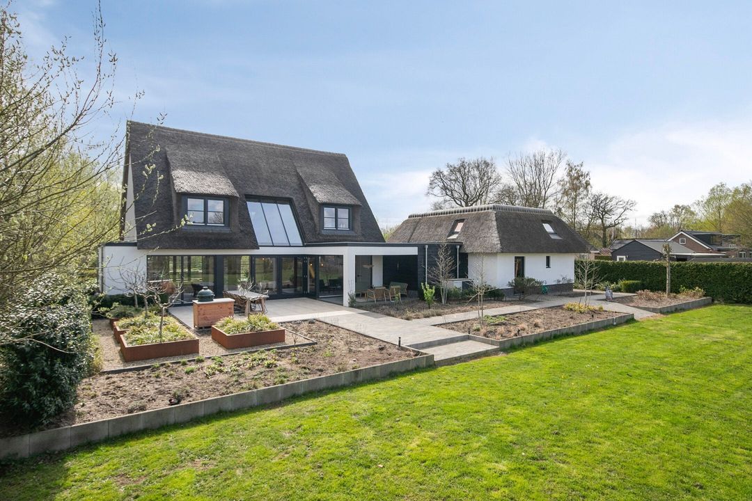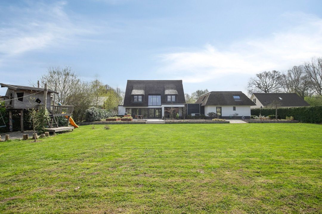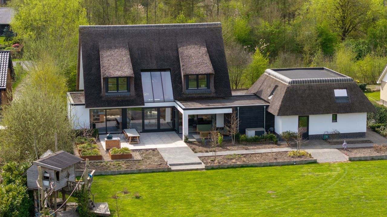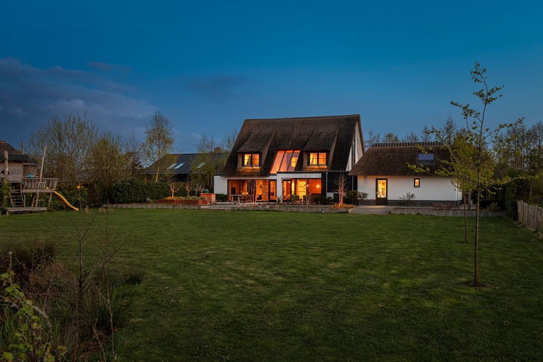 De rietgedekte Villa maakt direct indruk met haar statige uitstraling en beschikt bovendien over een ruime, volledig geïsoleerde dubbele garage met elektrisch bedienbare deuren.