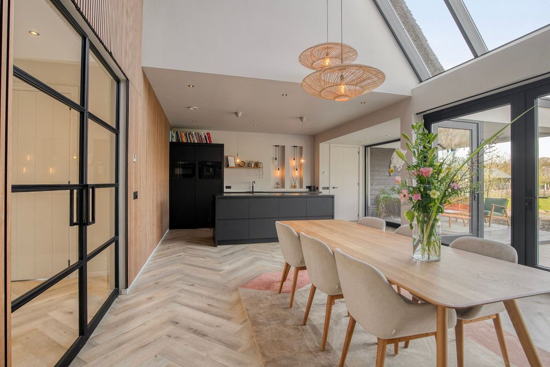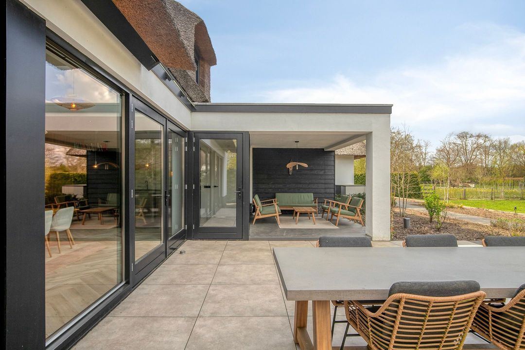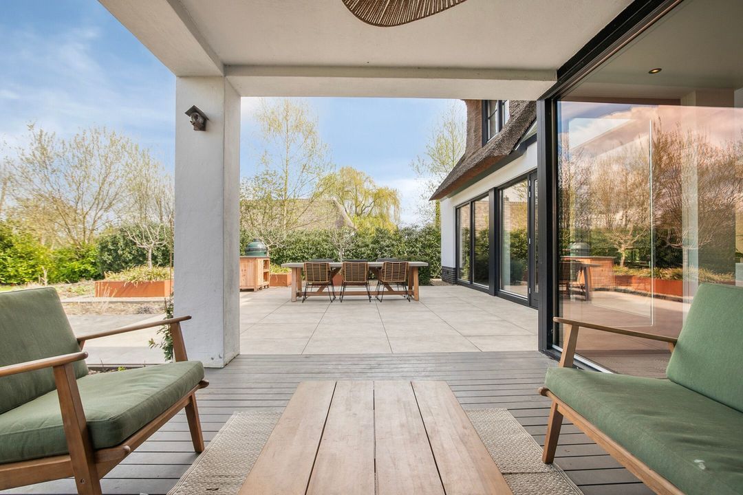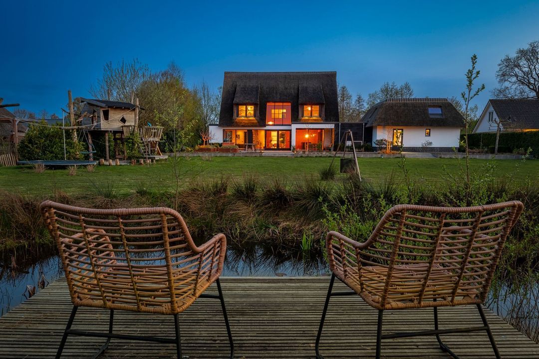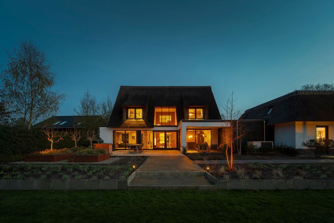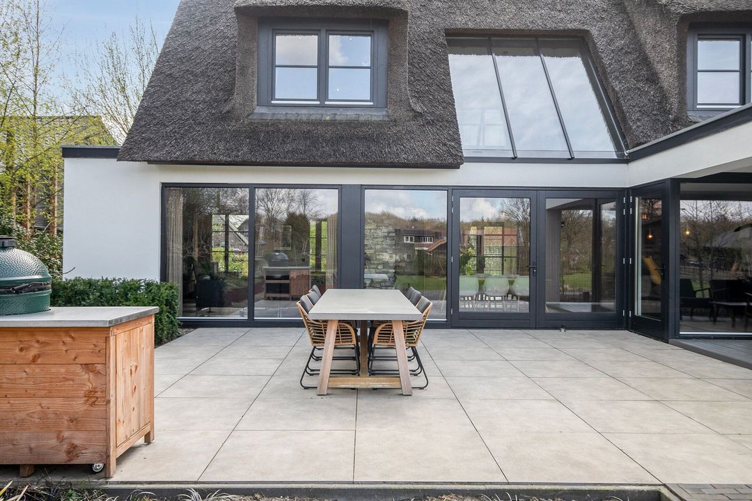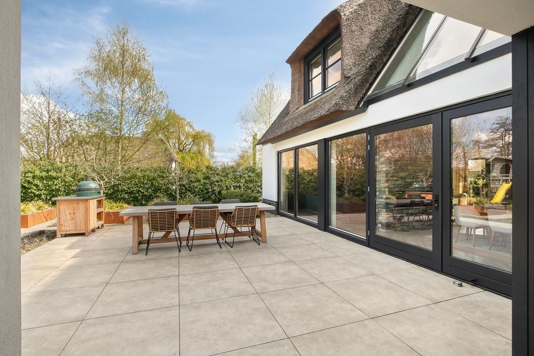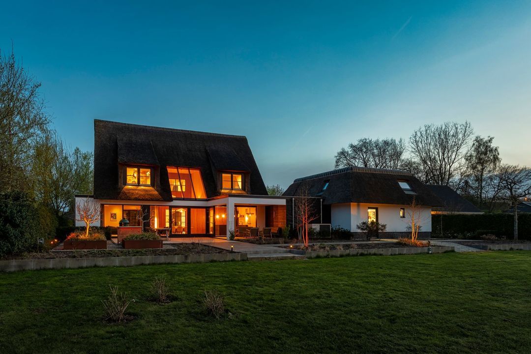De rietgedekte Villa maakt direct indruk met haar statige uitstraling en beschikt bovendien over een ruime, volledig geïsoleerde dubbele garage met elektrisch bedienbare deuren.