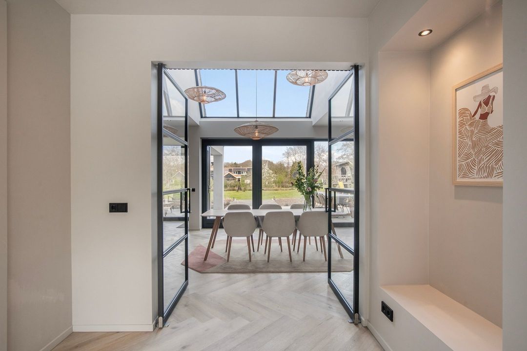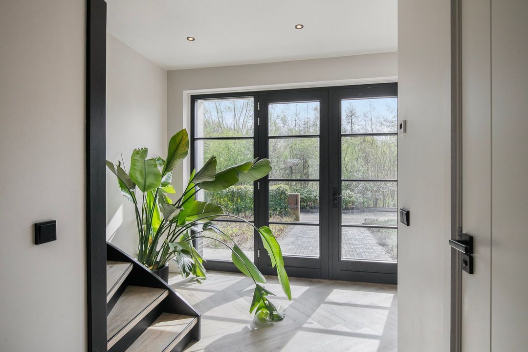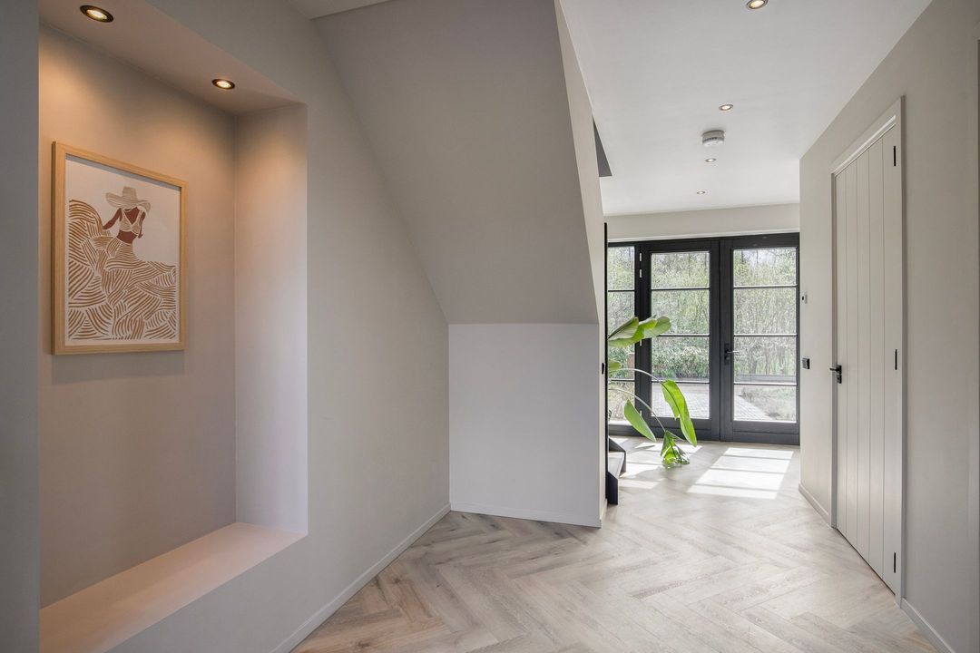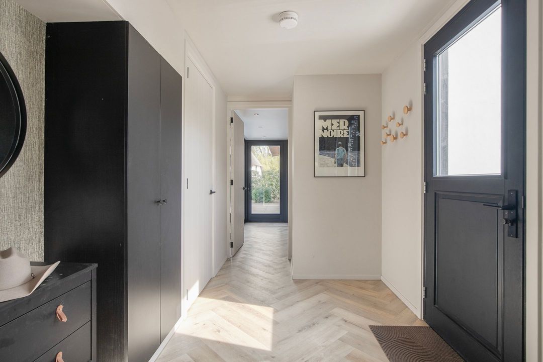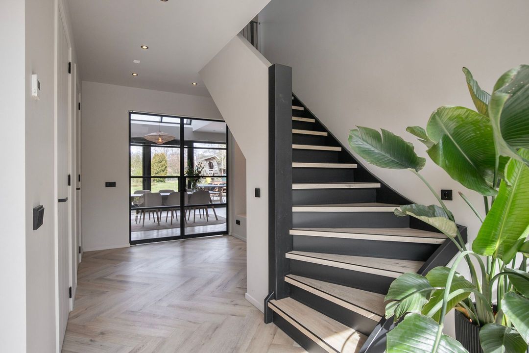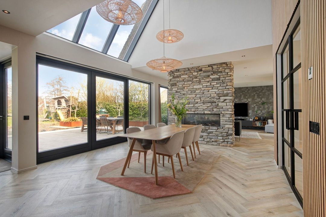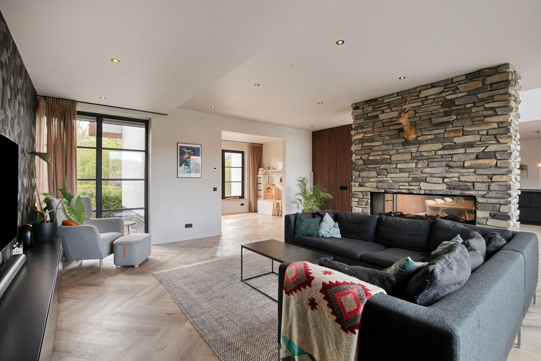 Bij binnenkomst wordt u verwelkomd in een royale hal met een modern toilet en een praktische bijkeuken die is ingericht als wasruimte en voorzien van maatwerkkasten. Via stijlvolle dubbele stalen deuren betreedt u de lichte en ruime woonkamer met een moderne open keuken. Het kookeiland en de inbouwapparatuur maken deze ruimte tot het hart van de woning. Een natuurstenen wand met gashaard vormt een elegante scheiding naar de sfeervolle zit- en tv-kamer, terwijl de grote raampartijen zorgen voor een prachtig uitzicht op de fraai aangelegde tuin.