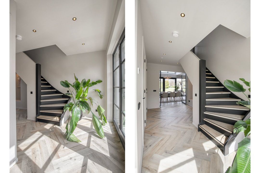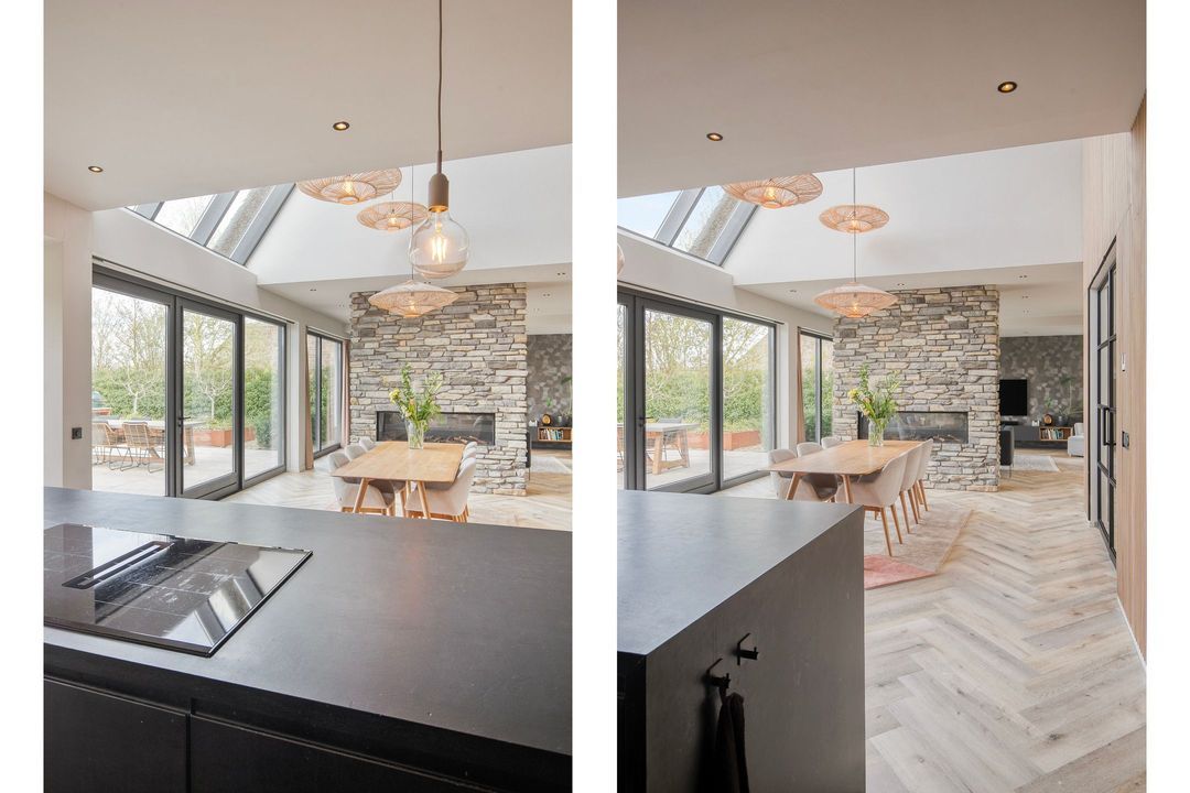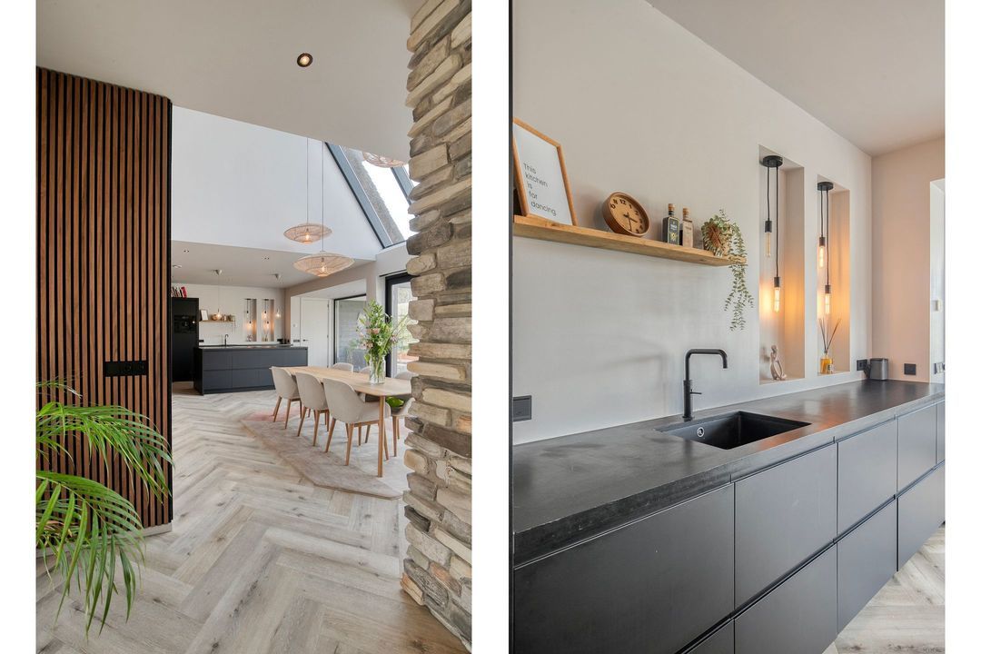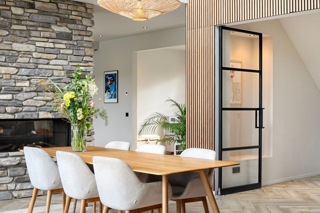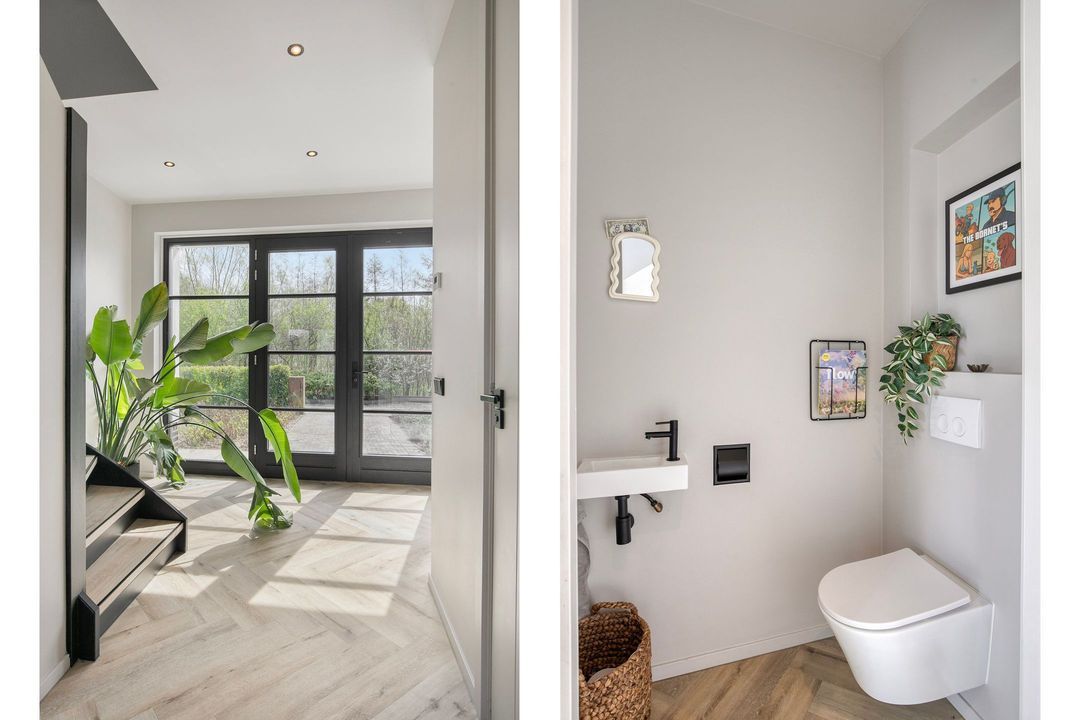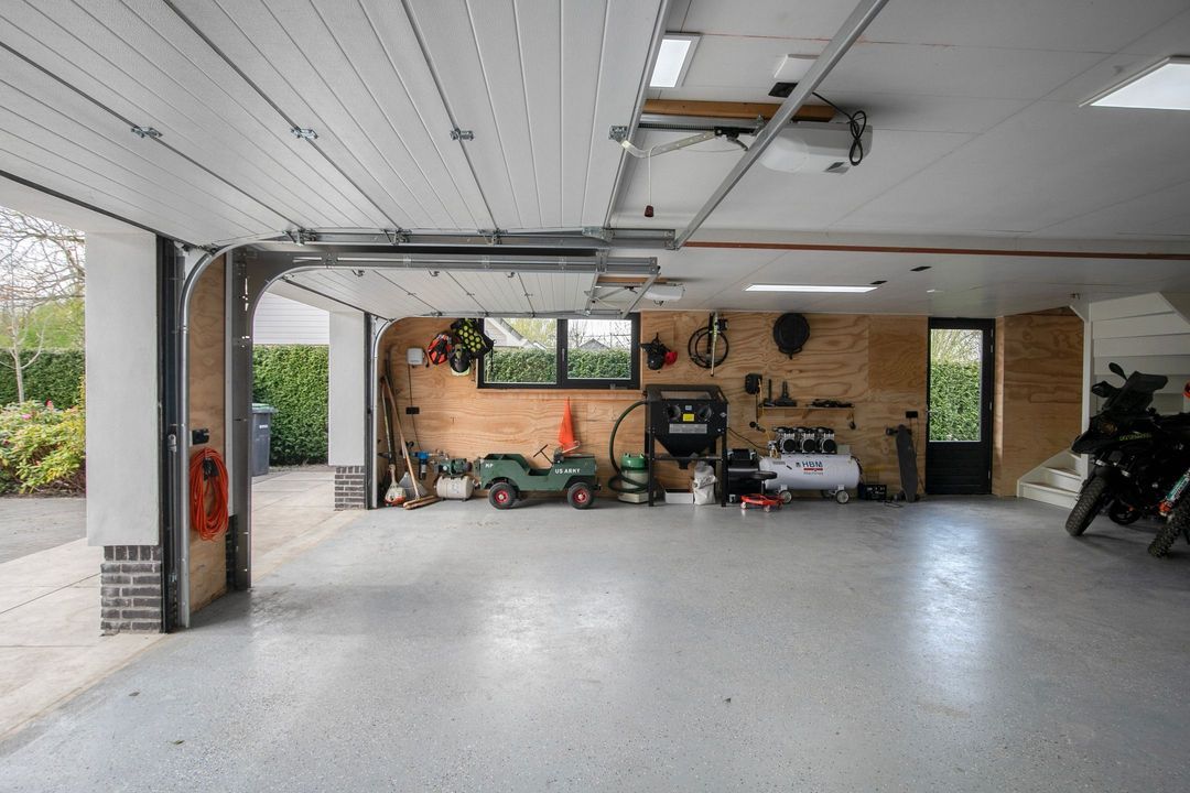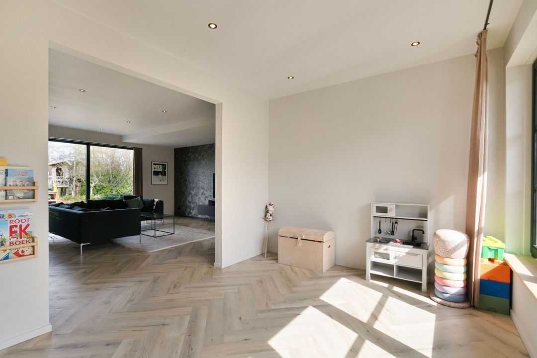 Bij binnenkomst wordt u verwelkomd in een royale hal met een modern toilet en een praktische bijkeuken die is ingericht als wasruimte en voorzien van maatwerkkasten. Via stijlvolle dubbele stalen deuren betreedt u de lichte en ruime woonkamer met een moderne open keuken. Het kookeiland en de inbouwapparatuur maken deze ruimte tot het hart van de woning. Een natuurstenen wand met gashaard vormt een elegante scheiding naar de sfeervolle zit- en tv-kamer, terwijl de grote raampartijen zorgen voor een prachtig uitzicht op de fraai aangelegde tuin.
