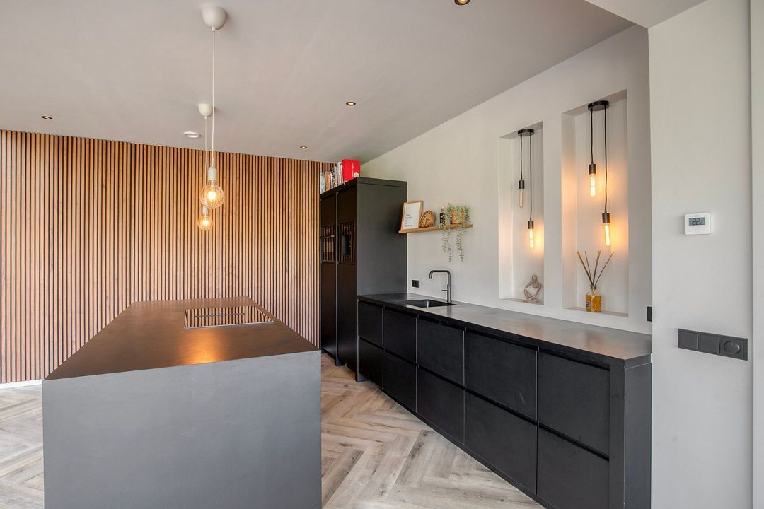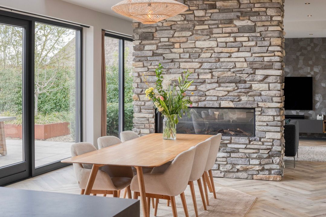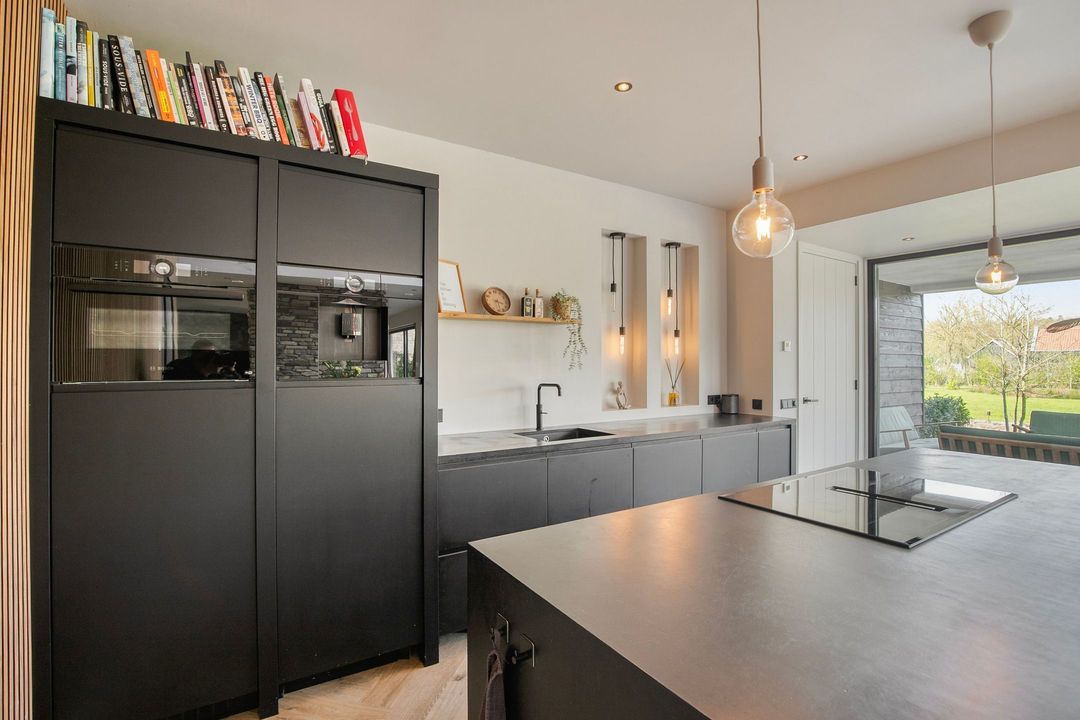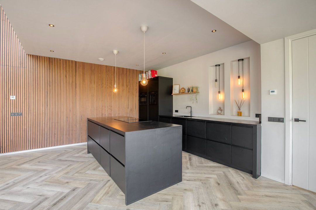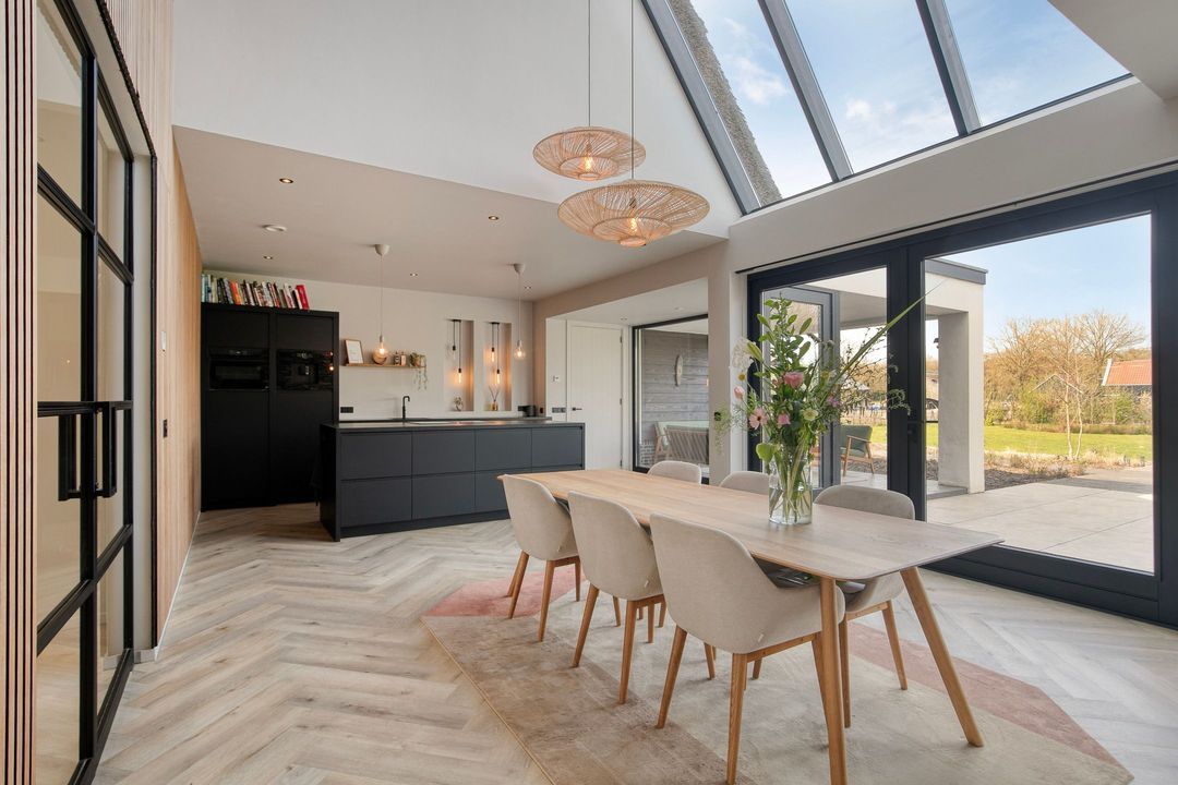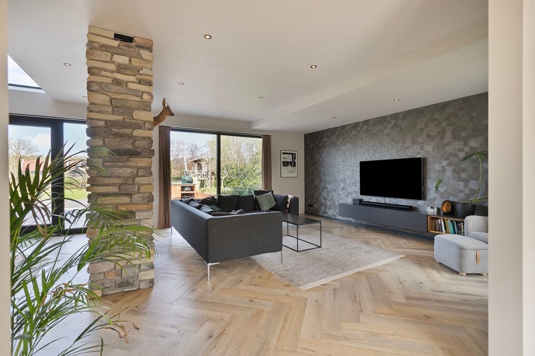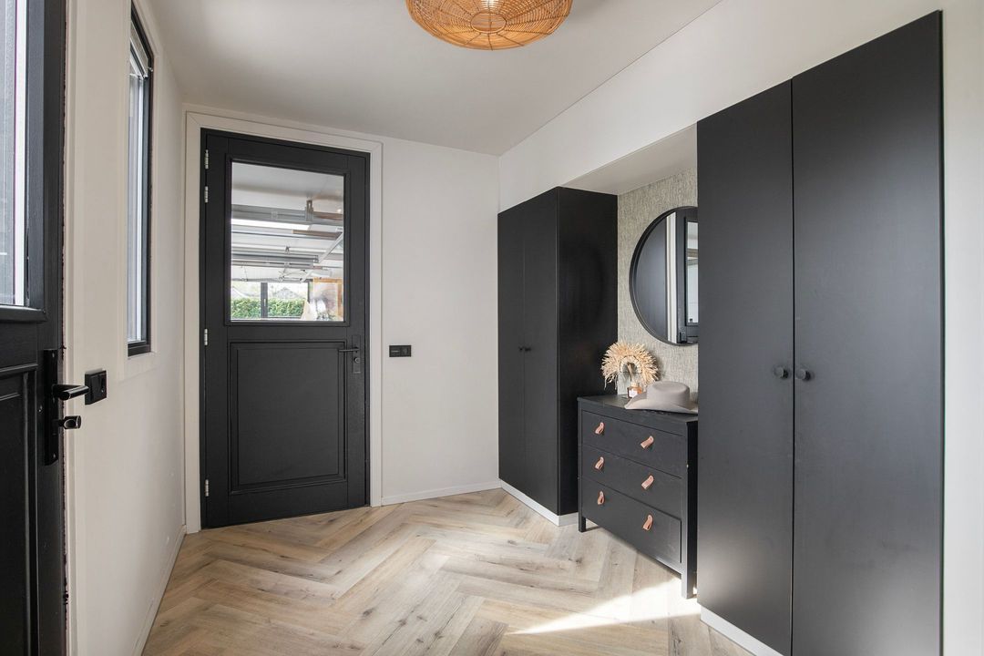 Bij binnenkomst wordt u verwelkomd in een royale hal met een modern toilet en een praktische bijkeuken die is ingericht als wasruimte en voorzien van maatwerkkasten. Via stijlvolle dubbele stalen deuren betreedt u de lichte en ruime woonkamer met een moderne open keuken. Het kookeiland en de inbouwapparatuur maken deze ruimte tot het hart van de woning. Een natuurstenen wand met gashaard vormt een elegante scheiding naar de sfeervolle zit- en tv-kamer, terwijl de grote raampartijen zorgen voor een prachtig uitzicht op de fraai aangelegde tuin.