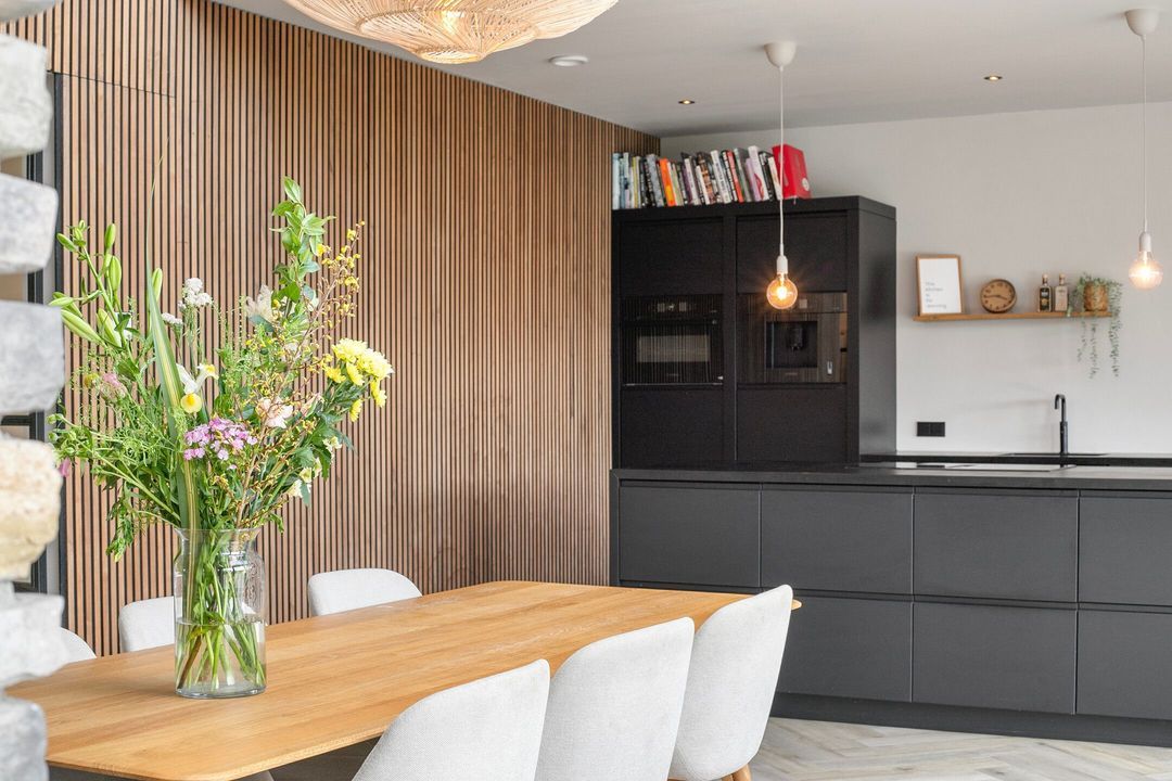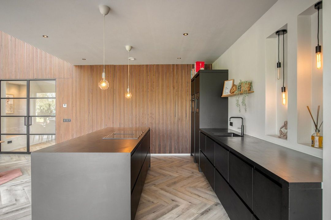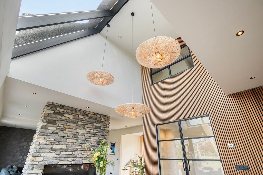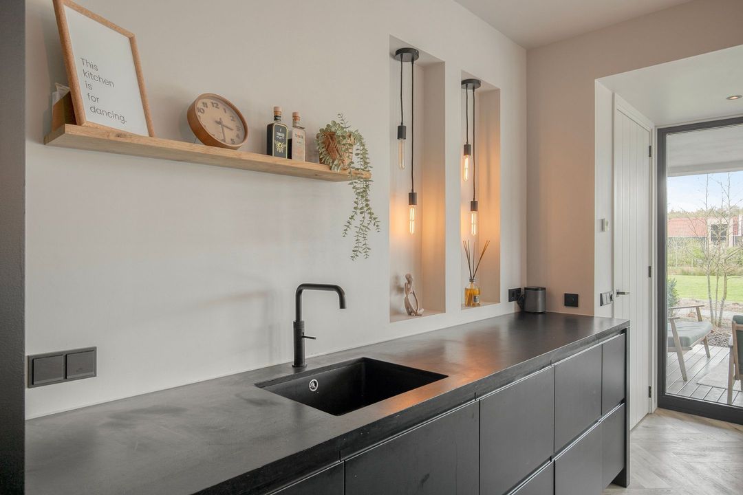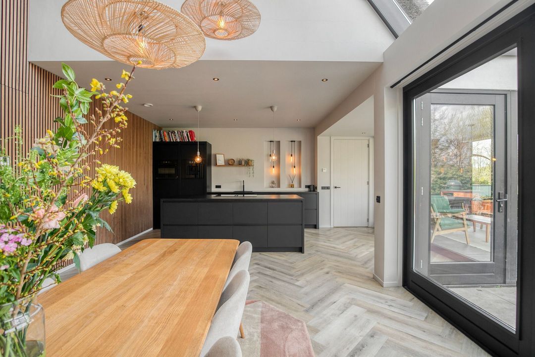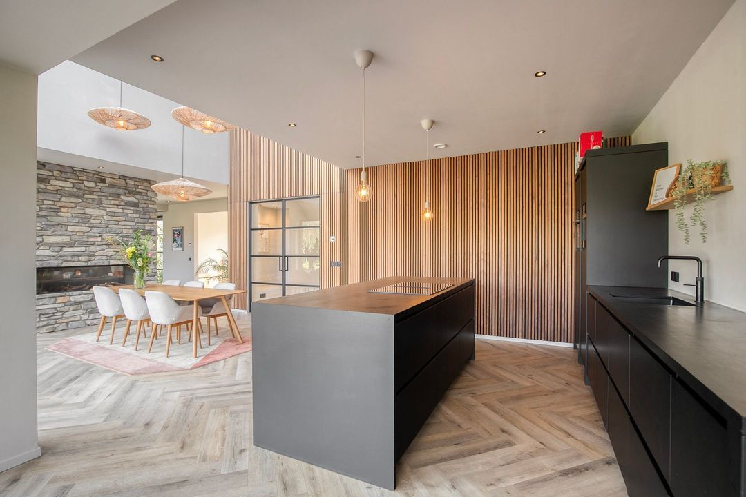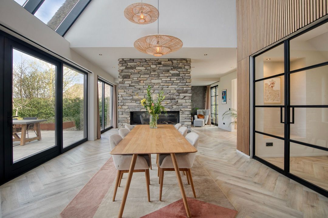 Bij binnenkomst wordt u verwelkomd in een royale hal met een modern toilet en een praktische bijkeuken die is ingericht als wasruimte en voorzien van maatwerkkasten. Via stijlvolle dubbele stalen deuren betreedt u de lichte en ruime woonkamer met een moderne open keuken. Het kookeiland en de inbouwapparatuur maken deze ruimte tot het hart van de woning. Een natuurstenen wand met gashaard vormt een elegante scheiding naar de sfeervolle zit- en tv-kamer, terwijl de grote raampartijen zorgen voor een prachtig uitzicht op de fraai aangelegde tuin.