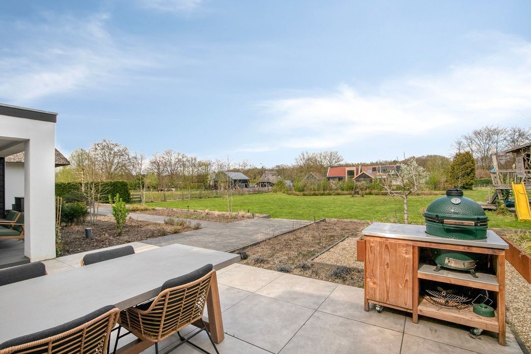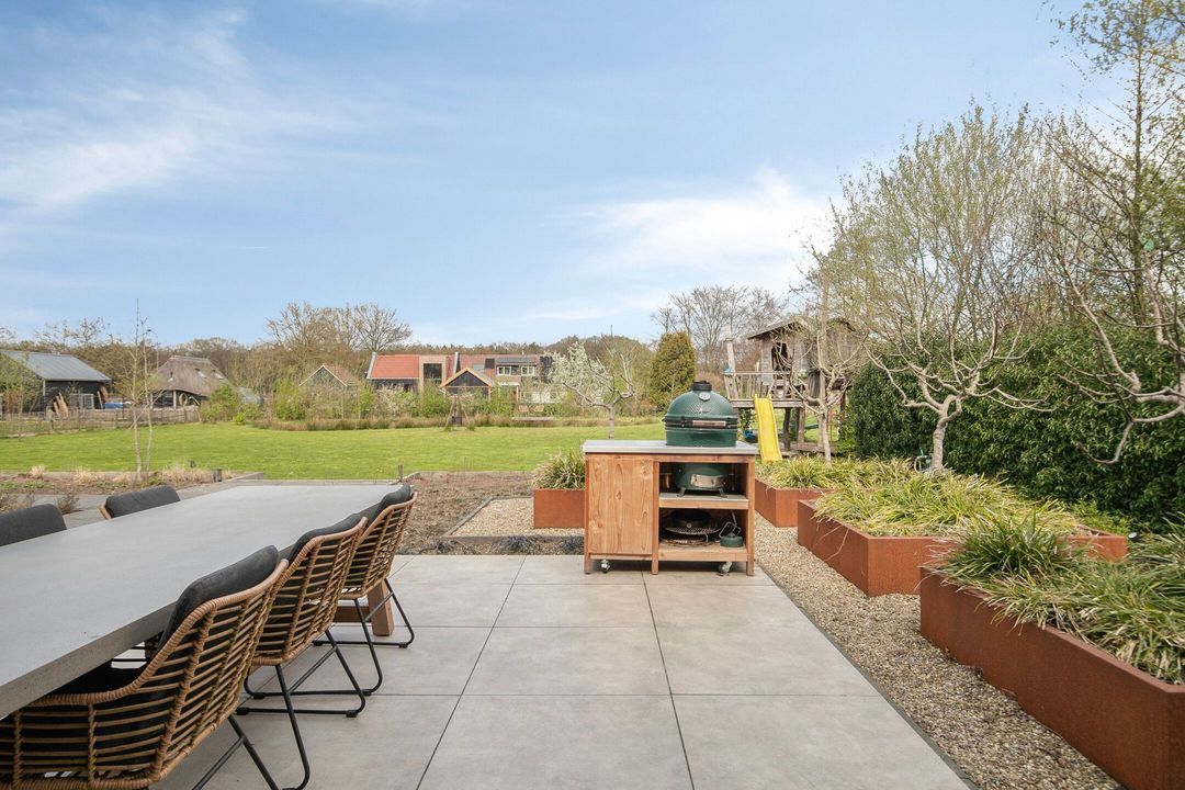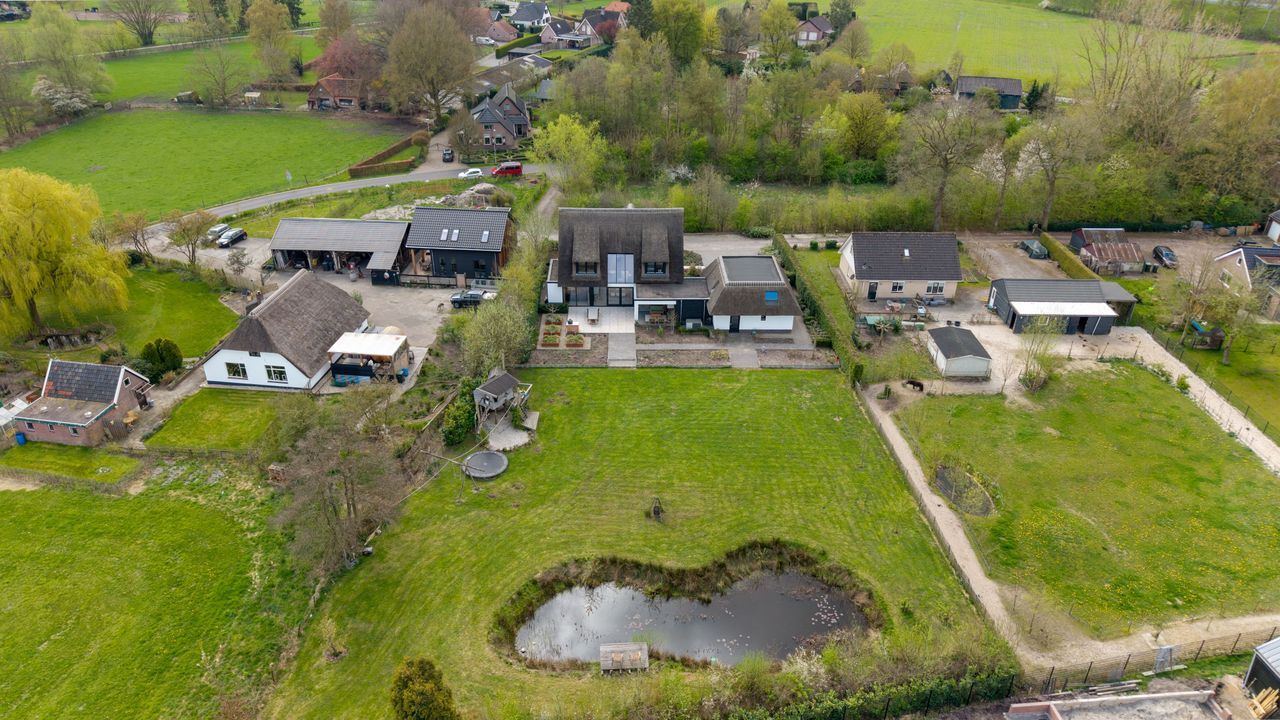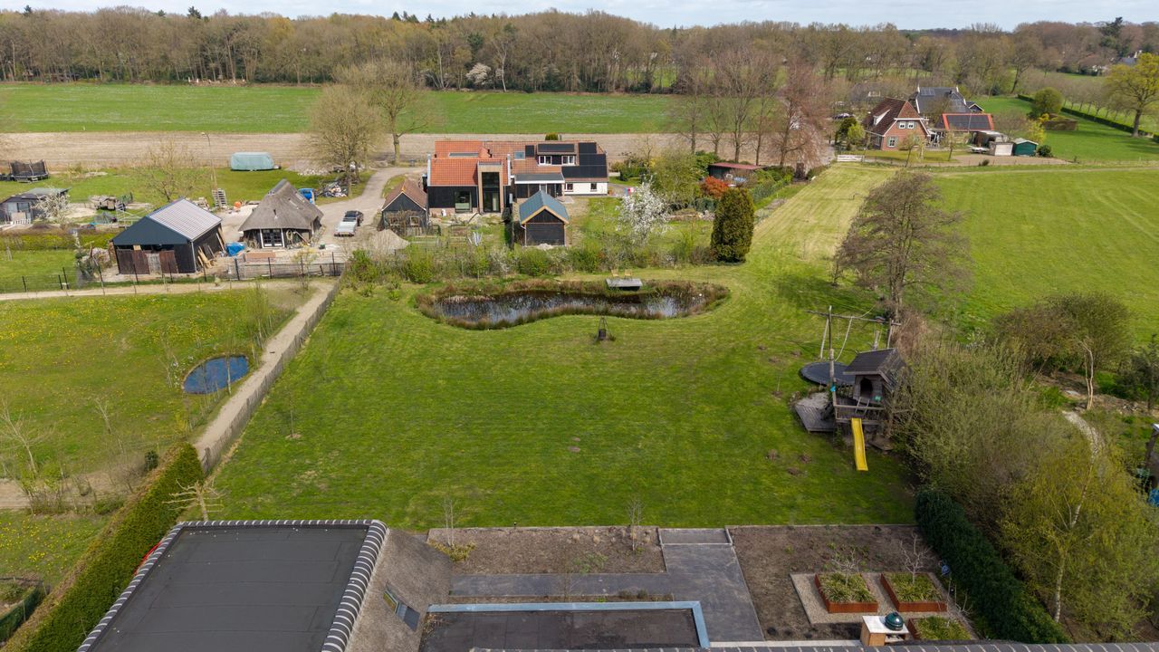 Ook buiten laat deze woning niets te wensen over. De fraai aangelegde tuin biedt volledige privacy en beschikt over meerdere terrassen, een sfeervolle veranda, een vijver en een royaal gazon met speeltoestel. Hier geniet u in alle rust van het buitenleven, omringd door groen en ruimte, met de uitgestrekte bossen van de Veluwe op loopafstand.
