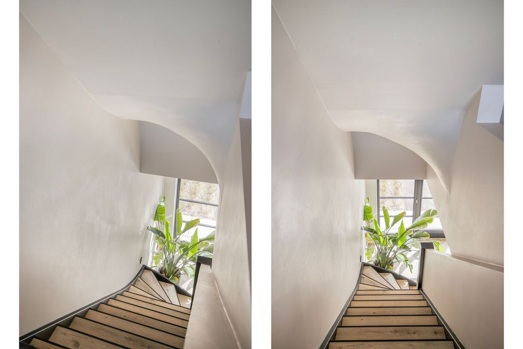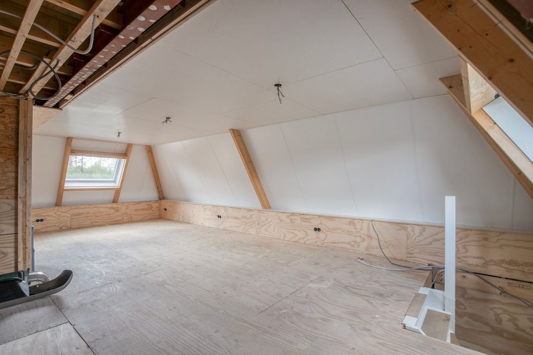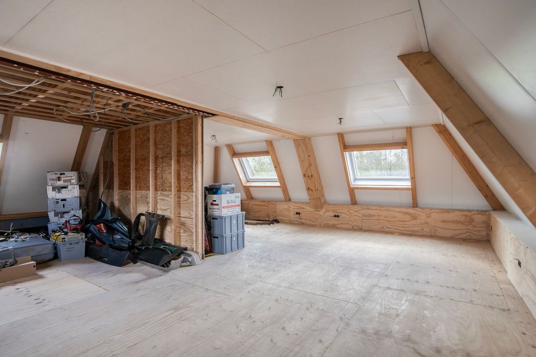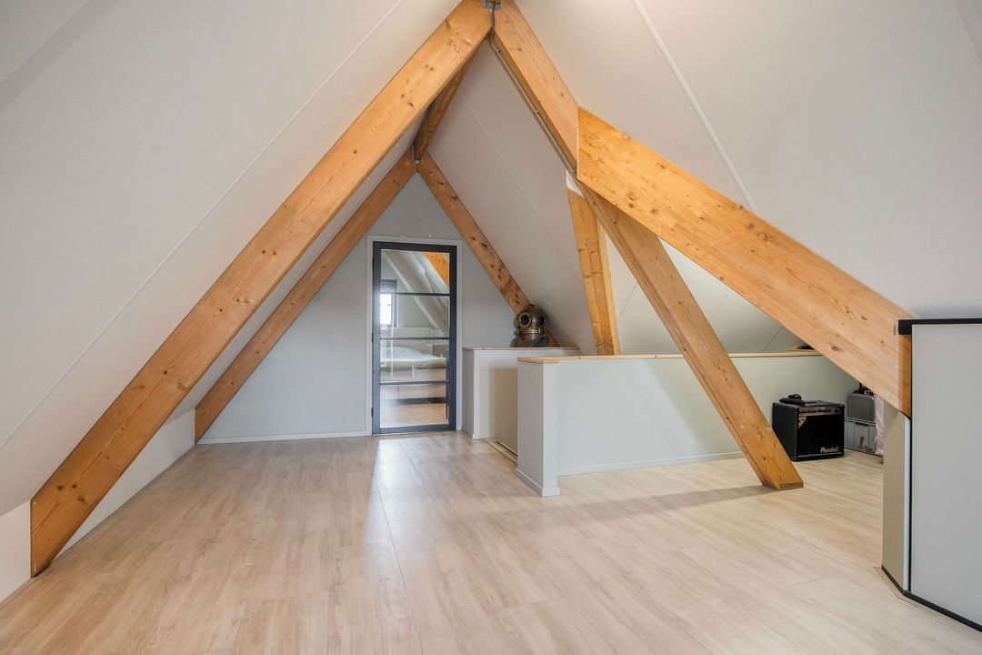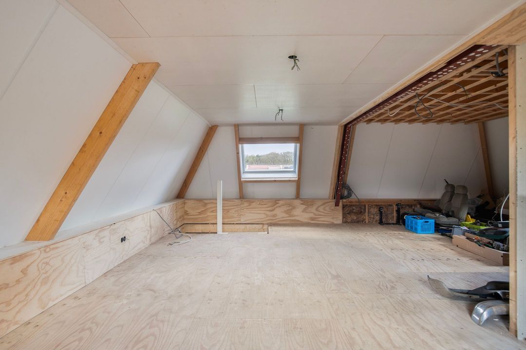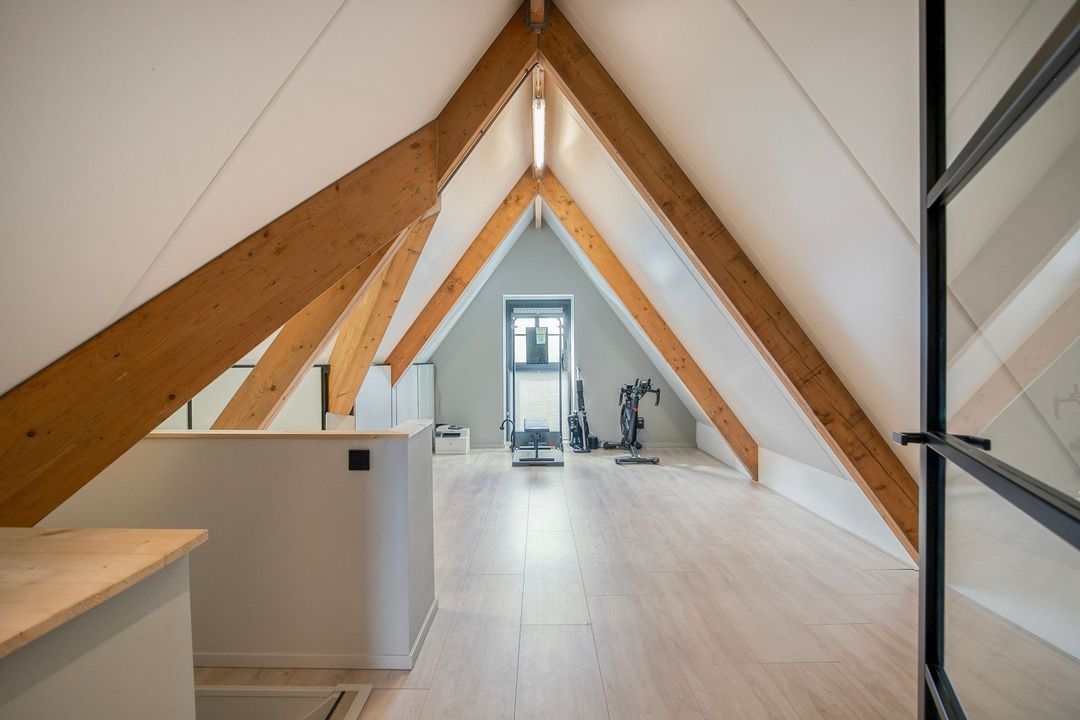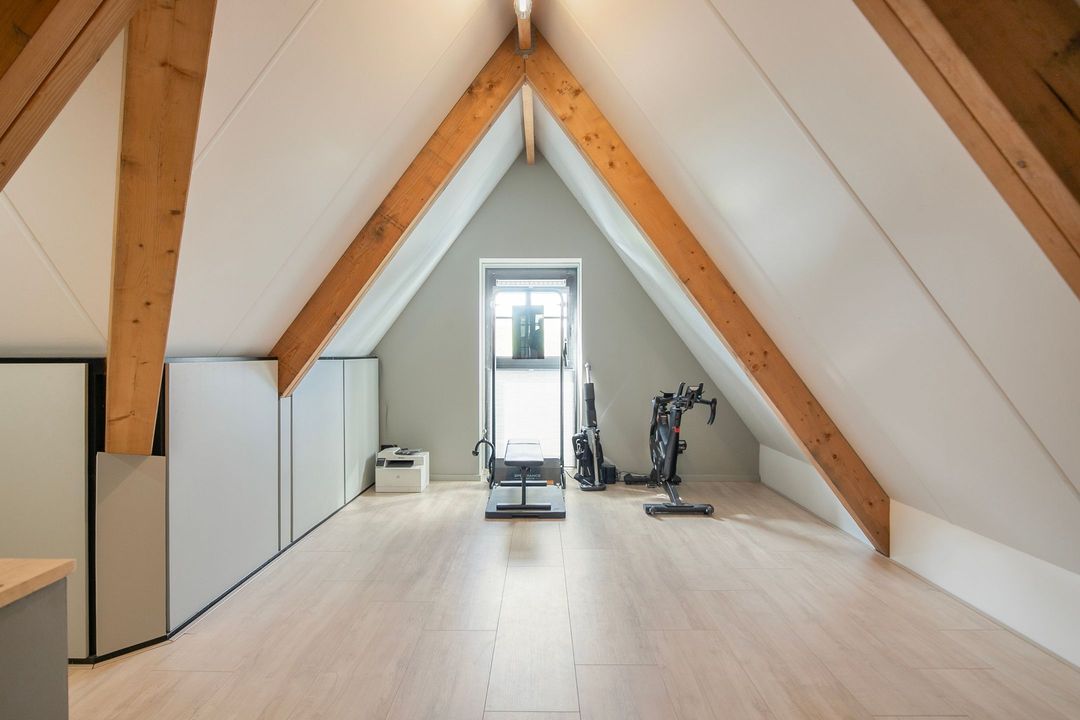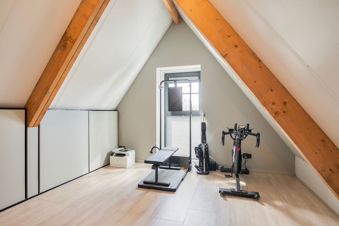 De tweede verdieping biedt nog een extra slaap- of werkkamer, veel bergruimte en een open ruimte die momenteel in gebruik is als fitnessruimte.