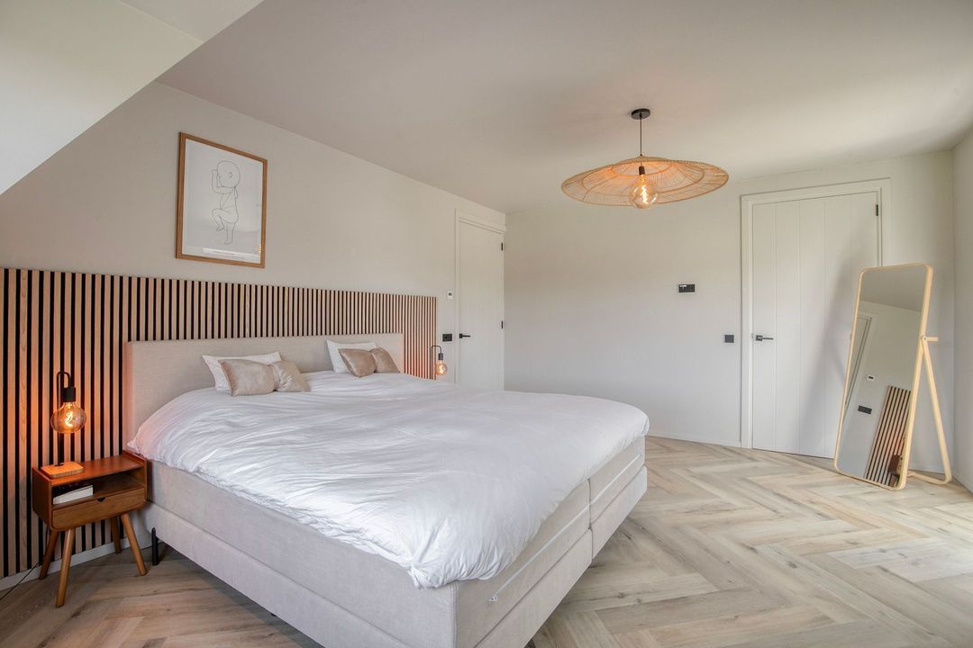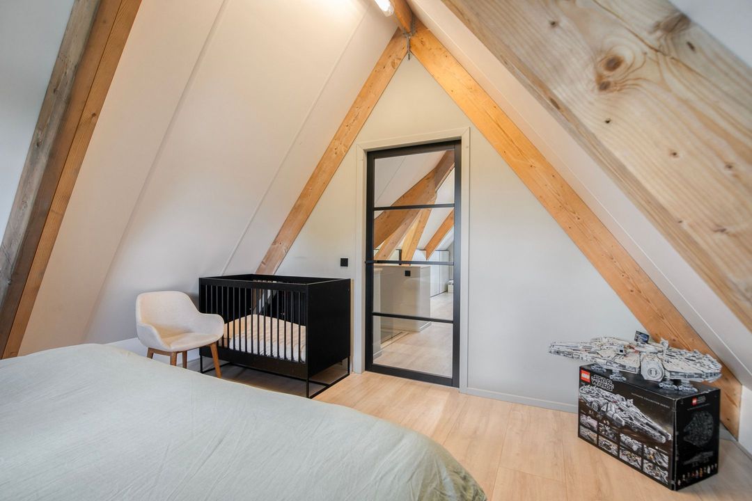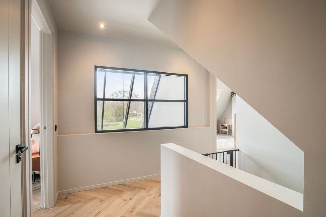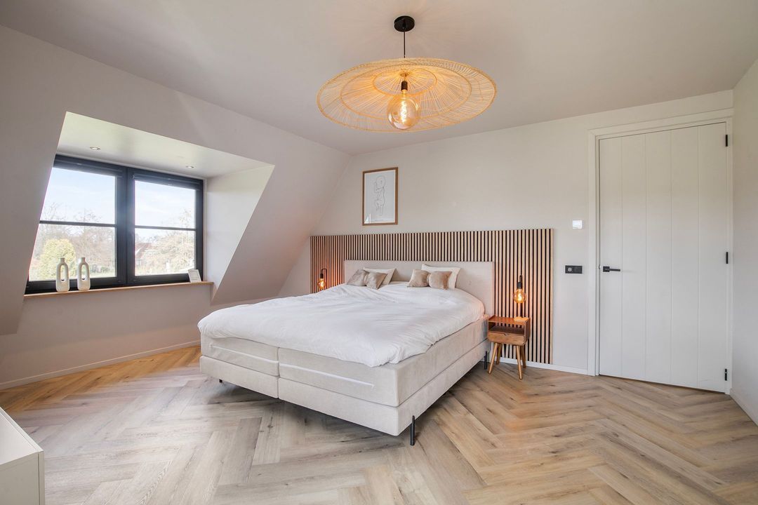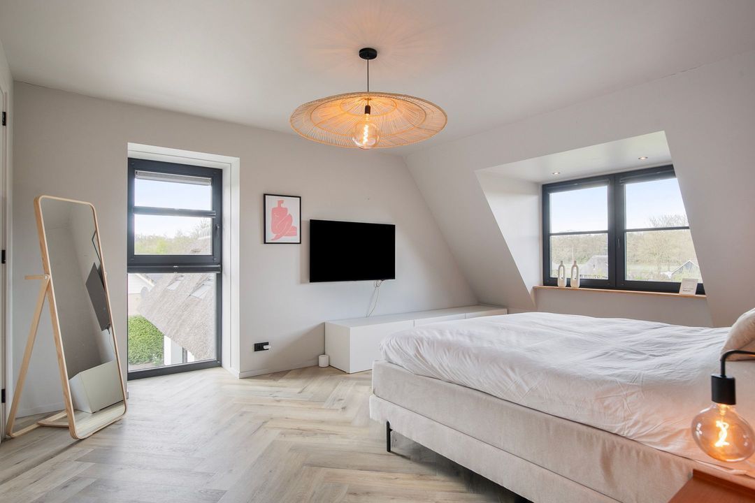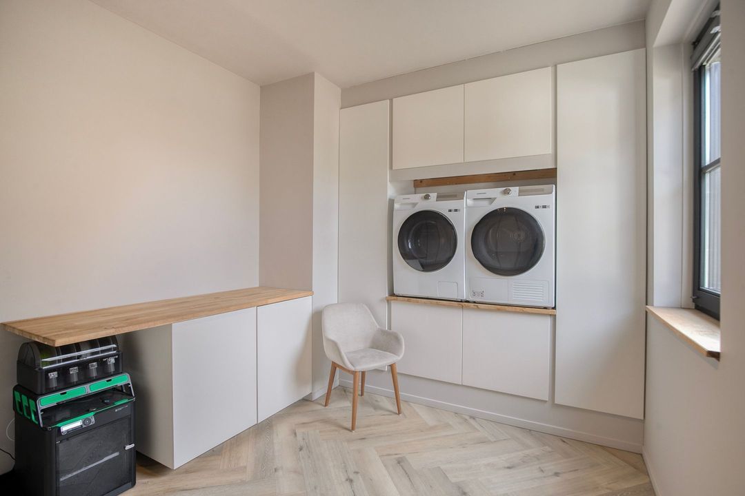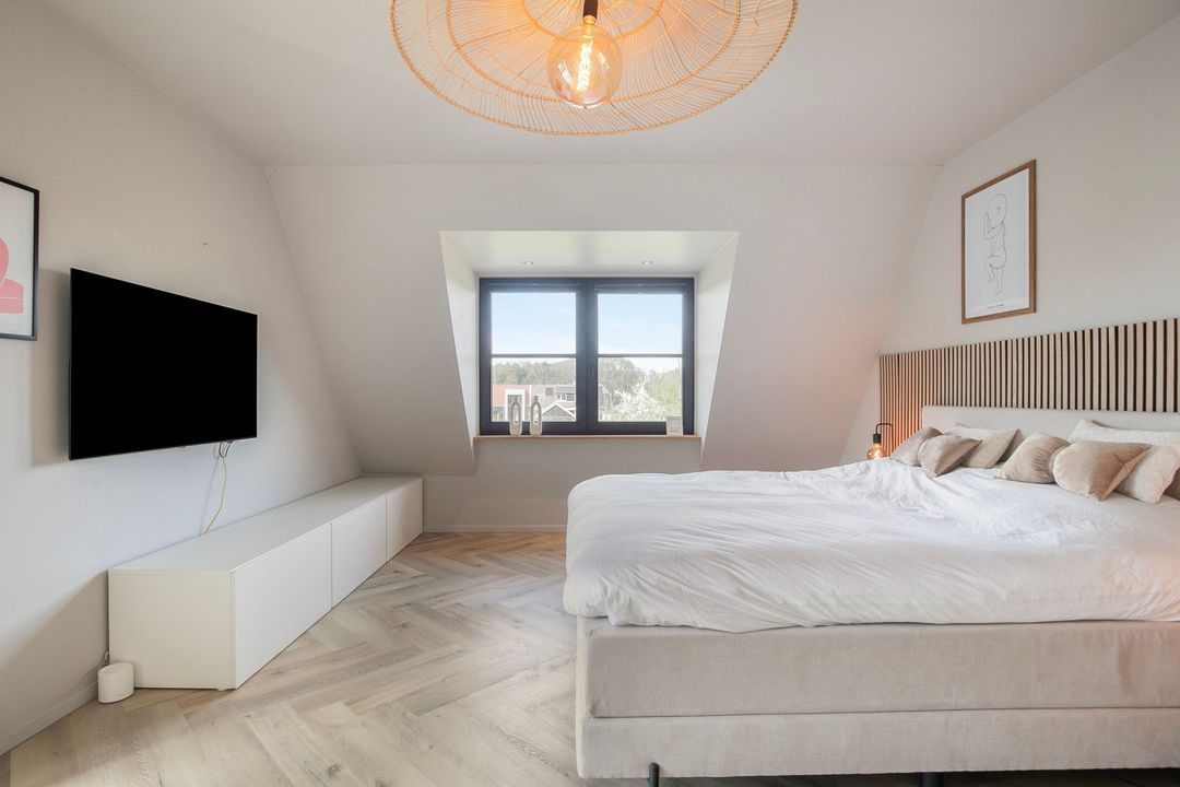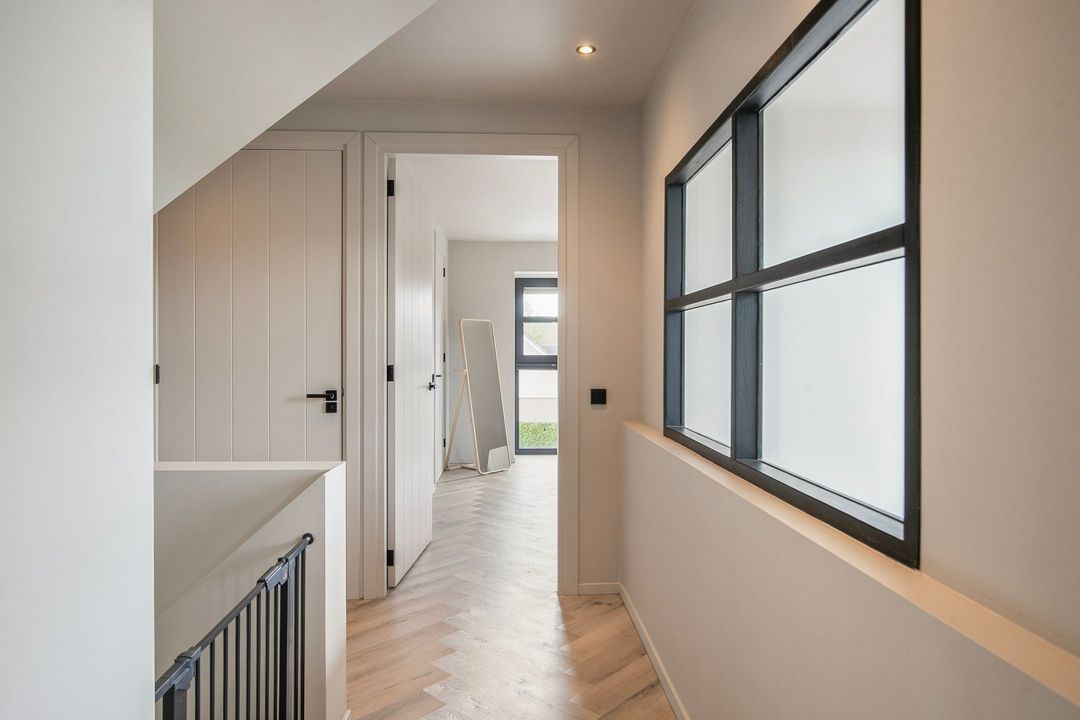 Op de eerste verdieping bevinden zich drie ruime slaapkamers, een apart toilet en een luxe badkamer voorzien van een inloopdouche met dubbele douche, vrijstaand ligbad en een stijlvol wastafelmeubel. Een bijzonder praktisch detail is de waskoker die rechtstreeks uitkomt in de wasruimte op de begane grond.