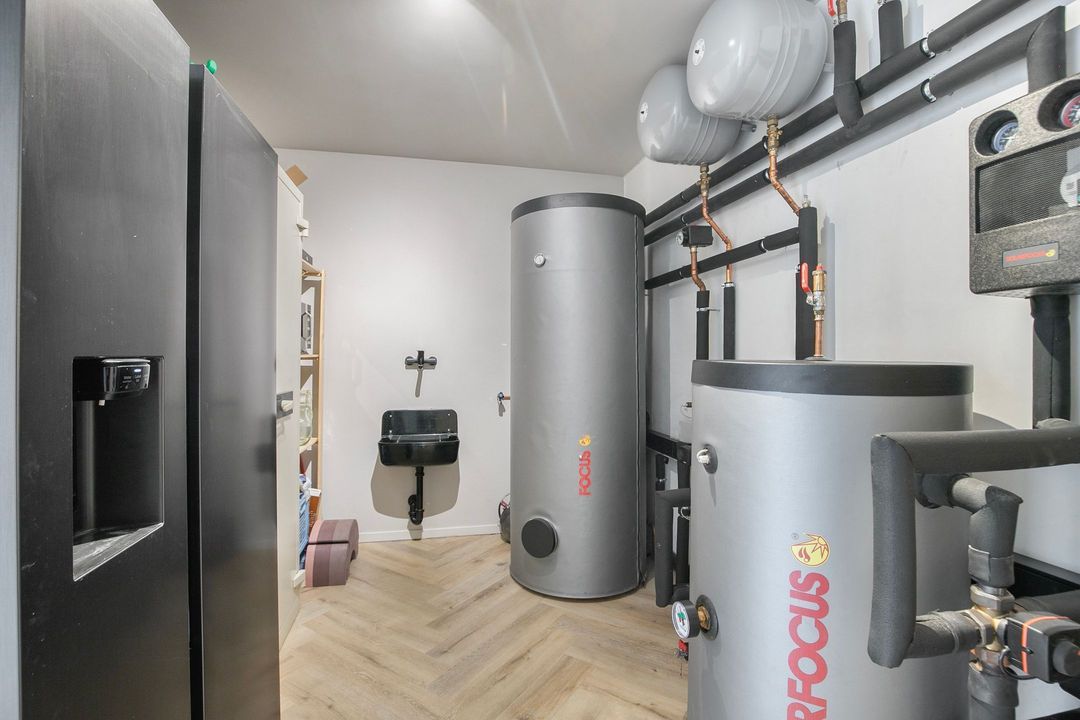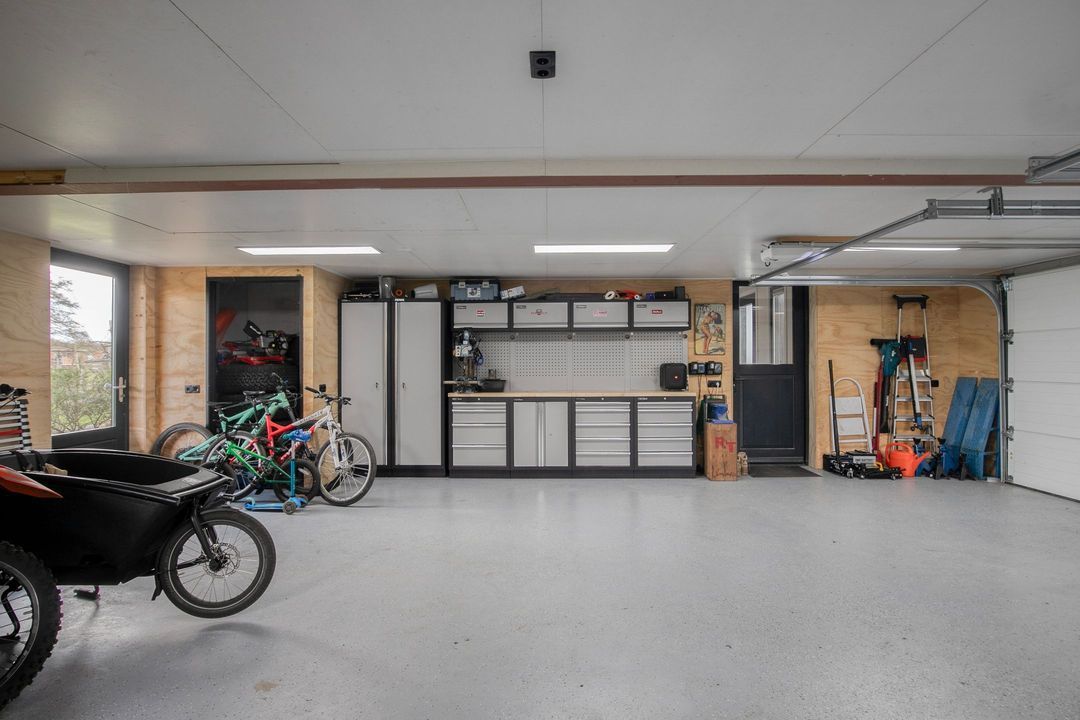 Via zowel de woonkeuken als een separate zij-ingang bereikt u een tweede hal met technische ruimte en toegang tot de dubbele geïsoleerde garage. Vanuit hier leidt een vaste trap naar een royale multifunctionele verdieping die zich uitstekend leent voor gebruik als gastenverblijf, werkruimte of hobbyruimte.