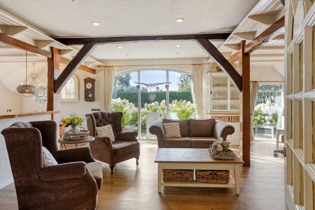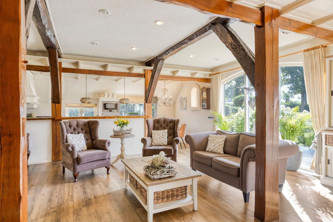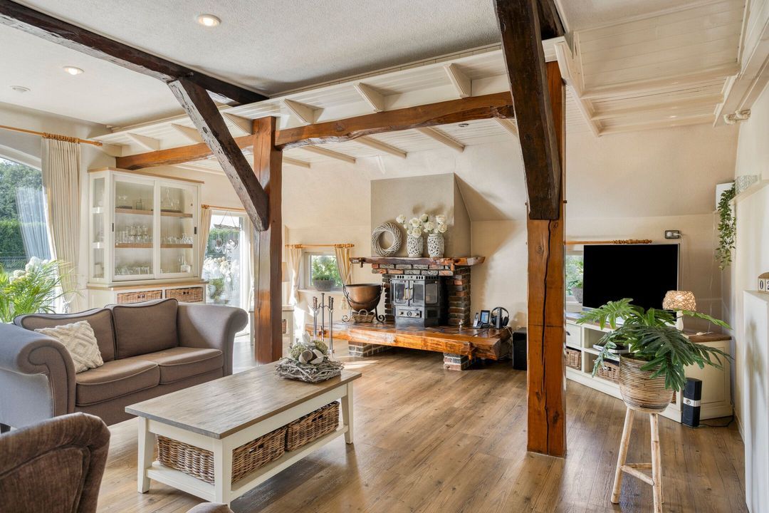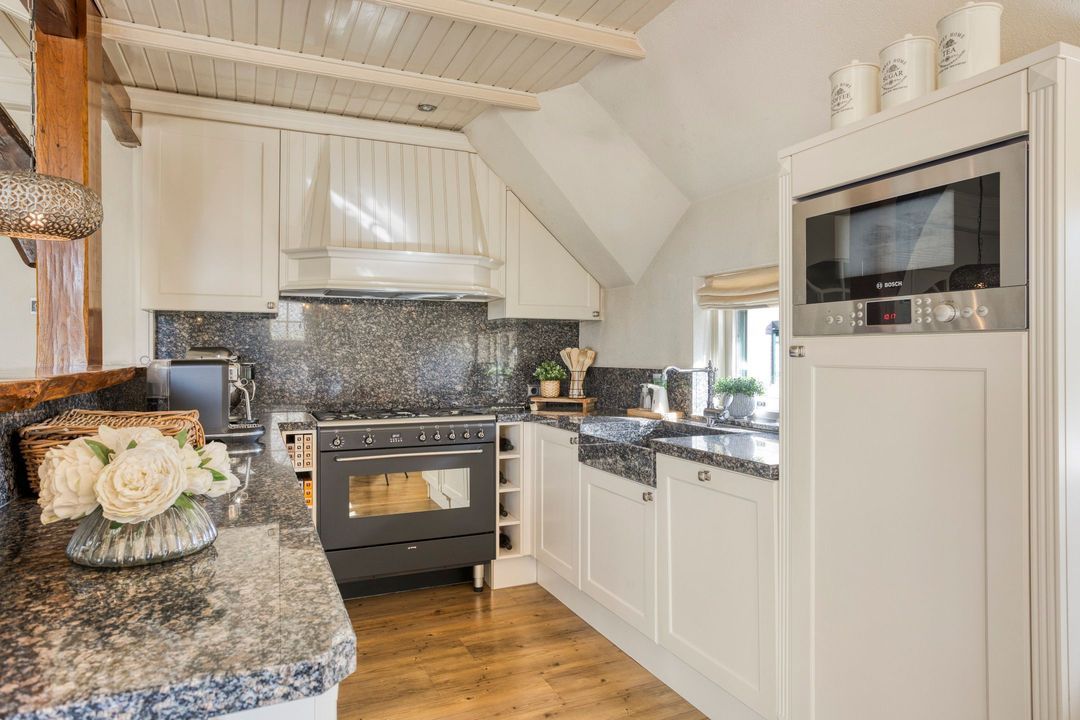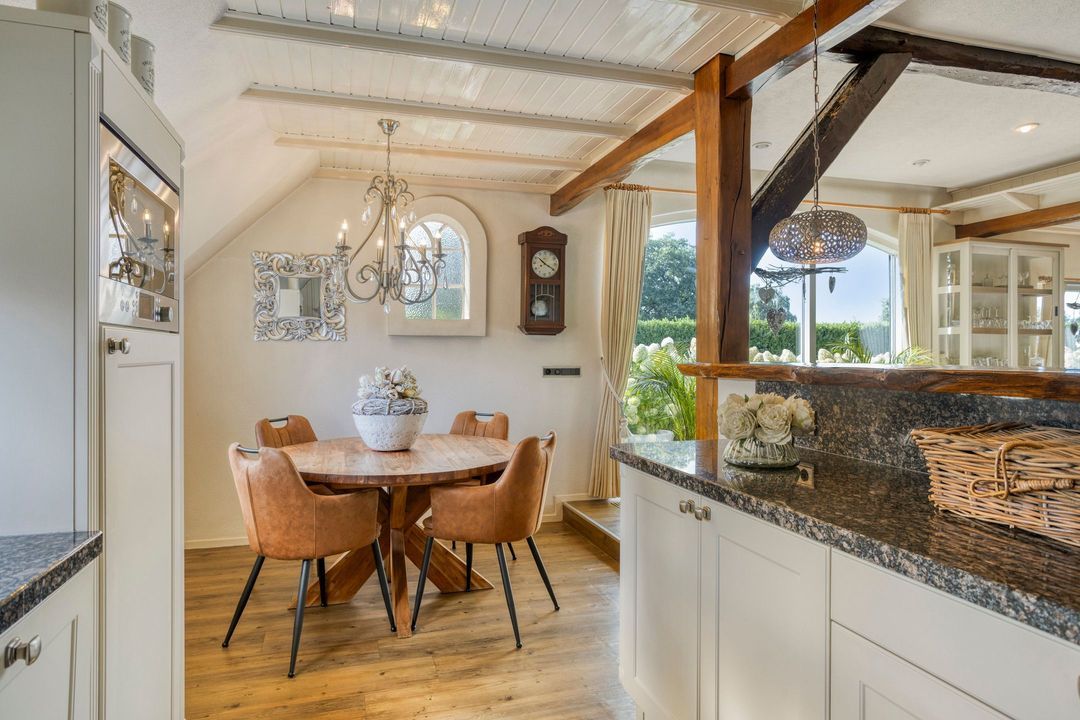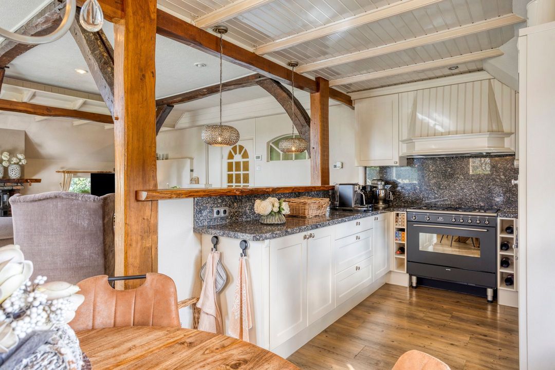 Entree in een royale hal met vide. Op de voormalige deel bevindt zich de sfeervolle woonkamer met authentieke gebinten en een gezellige houtkachel. De royale open keuken is uitgevoerd in een U-opstelling en voorzien van een natuurstenen blad en diverse inbouwapparatuur, waaronder een koelkast, vaatwasser, oven, combimagnetron, afzuigkap en een 5-pits gaskookplaat. Zowel de woonkamer als de keuken zijn voorzien van vloerverwarming.