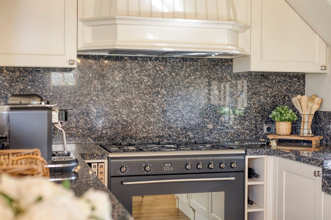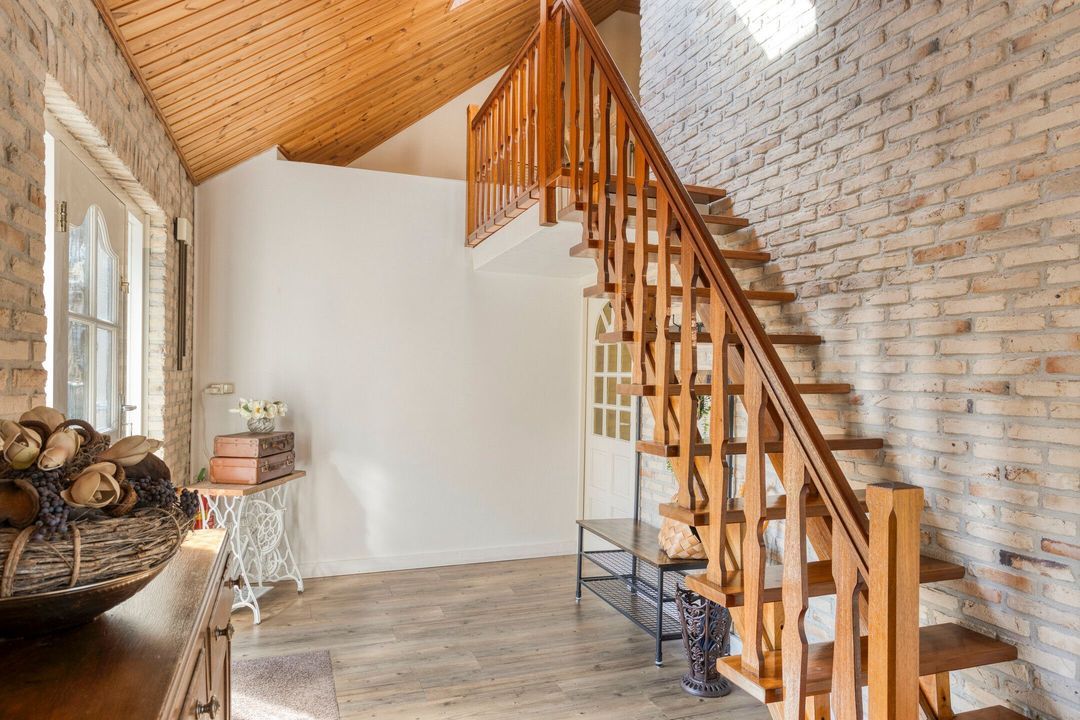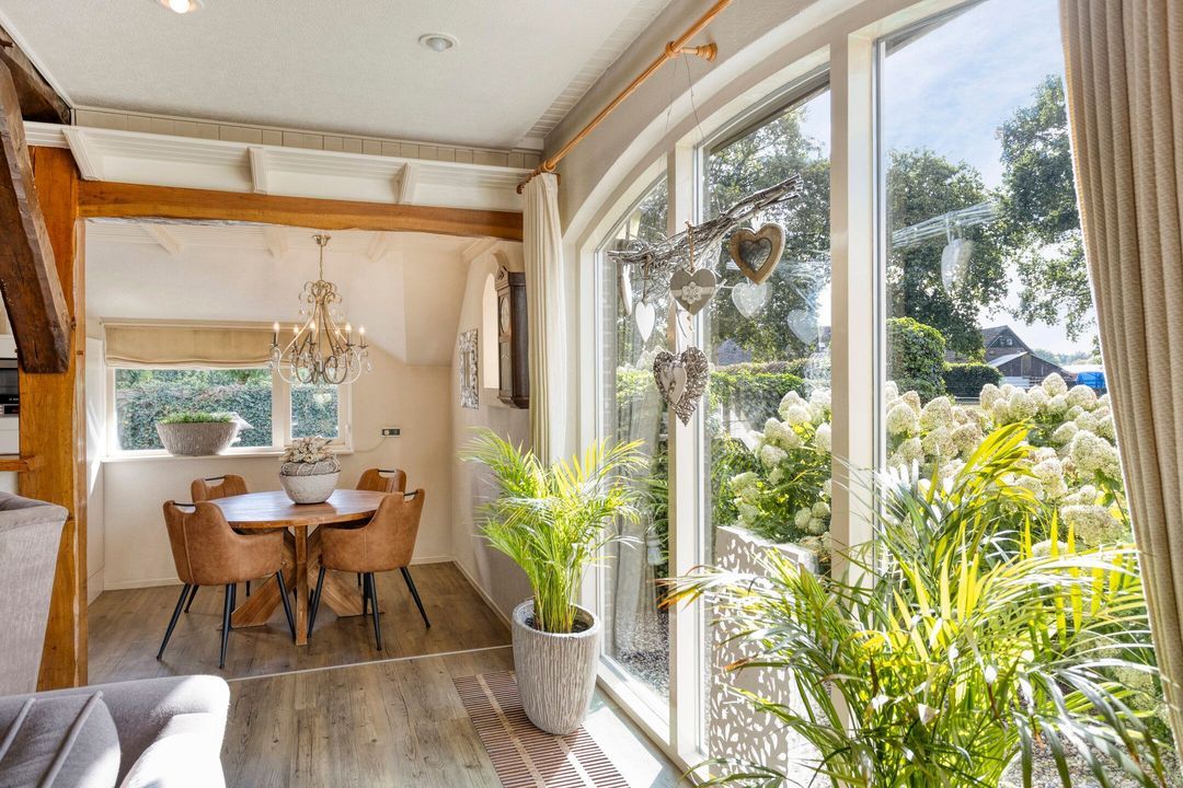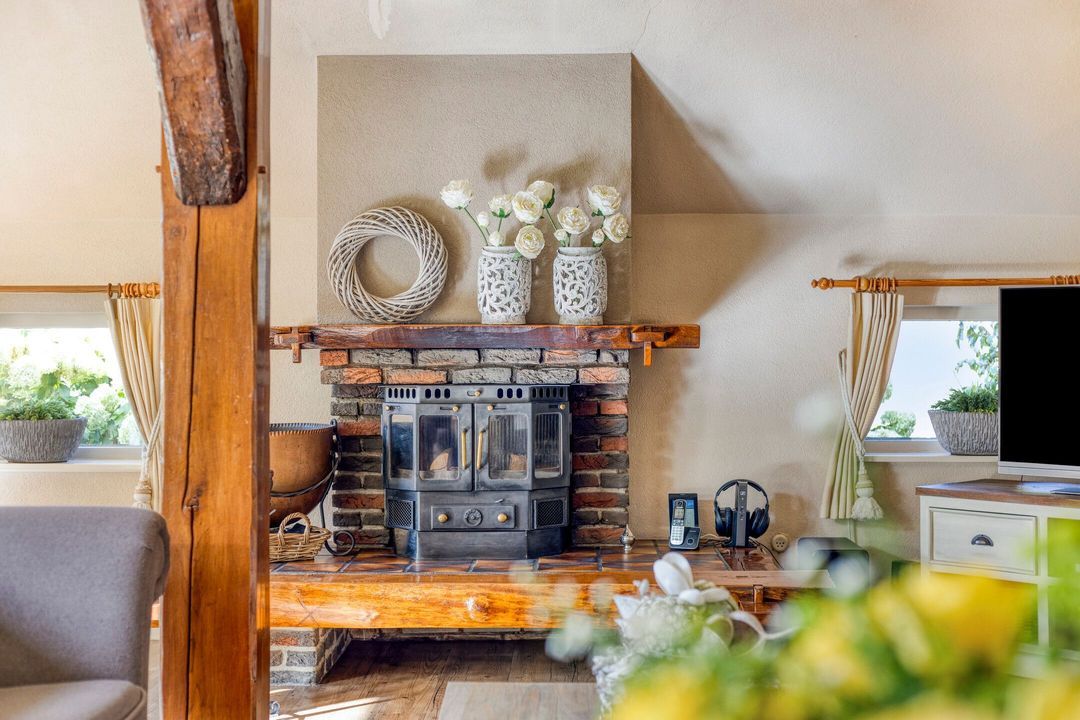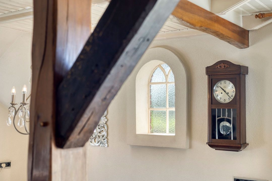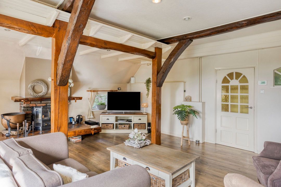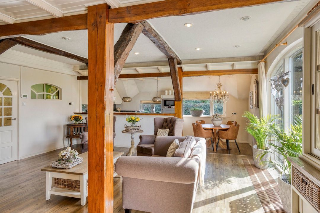 Entree in een royale hal met vide. Op de voormalige deel bevindt zich de sfeervolle woonkamer met authentieke gebinten en een gezellige houtkachel. De royale open keuken is uitgevoerd in een U-opstelling en voorzien van een natuurstenen blad en diverse inbouwapparatuur, waaronder een koelkast, vaatwasser, oven, combimagnetron, afzuigkap en een 5-pits gaskookplaat. Zowel de woonkamer als de keuken zijn voorzien van vloerverwarming.