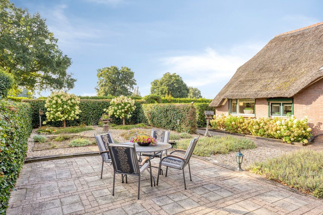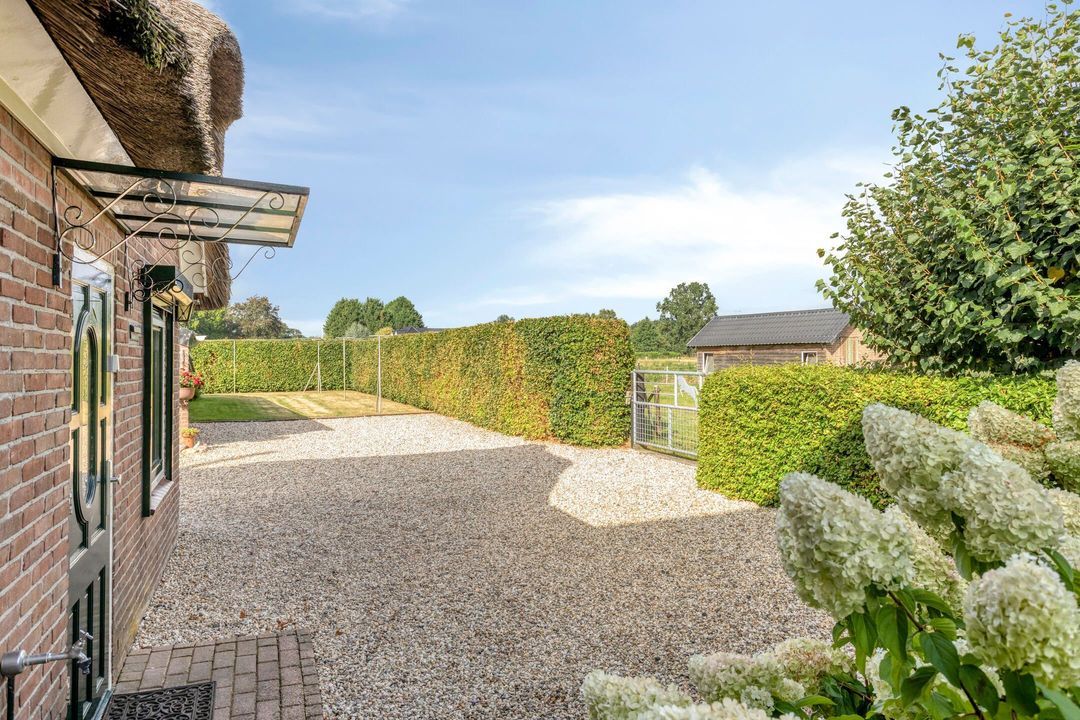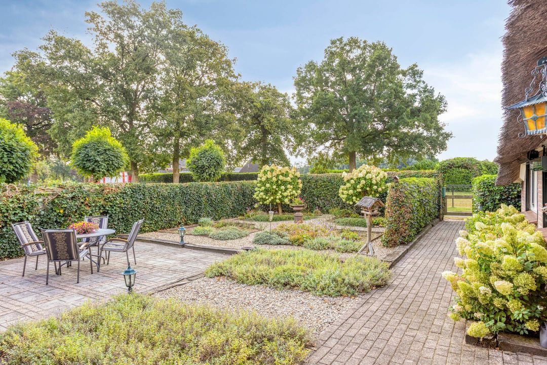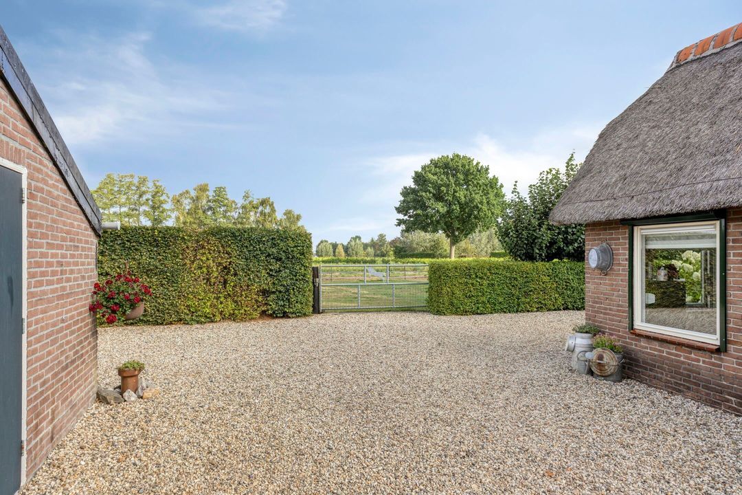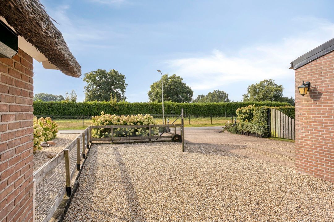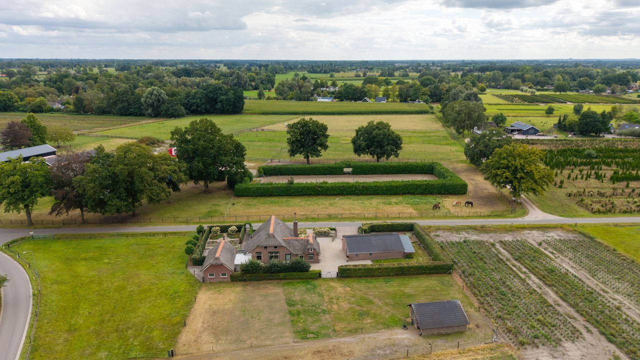 Het perceel beschikt over een rondom verzorgde tuin, inclusief een zonneterras aan de zijkant van de tuin. Daarnaast is er een royale oprit met ruimte voor meerdere auto’s en aan de achterzijde een veranda met prachtig uitzicht over het eigen weiland. Voor het beregenen van de tuin is een grondwaterpomp aanwezig.