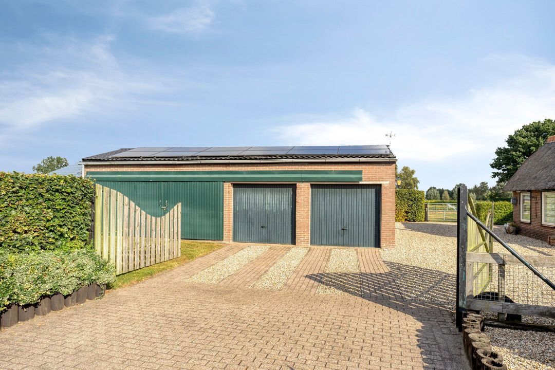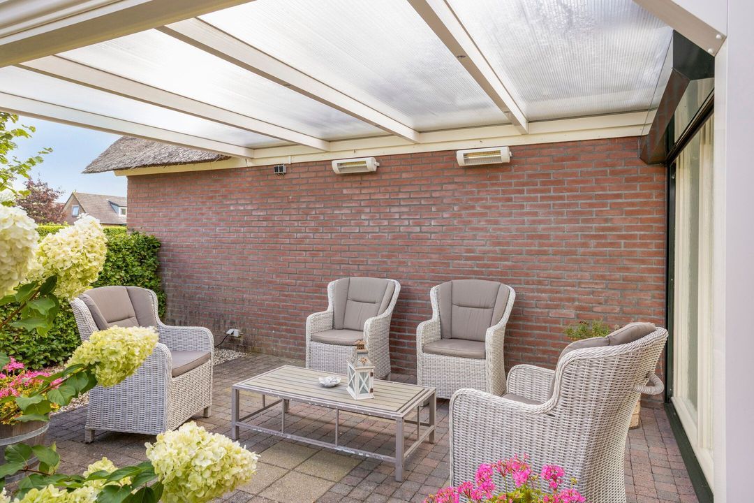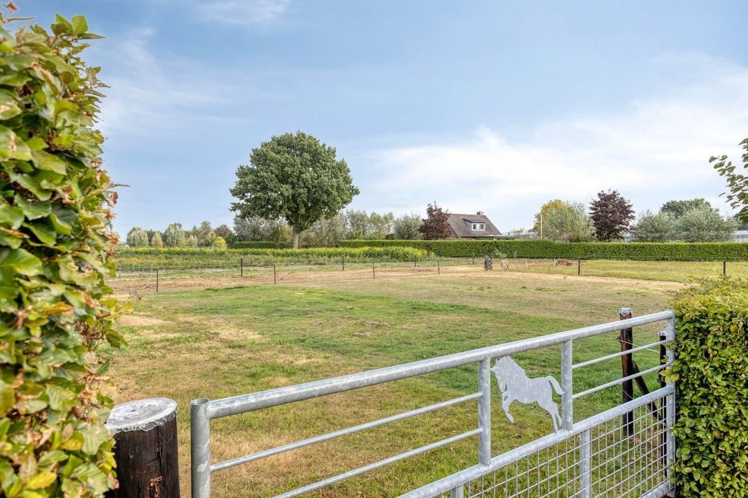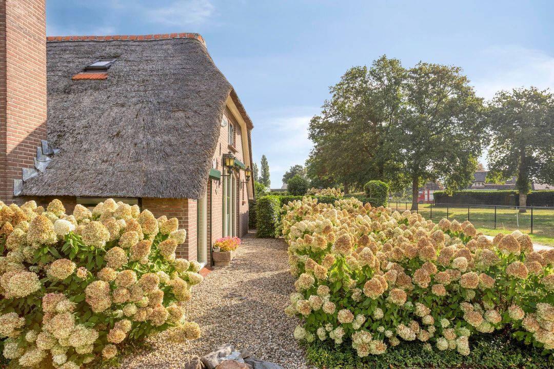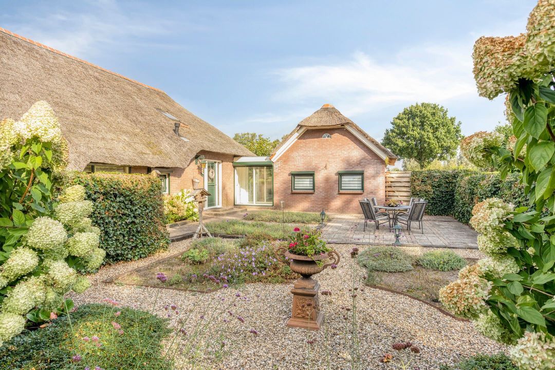 Het perceel beschikt over een rondom verzorgde tuin, inclusief een zonneterras aan de zijkant van de tuin. Daarnaast is er een royale oprit met ruimte voor meerdere auto’s en aan de achterzijde een veranda met prachtig uitzicht over het eigen weiland. Voor het beregenen van de tuin is een grondwaterpomp aanwezig.