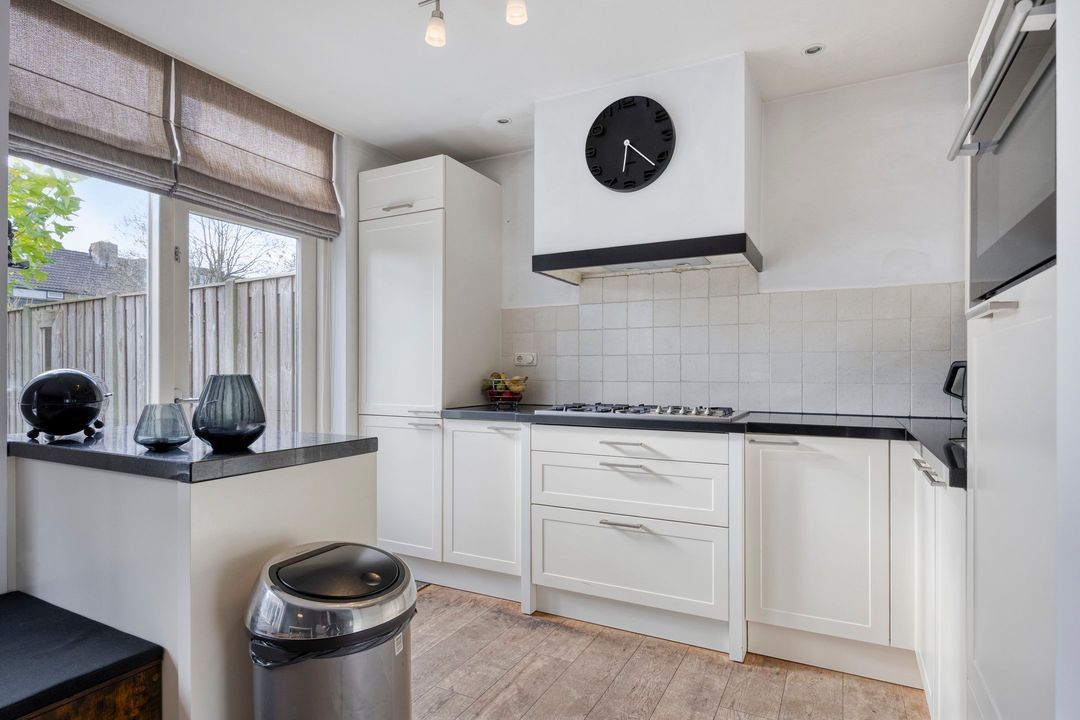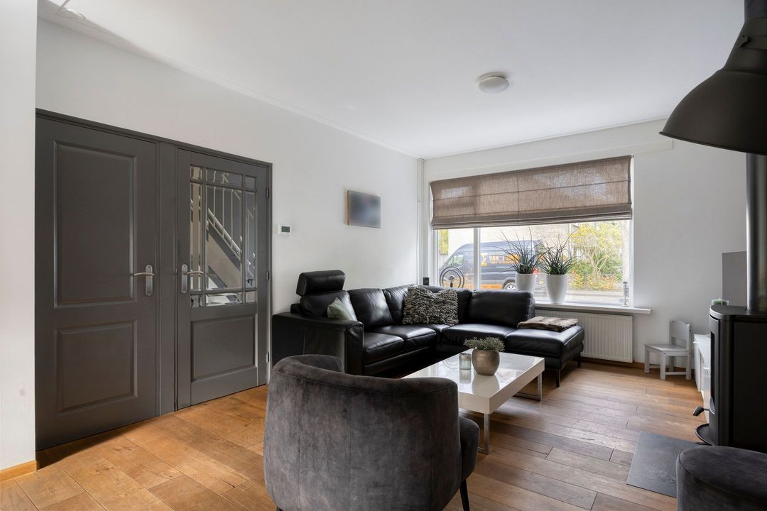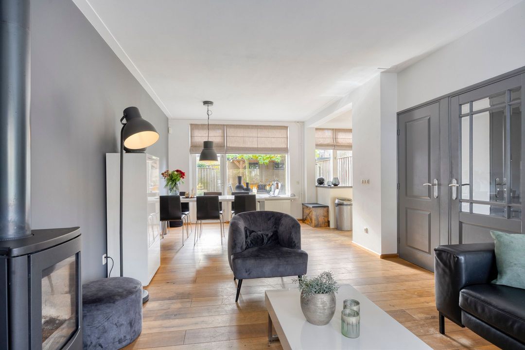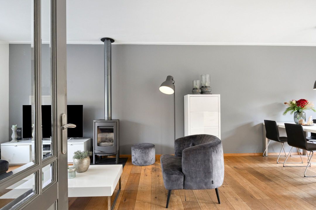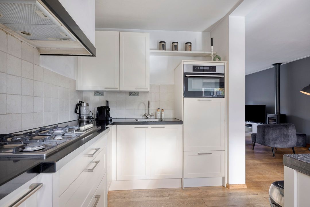 Ruime hal met garderobe, trapopgang en meterkast. Modern toilet met fonteintje. De royale woonkamer is voorzien van een sfeervolle eikenhouten vloer en een houtkachel. Verder is er een handige provisiekast aanwezig. De open keuken is in hoekopstelling en is voorzien van diverse inbouwapparatuur en een tuindeur naar de achtertuin.