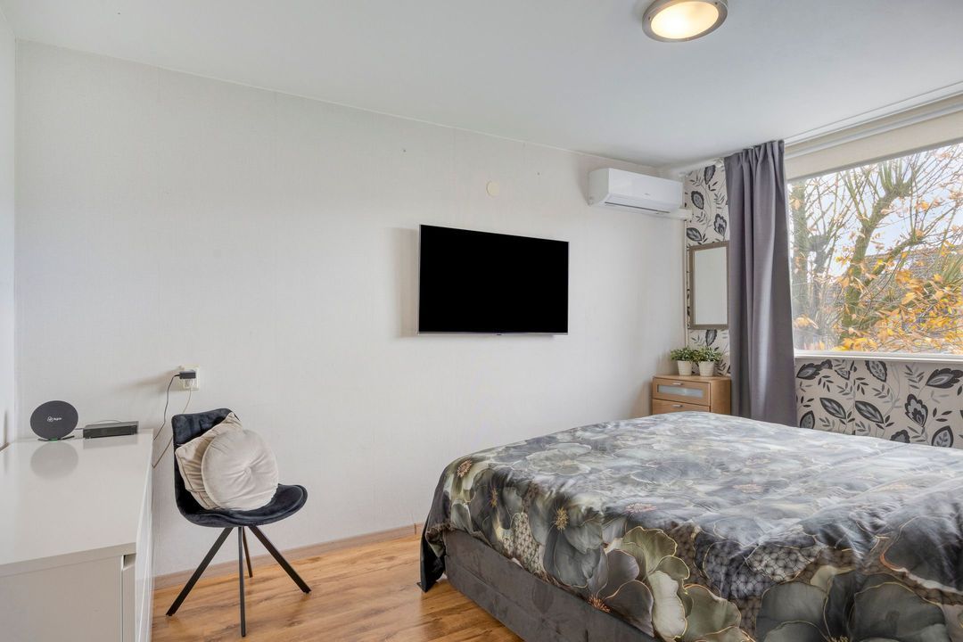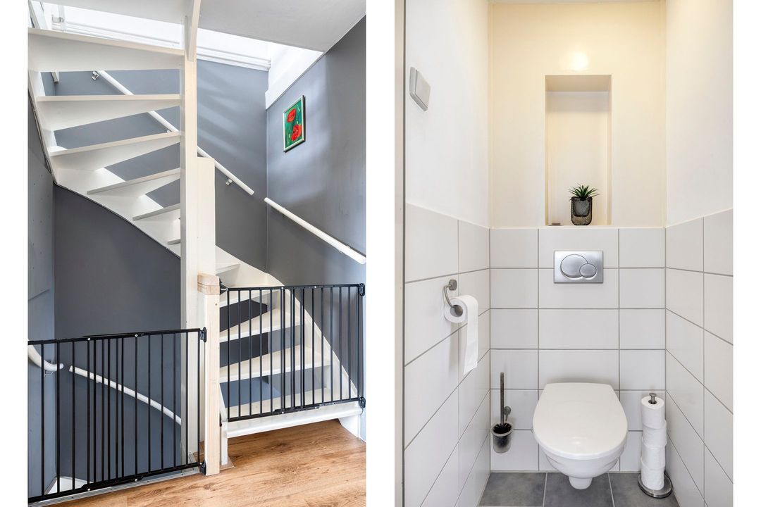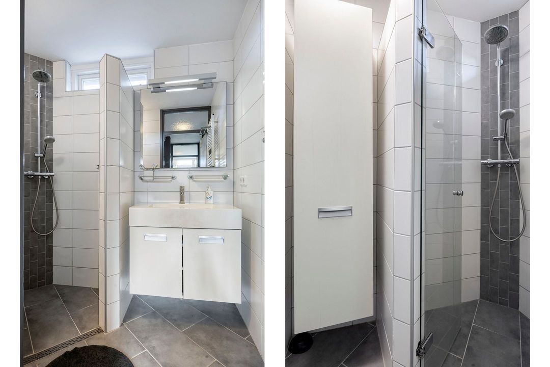 Overloop met modern toilet, drie ruime slaapkamers, waarvan één met airconditioning en één met kastenwand. Allen voorzien van een laminaatvloer. Lichte badkamer voorzien van een inloopdouche en wastafel.