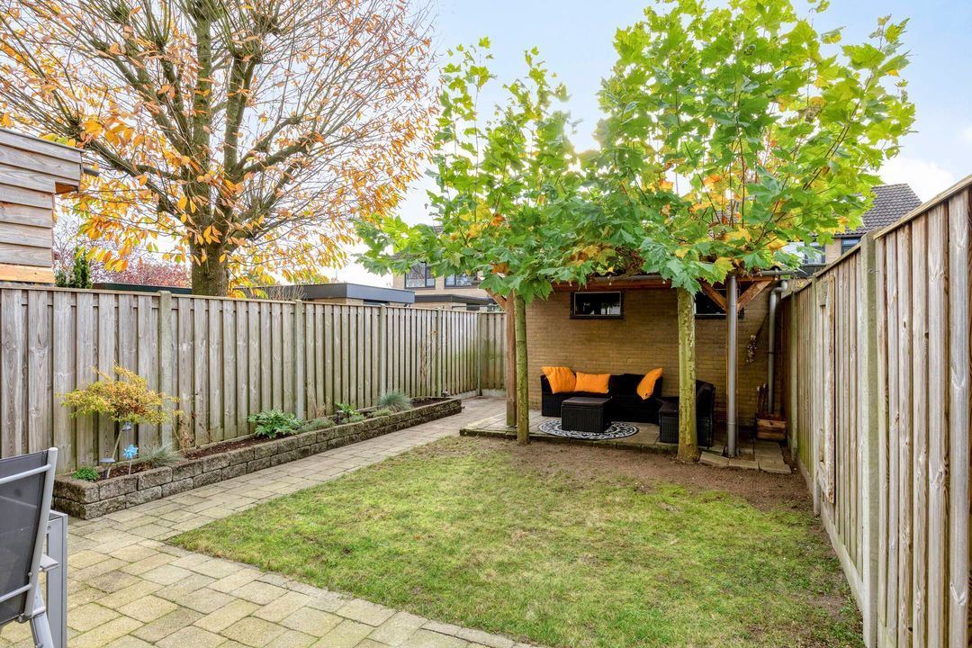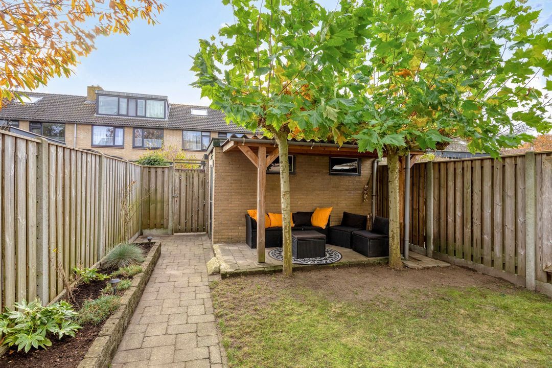 De diepe achtertuin, gelegen op het zuiden, biedt volop zon en privacy. Hier vindt u een ruim terras met elektrisch bedienbaar zonnescherm, een gazon en een overkapping waar u heerlijk beschut kunt zitten. Achter in de tuin staat een vrijstaande stenen berging en een achteruitgang.