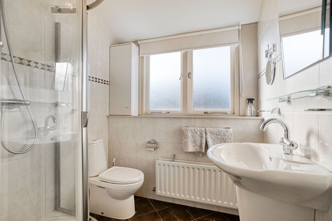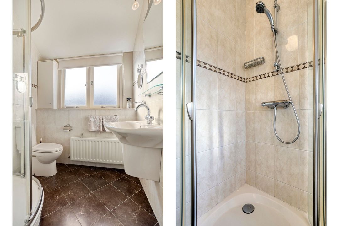 De overloop geeft toegang tot drie slaapkamers en een complete badkamer voorzien van douche, vaste wastafel en toilet.