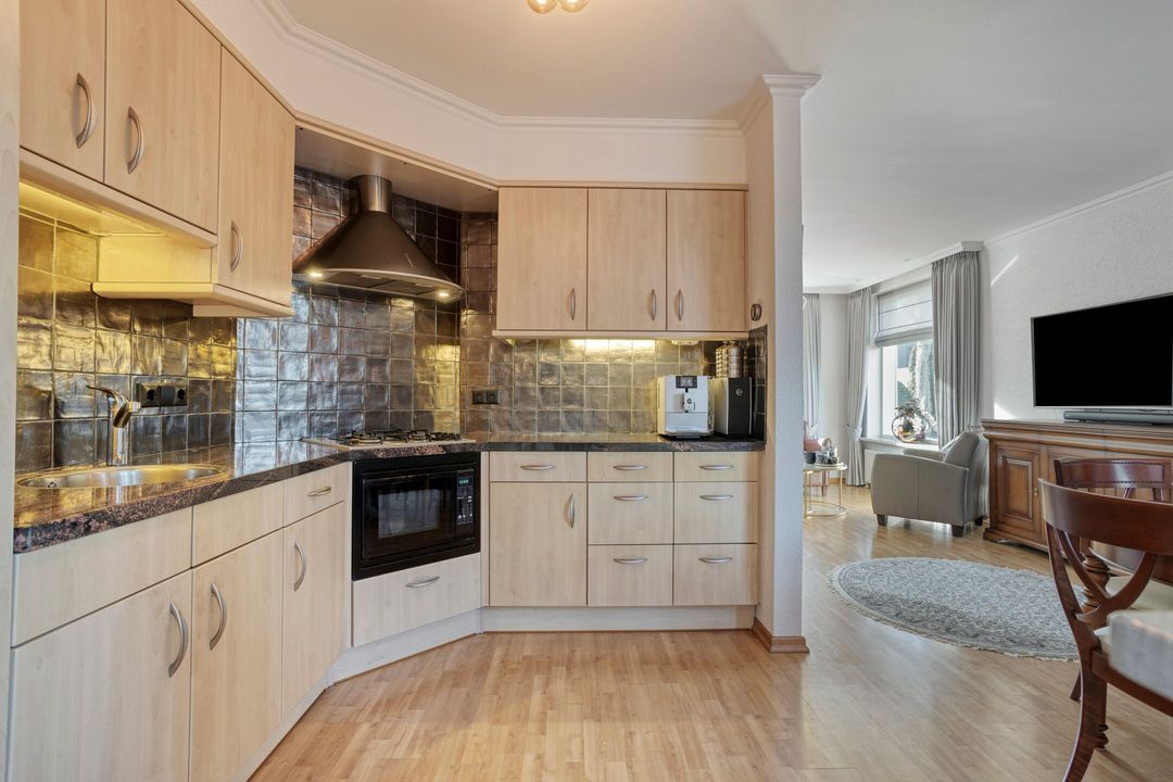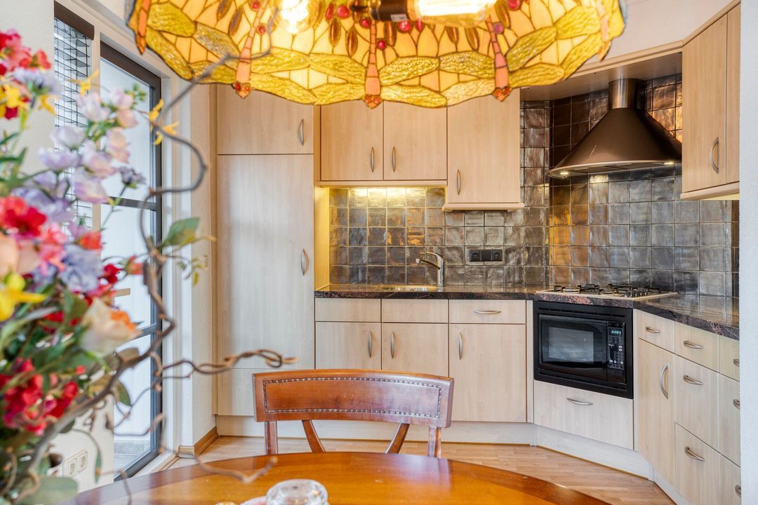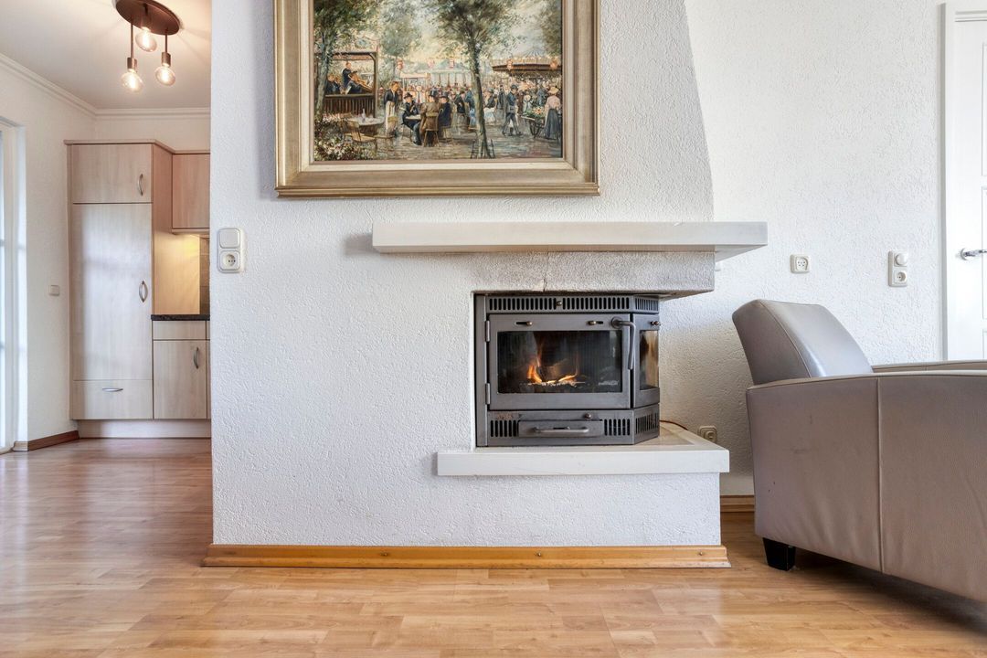 Via de entree komt u in de hal met meterkast en toegang tot de kelder. De woonkamer is sfeervol en licht, met als blikvanger de gezellige open haard. De open keuken is uitgevoerd in een moderne hoekopstelling met natuurstenen werkblad en diverse inbouwapparatuur, waaronder een koelkast, combimagnetron, 4-pits gaskookplaat en afzuigkap.
