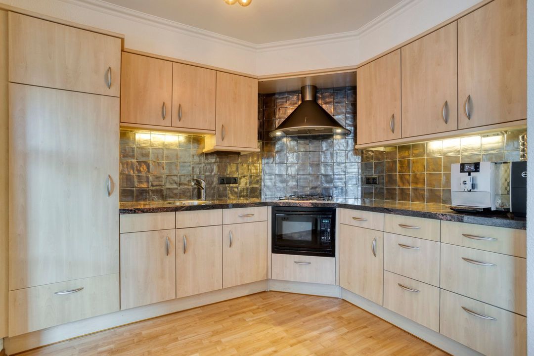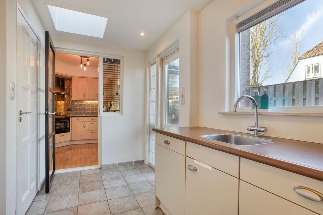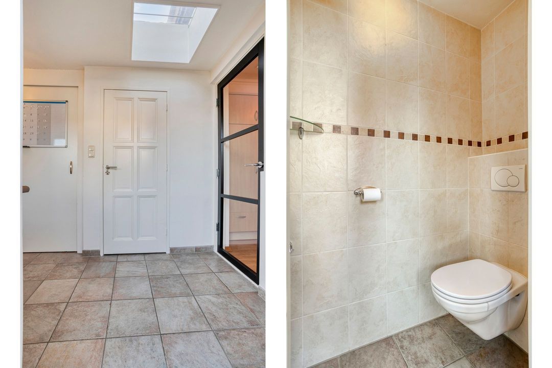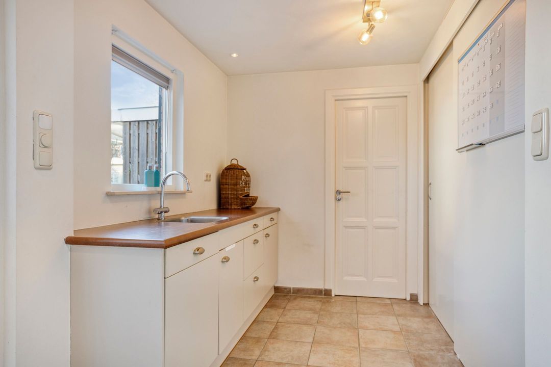 Aansluitend bevindt zich de royale bijkeuken met aanrechtblok en vaatwasser en aansluitingen voor wasapparatuur. Tevens vindt u hier het toilet en toegang tot een praktische berging.