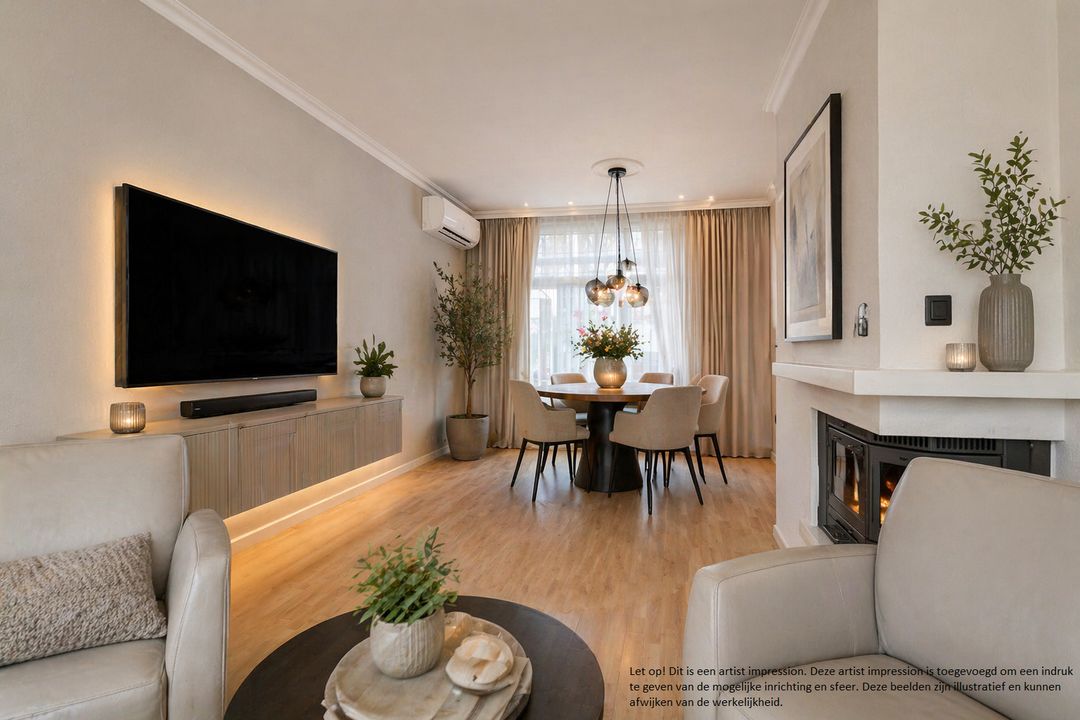Via de entree komt u in de hal met meterkast en toegang tot de kelder. De woonkamer is sfeervol en licht, met als blikvanger de gezellige open haard. De open keuken is uitgevoerd in een moderne hoekopstelling met natuurstenen werkblad en diverse inbouwapparatuur, waaronder een koelkast, combimagnetron, 4-pits gaskookplaat en afzuigkap.