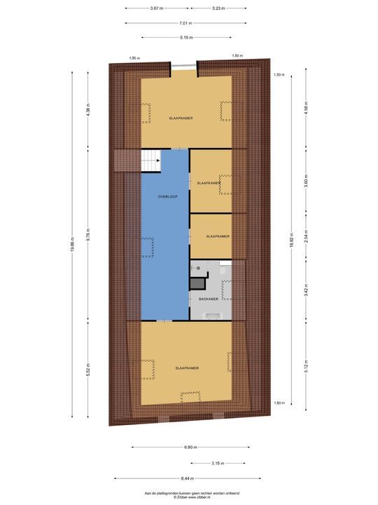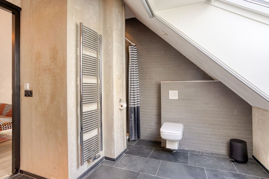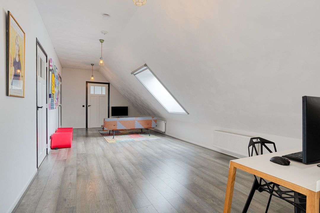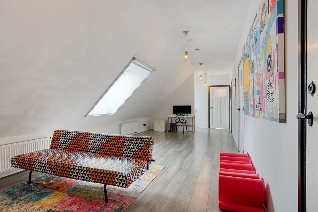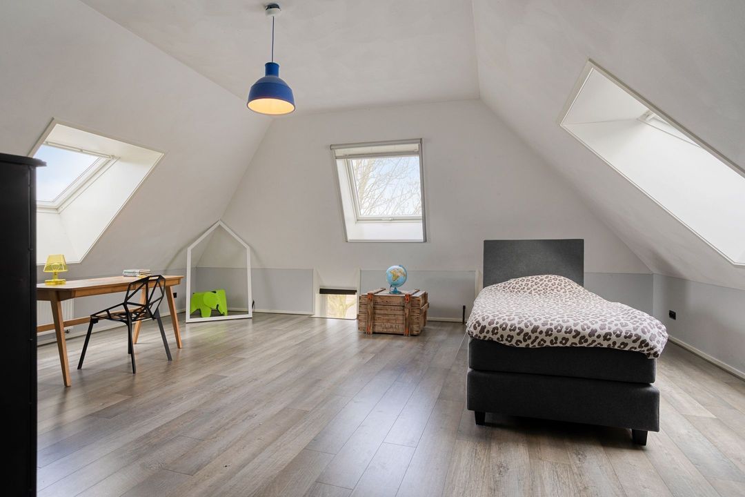 Via een robuuste betonnen trap bereikt u de eerste verdieping, waar een royale overloop u verwelkomt. Deze verdieping beschikt over drie comfortabele slaapkamers, elk voorzien van dakramen die een prachtig uitzicht bieden over het omliggende landschap. Tevens bevindt zich op de overloop een stortkoker voor de was. Praktisch!