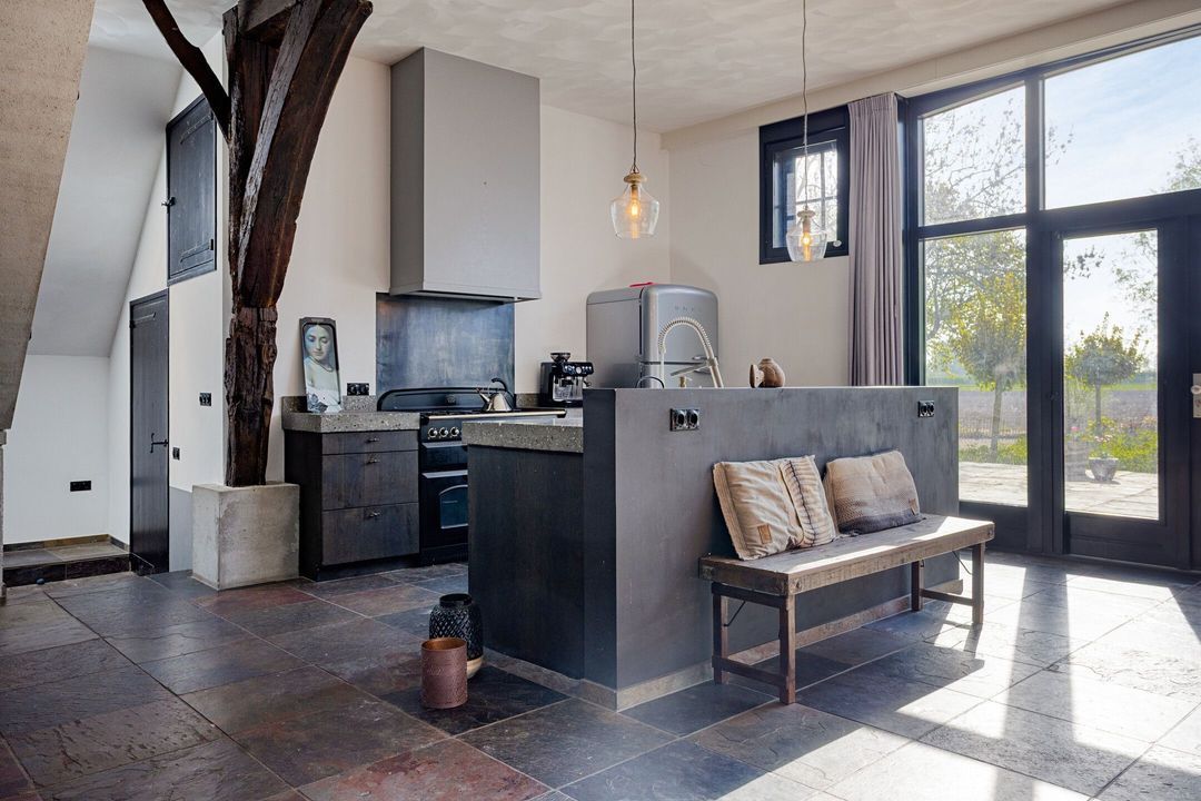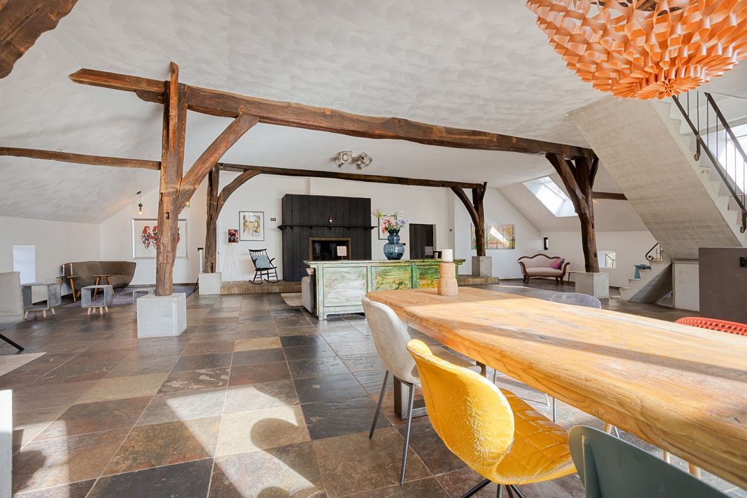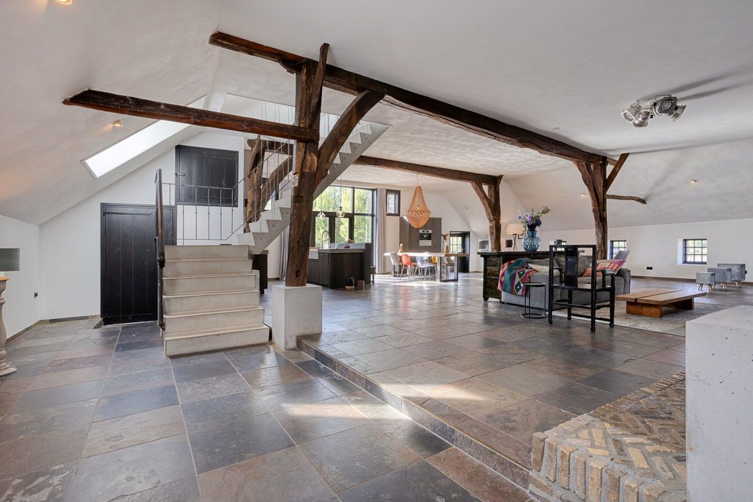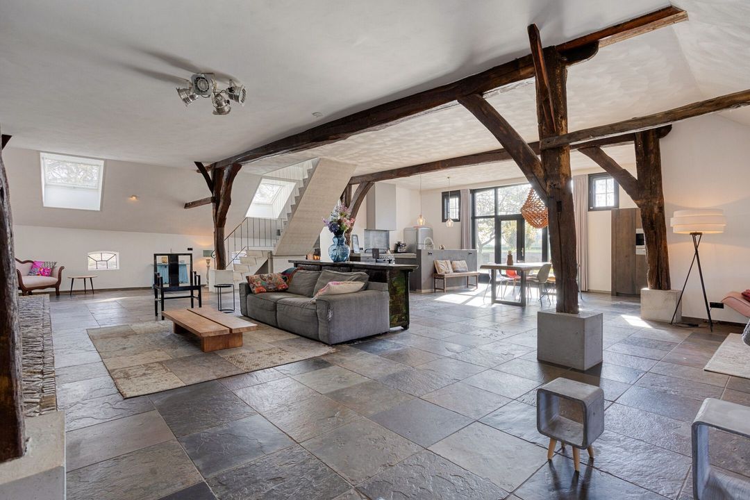 Bij binnenkomst wordt u verwelkomd in een ruime hal met garderobe, die toegang biedt tot de voormalige deel, het hart van de woning. Hier is een indrukwekkende living gerealiseerd, waar ruimte en sfeer samenkomen. De royale zithoek, eethoek en vrijstaande keuken met hoogwaardige inbouwapparatuur en een imposante fornuiscombinatie vormen samen een uitnodigende leefruimte, geschikt voor zowel intieme momenten als het ontvangen van grotere gezelschappen.