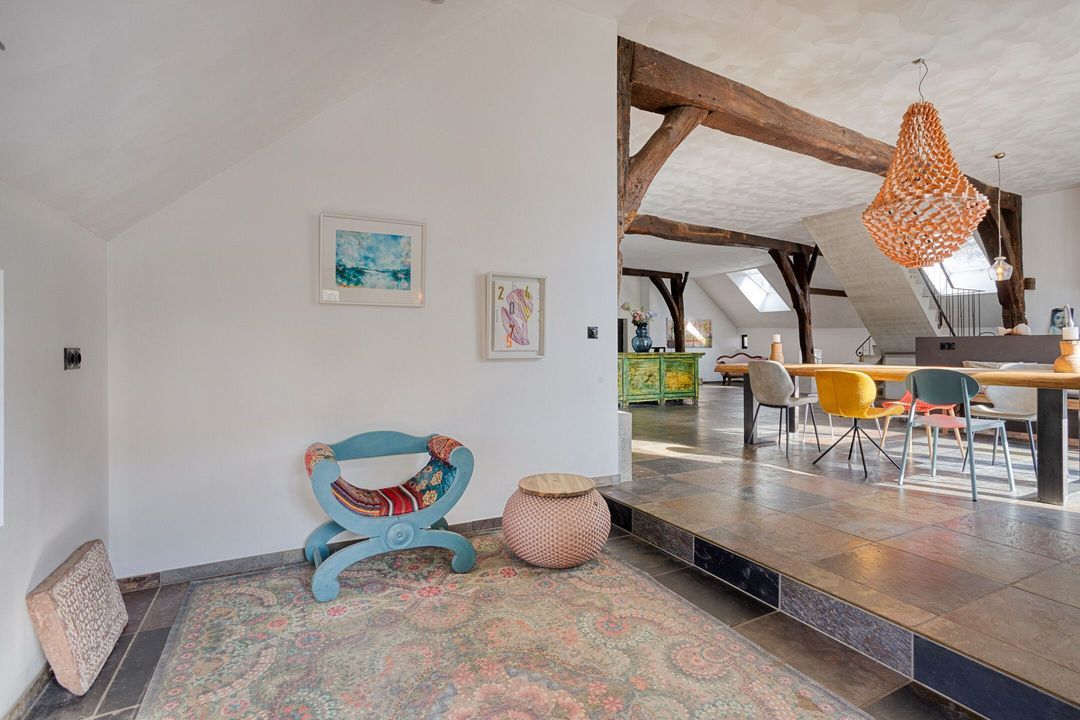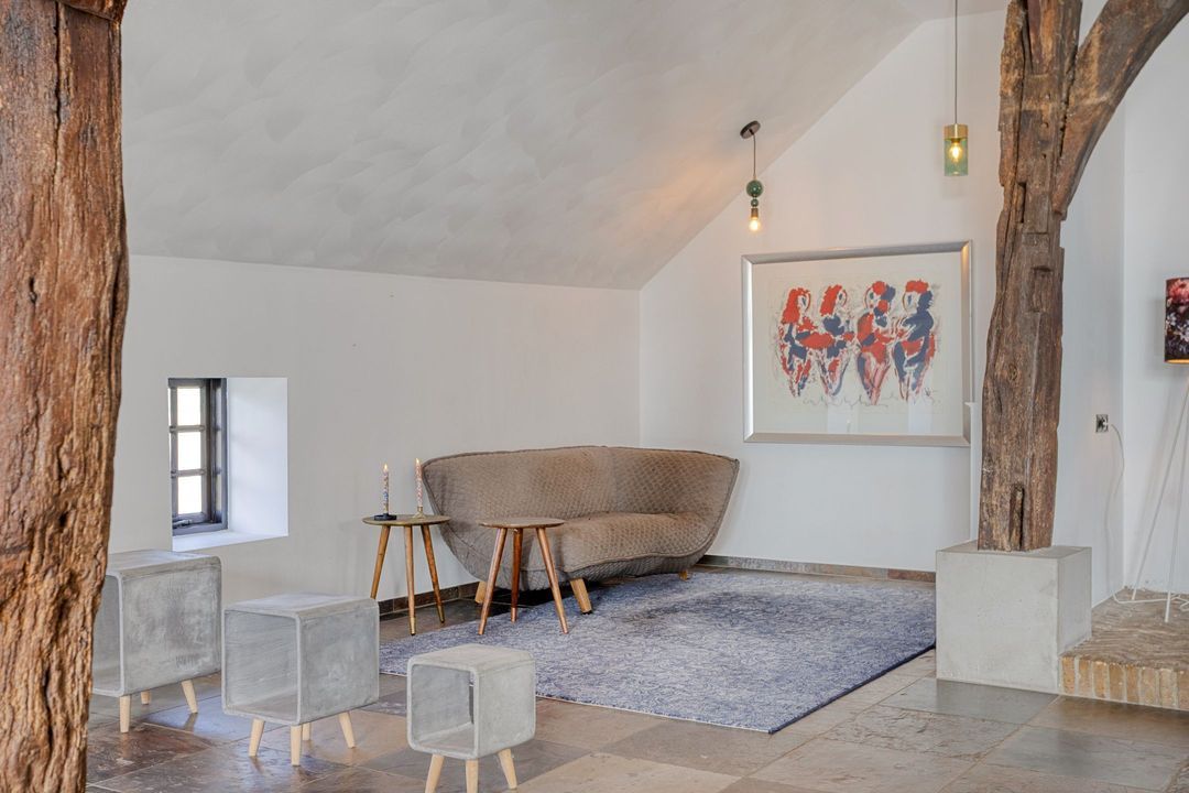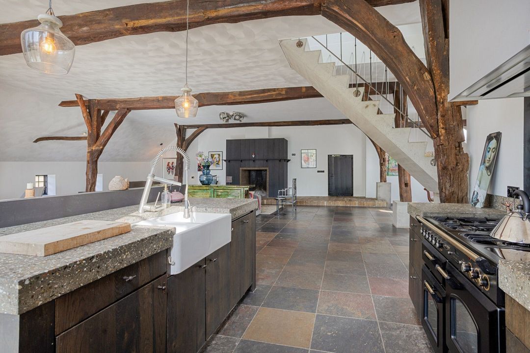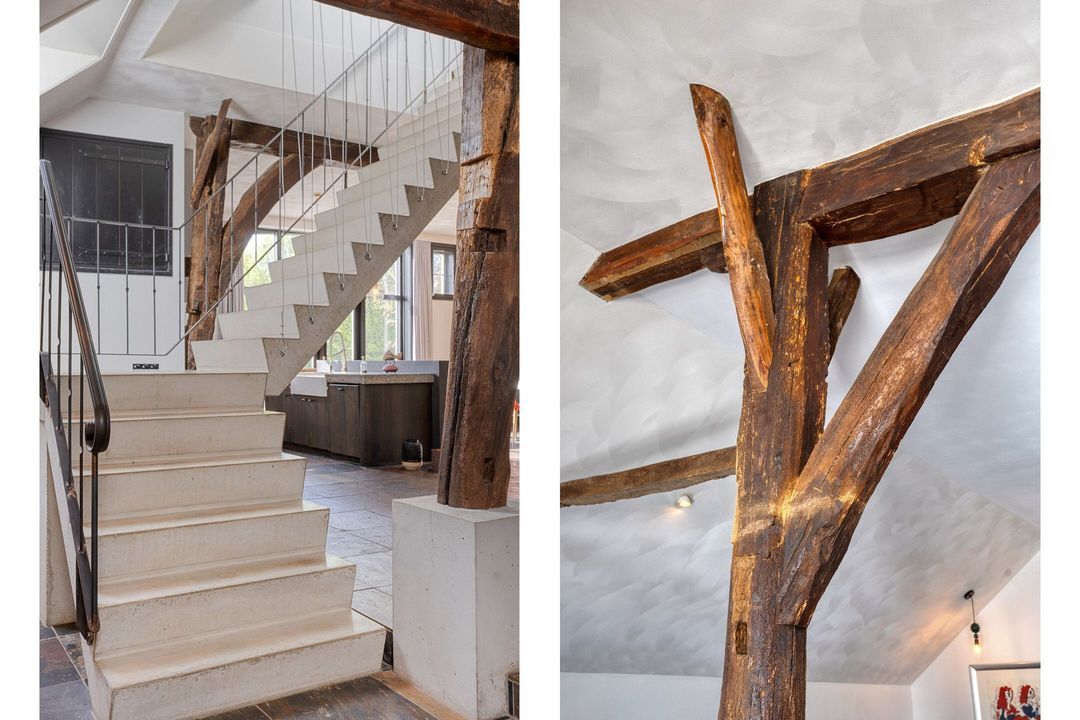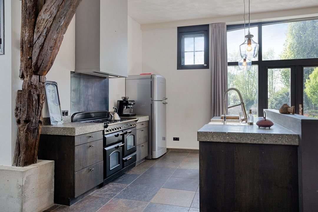 Bij binnenkomst wordt u verwelkomd in een ruime hal met garderobe, die toegang biedt tot de voormalige deel, het hart van de woning. Hier is een indrukwekkende living gerealiseerd, waar ruimte en sfeer samenkomen. De royale zithoek, eethoek en vrijstaande keuken met hoogwaardige inbouwapparatuur en een imposante fornuiscombinatie vormen samen een uitnodigende leefruimte, geschikt voor zowel intieme momenten als het ontvangen van grotere gezelschappen.