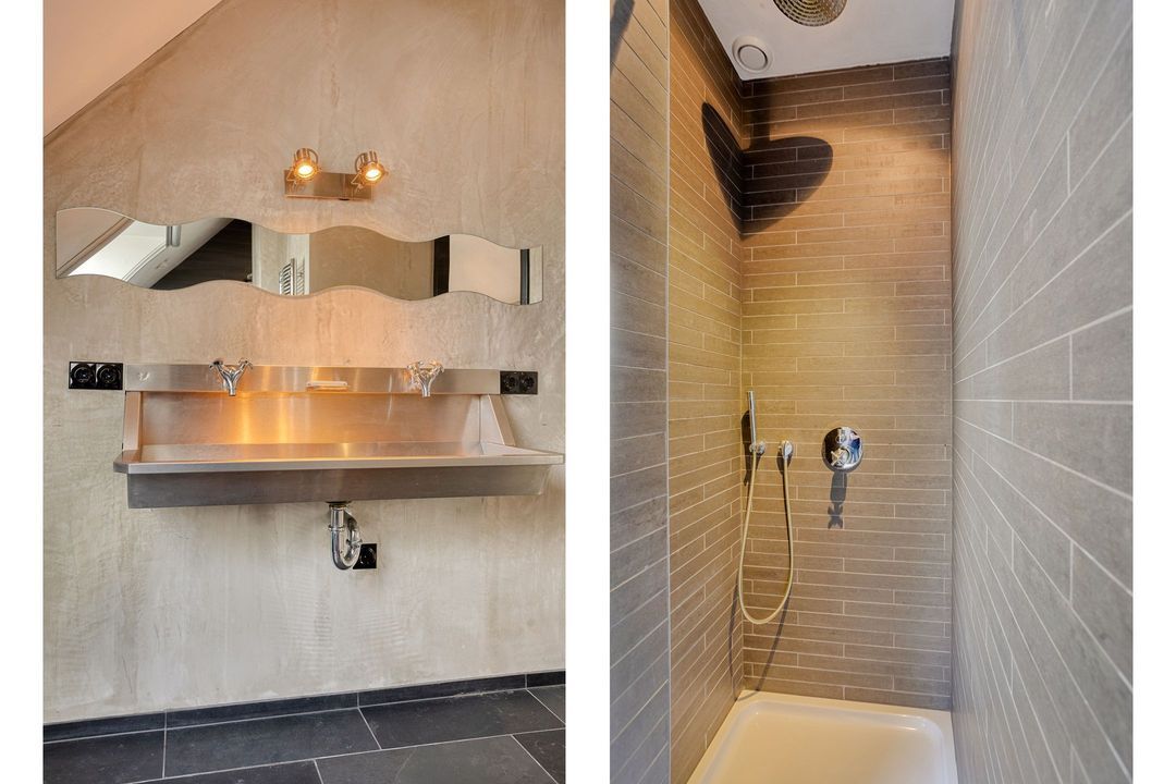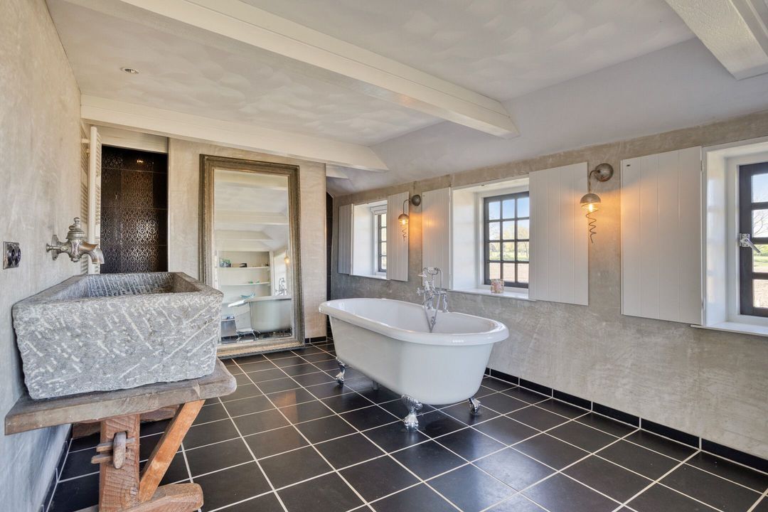 De tweede badkamer is compleet ingericht met een dubbele wastafel, douche en een derde toilet. Daarnaast is er een praktische bergruimte aanwezig. Ook hier ervaart u de rust, ruimte en het bijzondere licht dat deze woonboerderij zo kenmerkt.