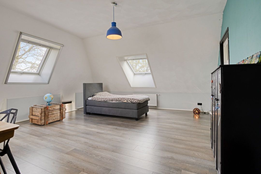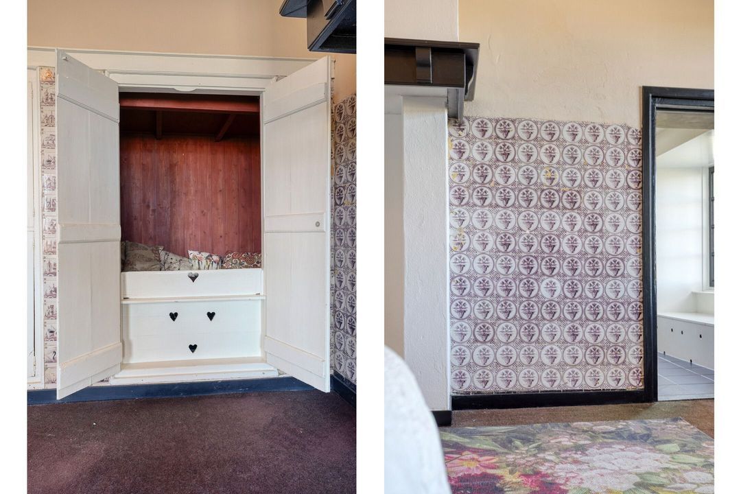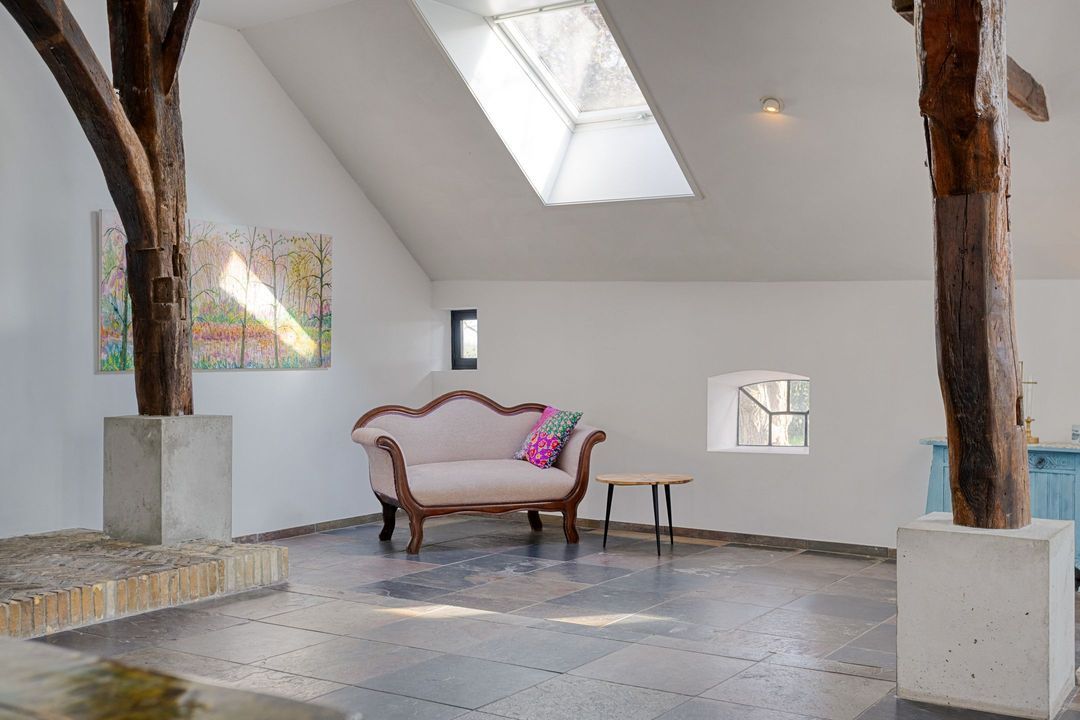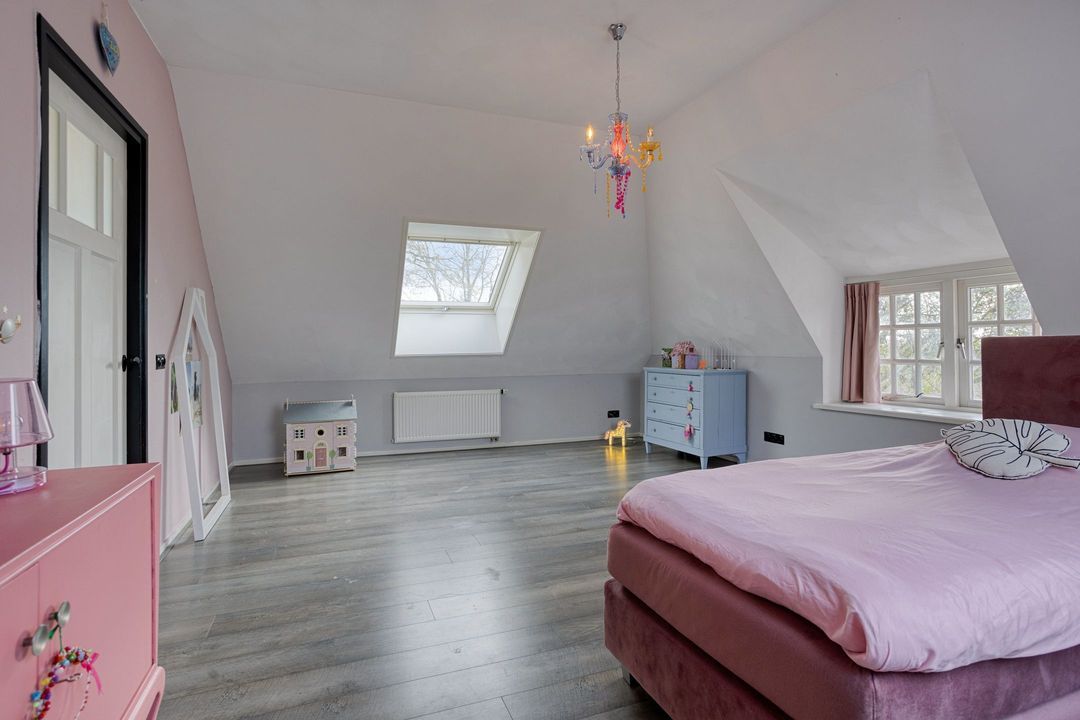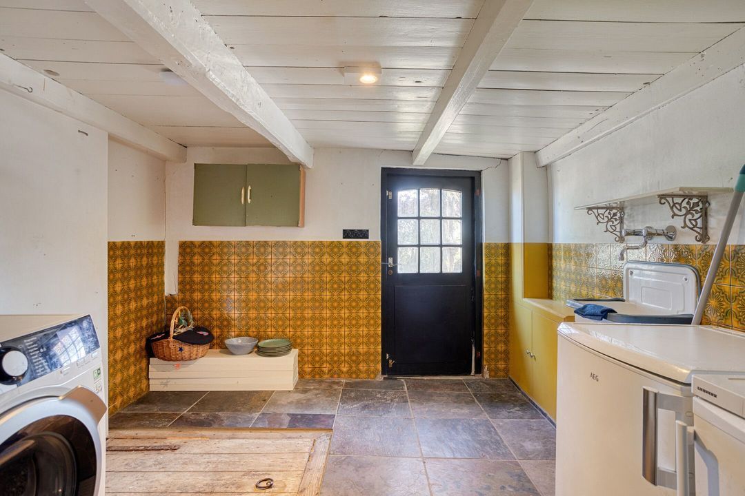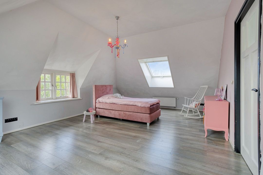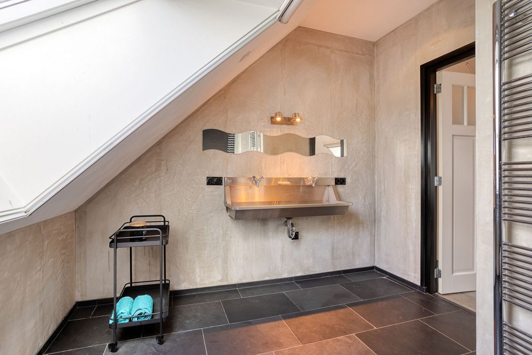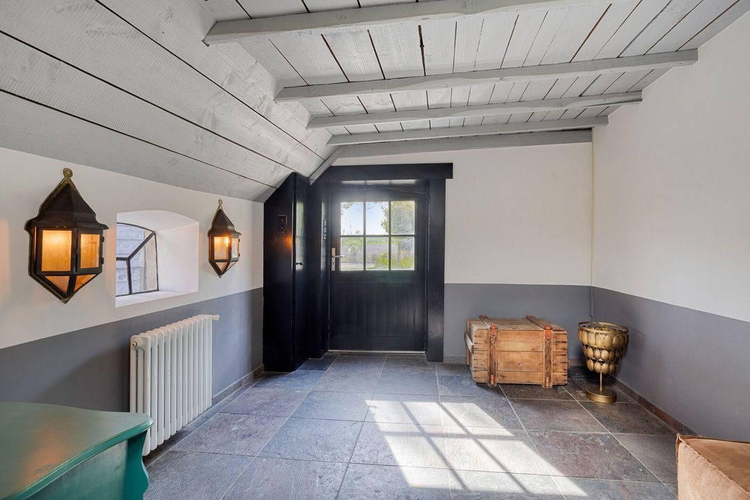 De natuurstenen vloer en de robuuste schouw, groot genoeg voor een royaal haardvuur, geven de ruimte een warme en authentieke uitstraling. De sfeervolle masterbedroom, voorzien van een authentieke bedstede, biedt directe toegang tot een stijlvolle badkamer met betonnen wastafel, separate douche en vrijstaand ligbad. Daarnaast beschikt de begane grond over een tweede toilet met urinoir, een comfortabele kleedkamer en een praktische bijkeuken met aansluitingen voor wasapparatuur. Tevens zijn er diverse inpandige bergingen aanwezig met opstelling van de CV- ketel en de mechanische ventilatie.