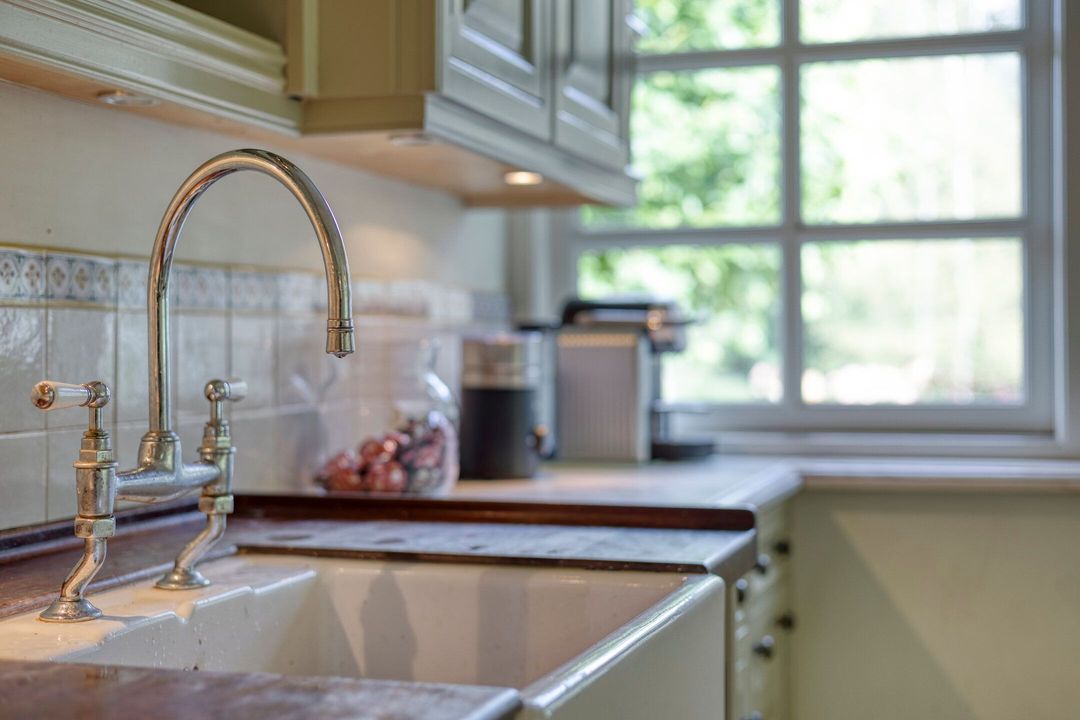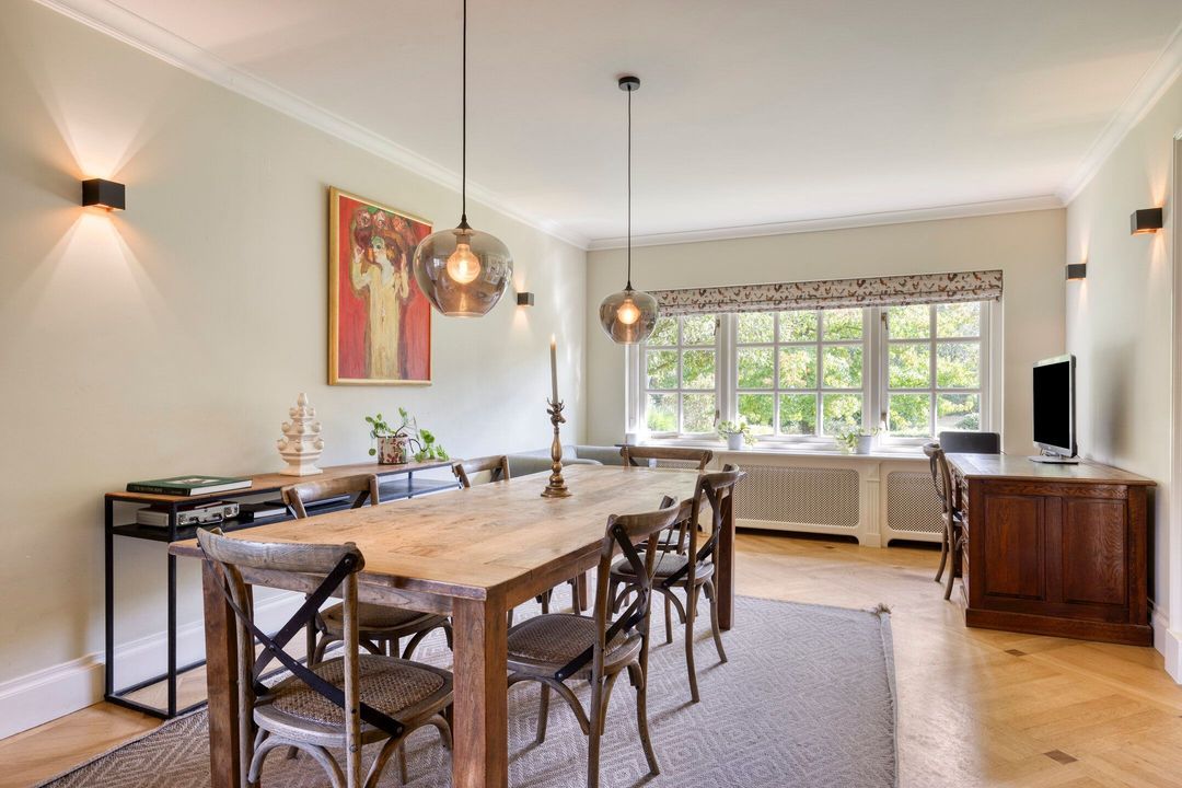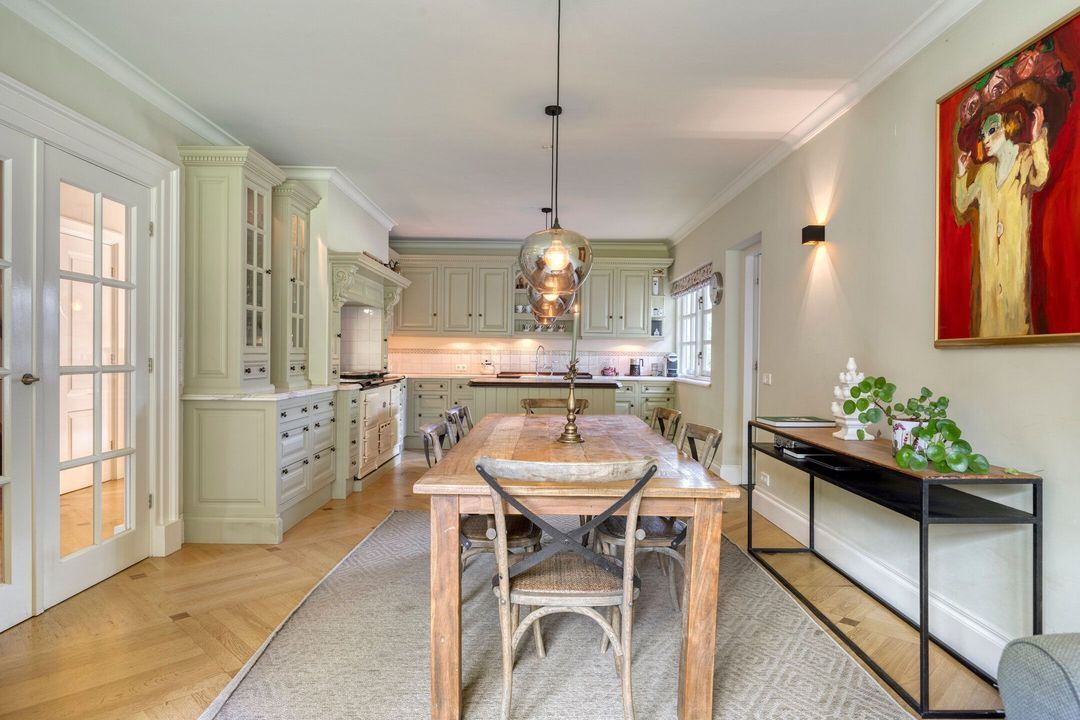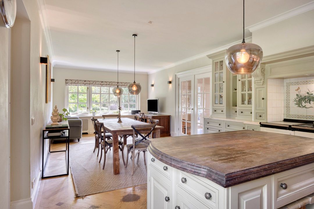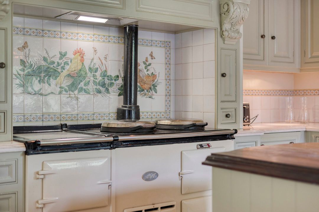 Aan de andere zijde van de hal bevindt zich de gezellige woonkeuken met massief eiken parketvloer en een sfeervolle landelijke uitstraling. De landelijke keuken is voorzien van een Christians inrichting met inbouwapparatuur, waaronder twee koelkasten met lades, een vaatwasser en een karakteristieke Aga Cooker. Deze ruimte nodigt uit tot lange diners en gezellige avonden met familie of vrienden.