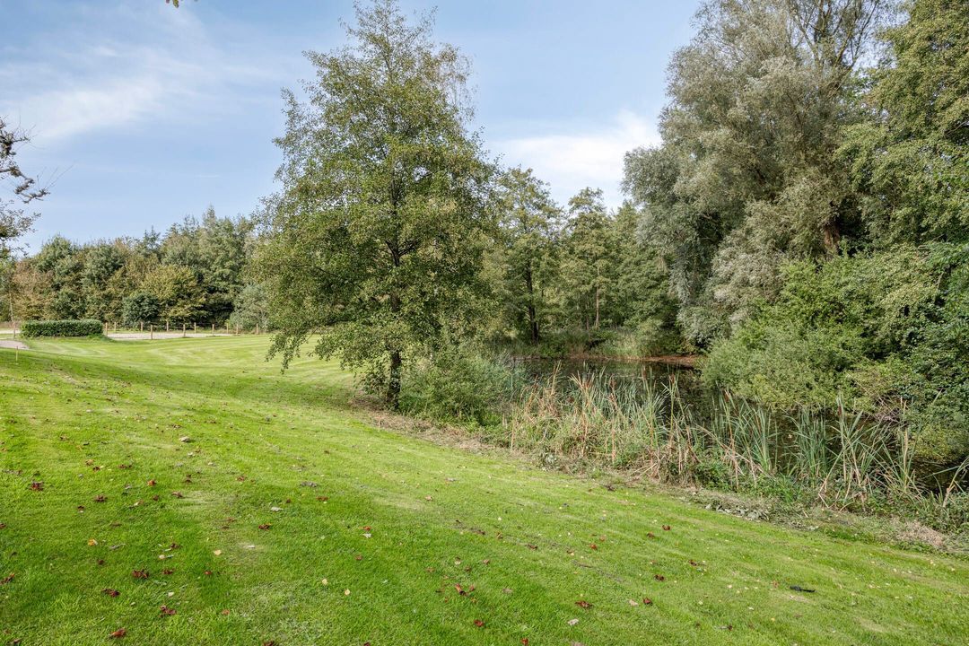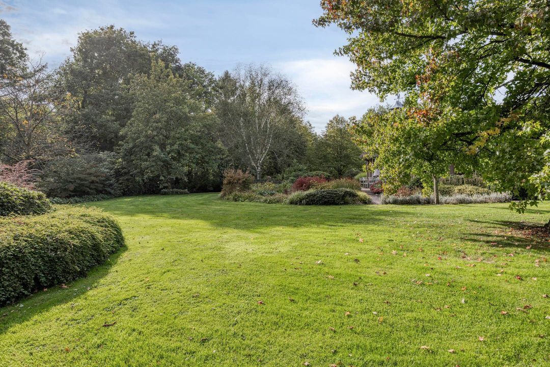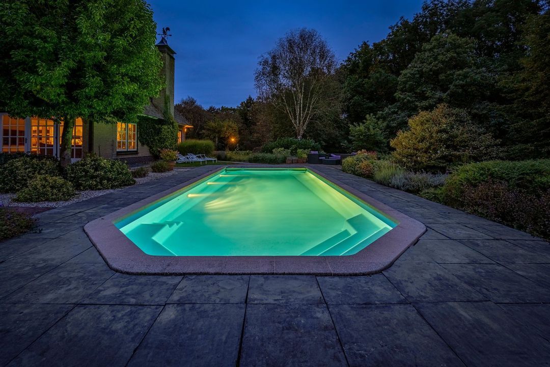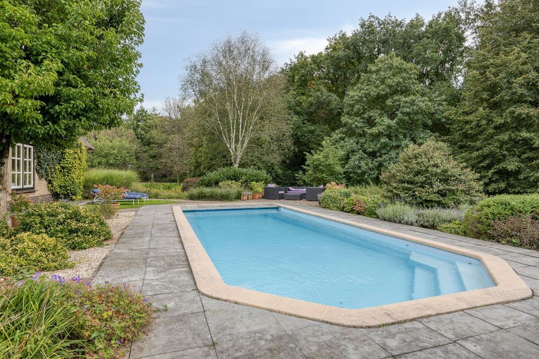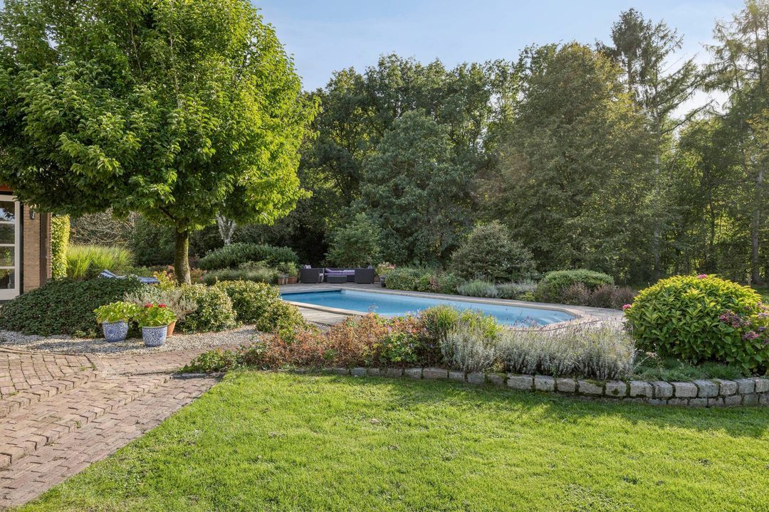 Het buitenleven rond deze woning is al even indrukwekkend. De tuin is fraai aangelegd met gazons, borders, een royale vijver en meerdere terrassen. In de tuin ligt een verwarmd zwembad van 11 bij 4 meter met automatische niveauregeling en moderne installatie.