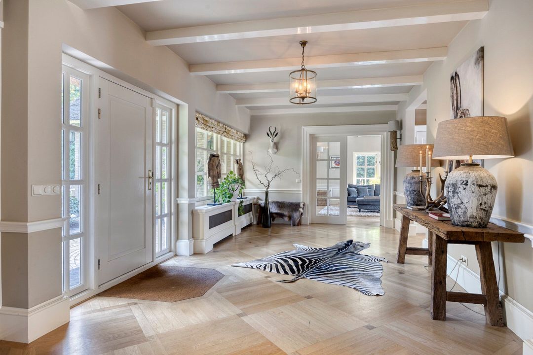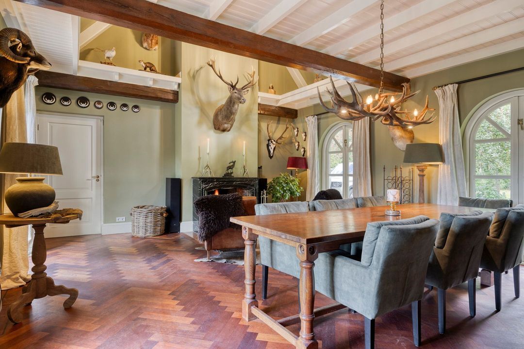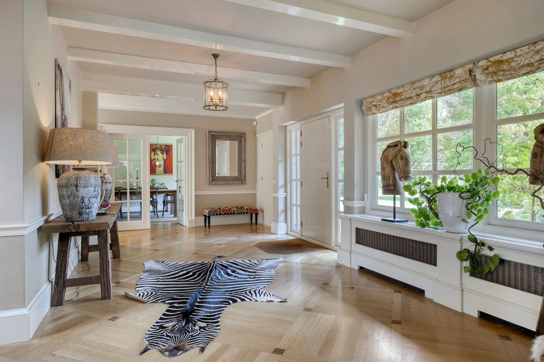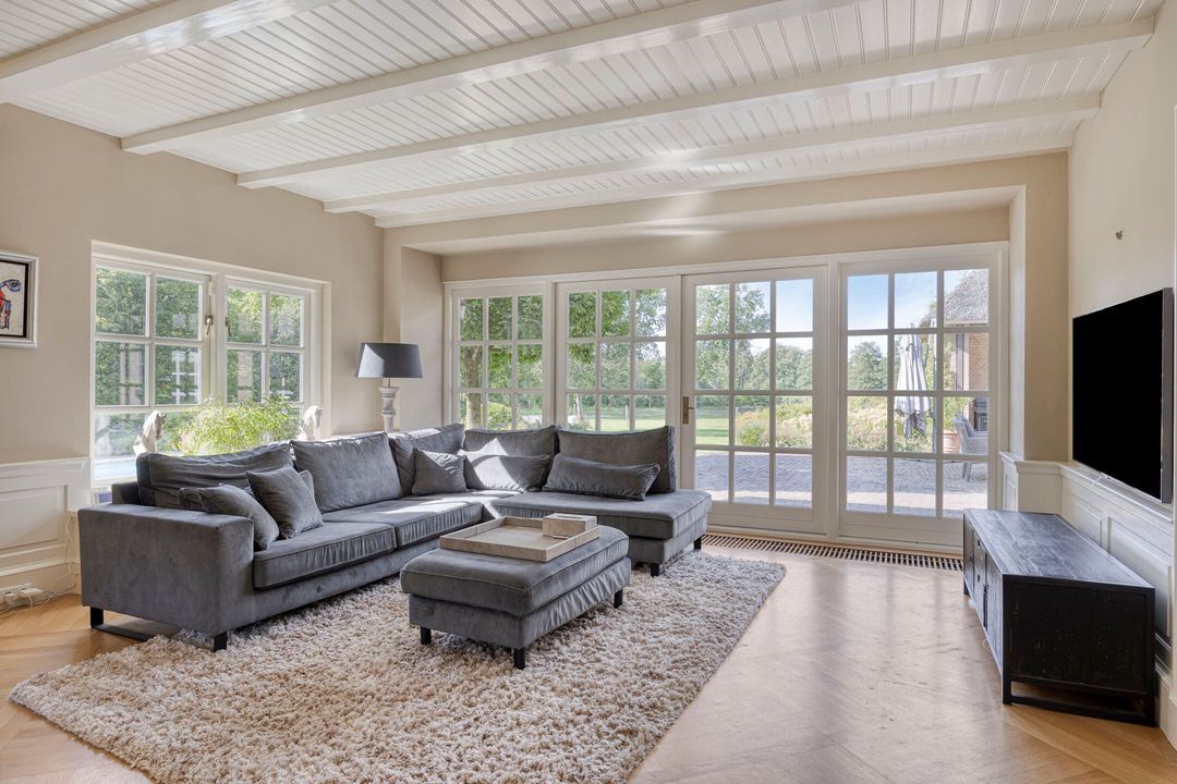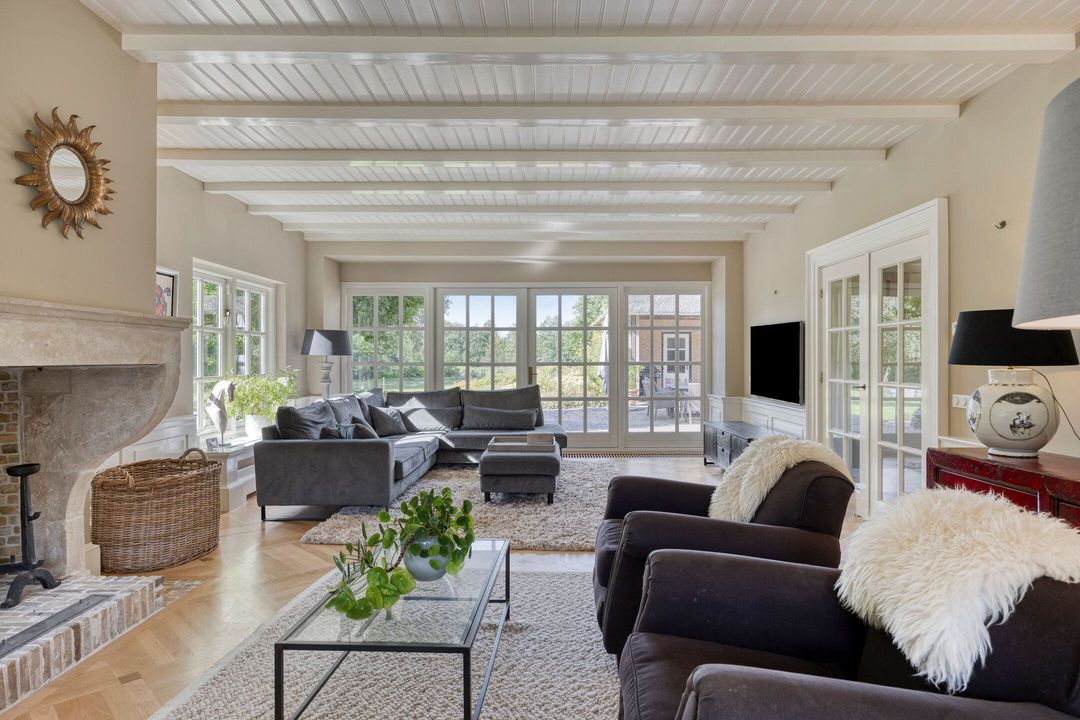 Bij binnenkomst in de woning valt direct de grandeur van de royale hal op. De fraaie eiken parketvloer in blokmotief, ingebouwde garderobekasten en een gastentoilet maken deze entree tot een stijlvol visitekaartje. Vanuit hier betreedt u de ruime living van circa 68 m² met een antieke schouw, open haard en openslaande deuren naar het zonnige terras op het zuidwesten. Het uitzicht over de tuin en omliggende weilanden is ronduit indrukwekkend en geeft direct het gevoel van vrijheid.