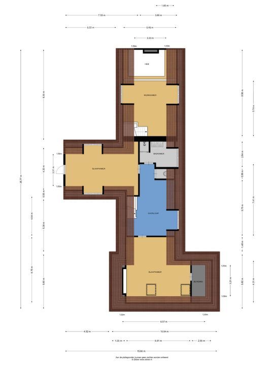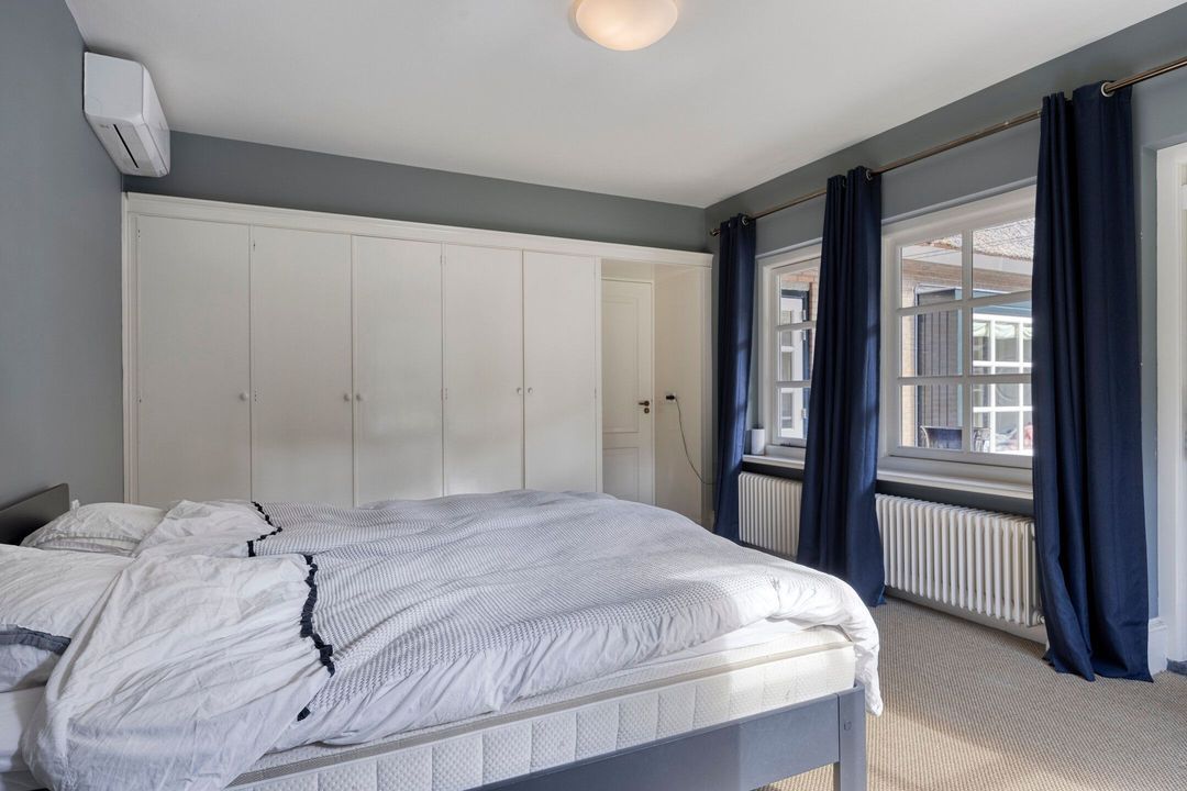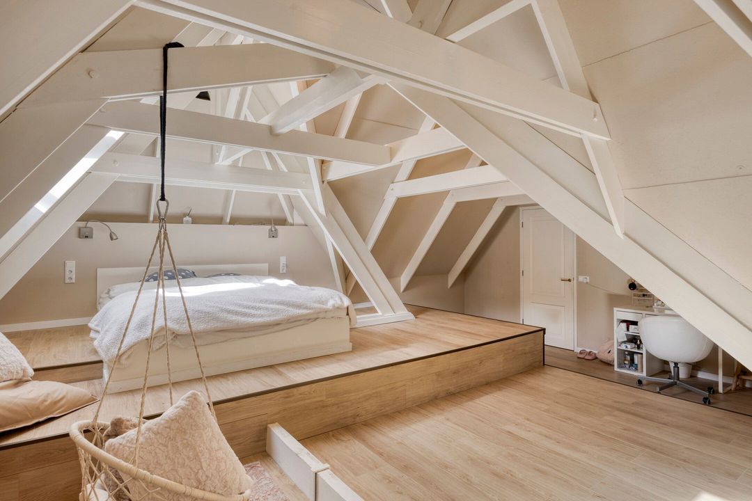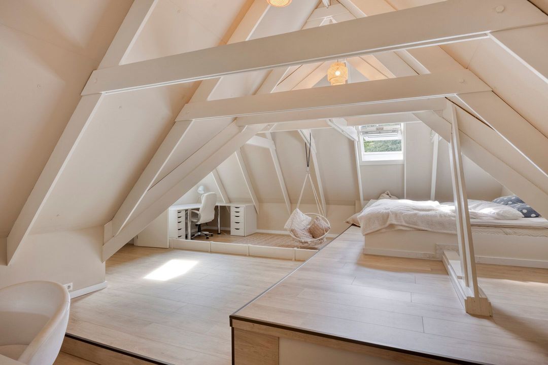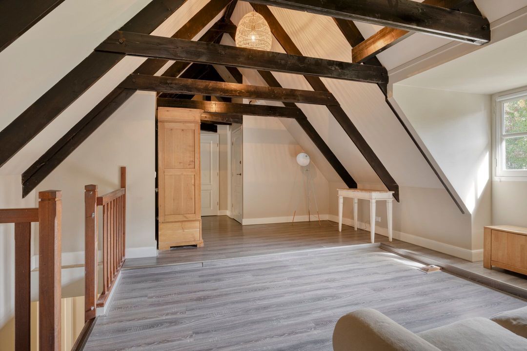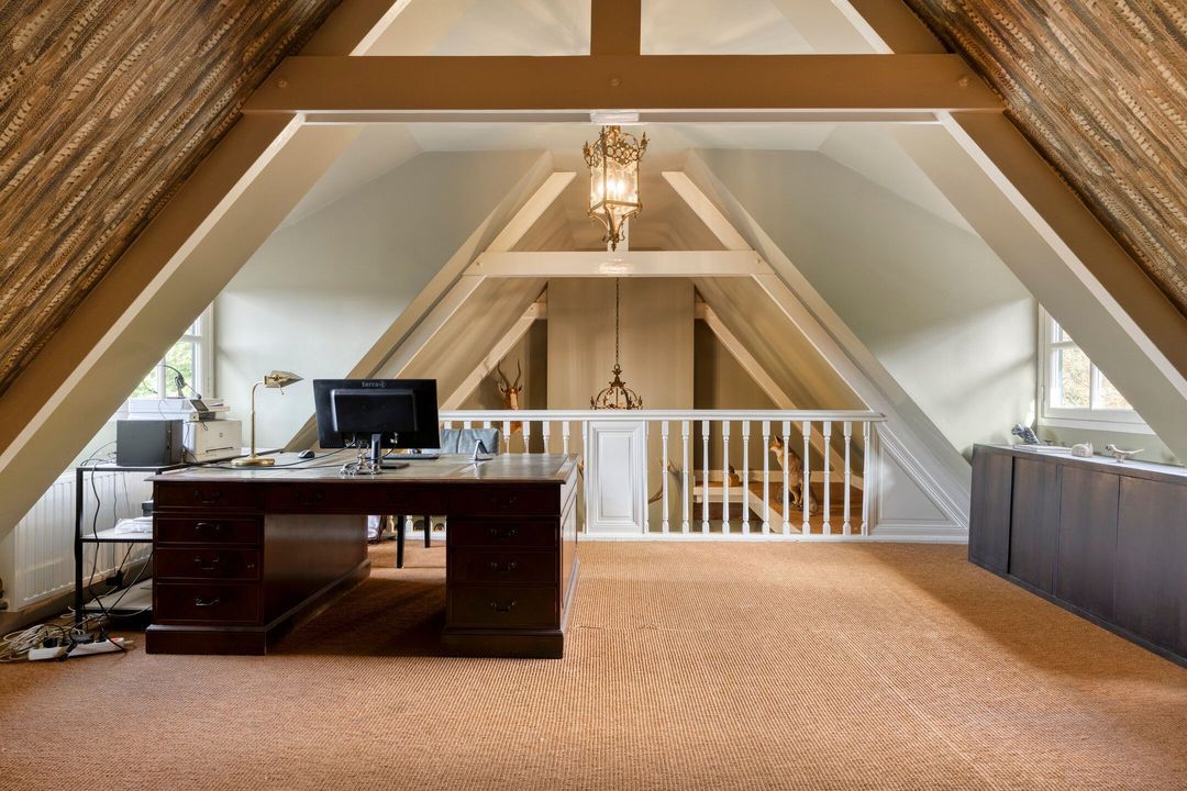 De verdieping van de woning bestaat uit twee vleugels. Aan de zuidzijde bereikt u via de trap in de centrale hal een ruime overloop met dakkapel, twee royale slaapkamers en een derde badkamer met douche en wastafel. Deze verdieping biedt daarnaast volop mogelijkheden om extra kamers te realiseren. De westelijke vleugel, bereikbaar via de trap in de hal bij de woonkeuken, is momenteel ingericht als kantoorruimte en kijkt via de vide uit op de ondergelegen herenkamer.