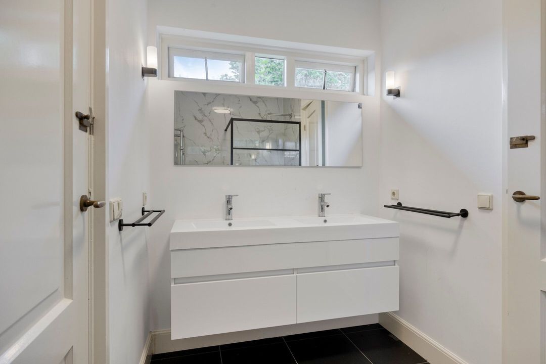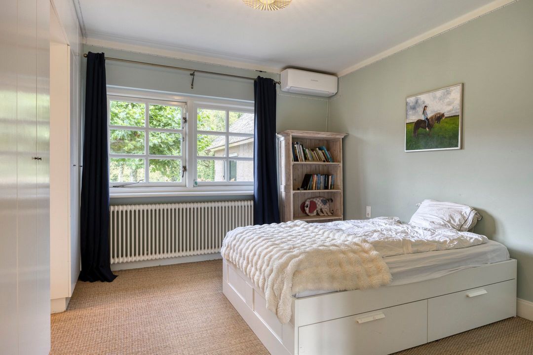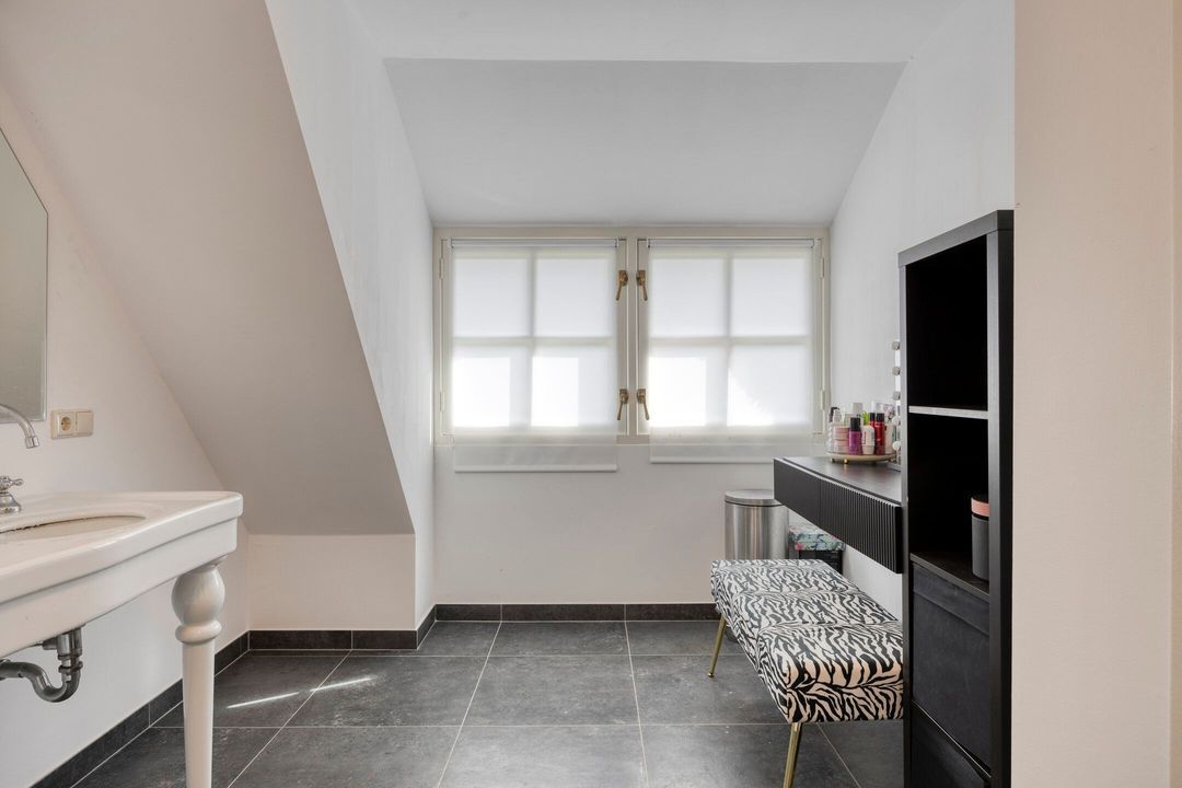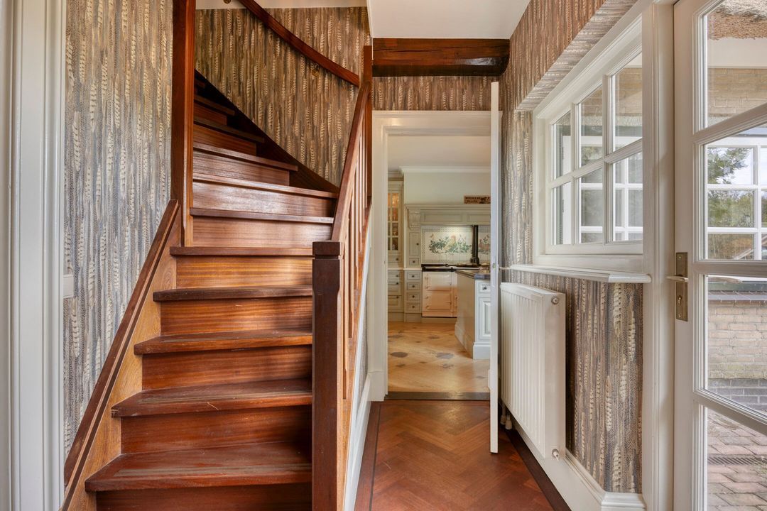 Vanuit de woonkeuken loopt u richting het westelijke deel van het huis, waar zich een tweede hal bevindt met toegang tot het terras aan de noordwestzijde. Hier vindt u ook de praktische bijkeuken met aansluitingen voor wasapparatuur, de trap naar de verdieping en een zeer sfeervolle herenkamer. Deze ruimte is voorzien van parketvloer, een natuurstenen antieke schouw, vide en openslaande deuren naar de tuin. Een ideale plek voor een kantoor, bibliotheek of muziekruimte. Vanuit de herenkamer heeft u toegang tot de inpandige garage met elektrische roldeur en een vlizotrap naar de bergzolder.