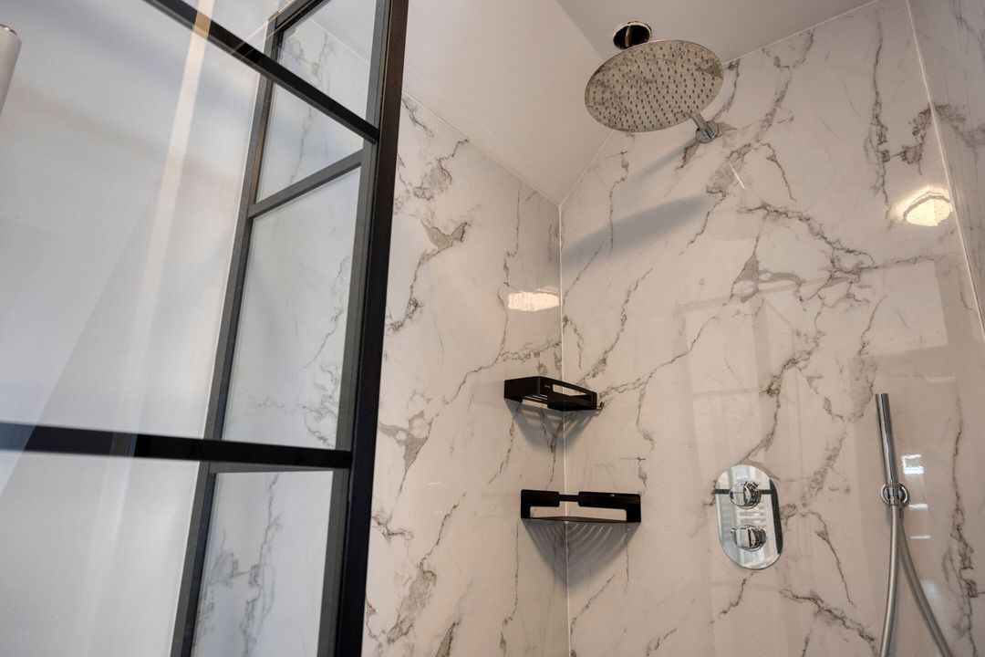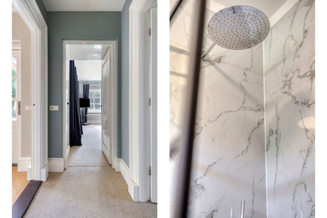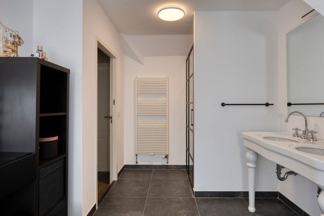 Via een lange gang, eveneens voorzien van eiken parket, bereikt u het zuidelijke slaapgedeelte van de woning. Hier bevinden zich twee slaapkamers met ingebouwde kastenwanden, elk met directe toegang tot een gedeelde badkamer met douche en dubbele wastafel. Eén van de kamers beschikt bovendien over airconditioning. Aan het einde van de gang ligt de master-bedroom, compleet met inloopkasten, airco, eigen toegang tot het terras en een badkamer met vloerverwarming, royale inloopdouche, ligbad, hangend toilet en klassieke radiator.